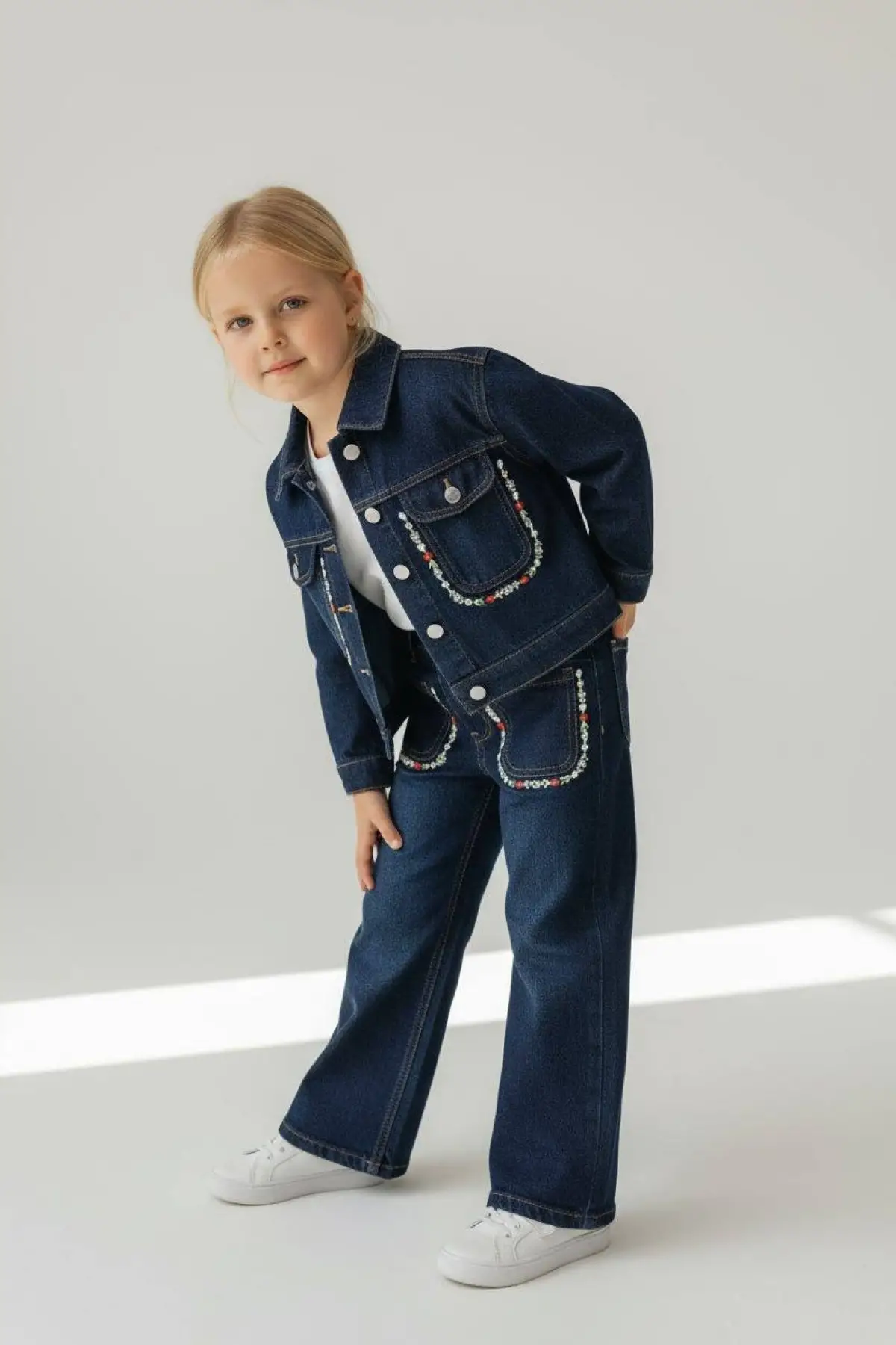 Kız Çocuk Çiçek Nakışlı Kot Ceketli 3'lü Denim Takım