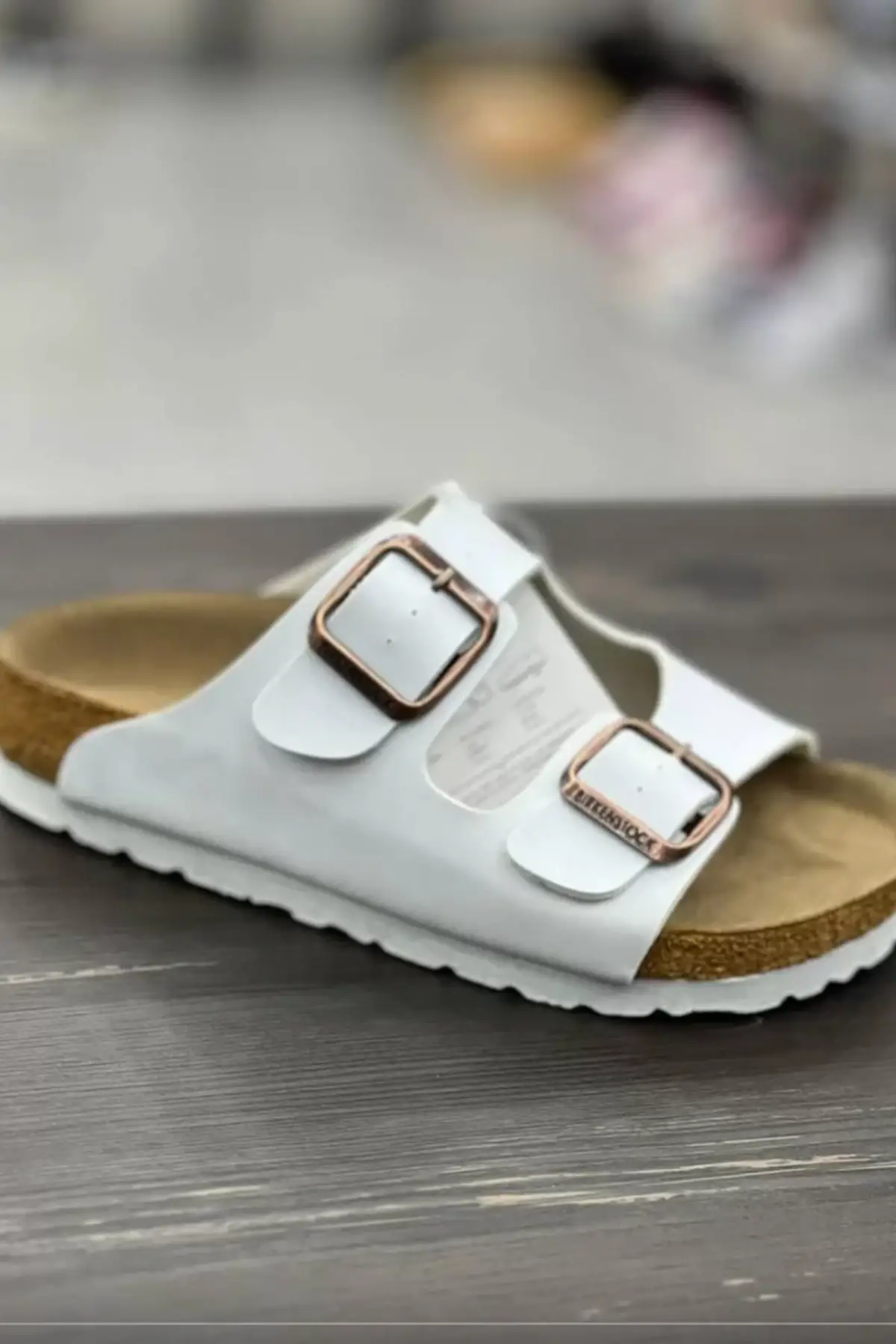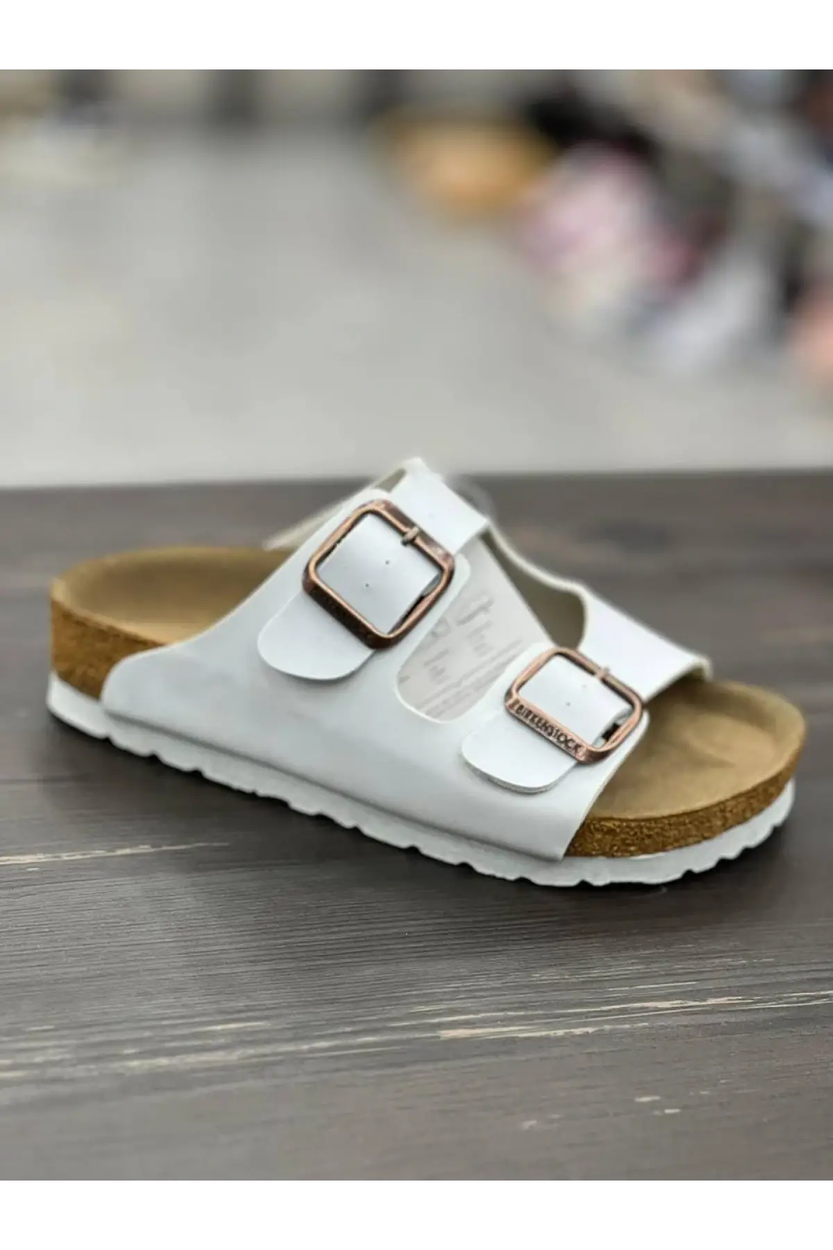 Çocuk Mantar Taban Deri Beyaz Terlik