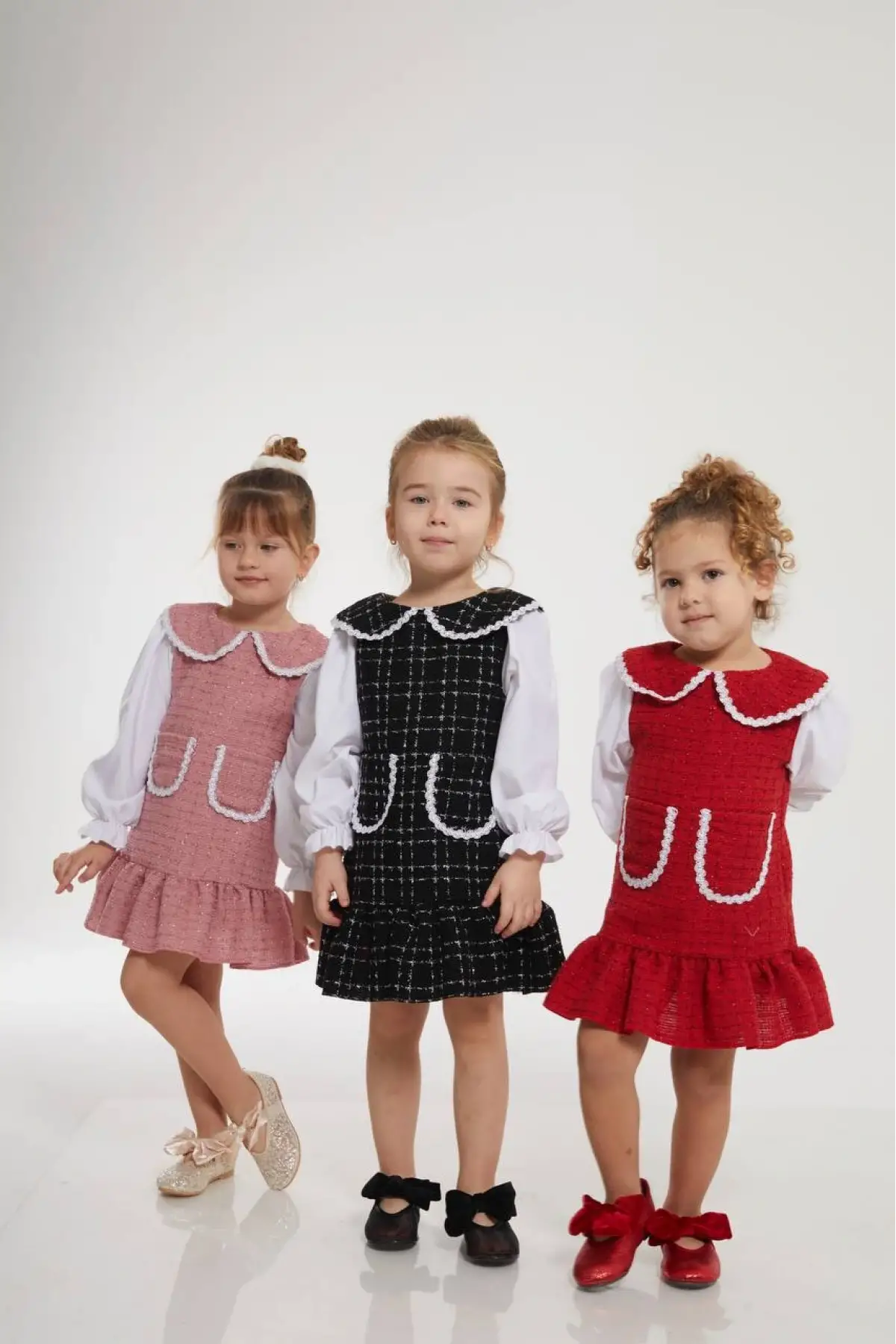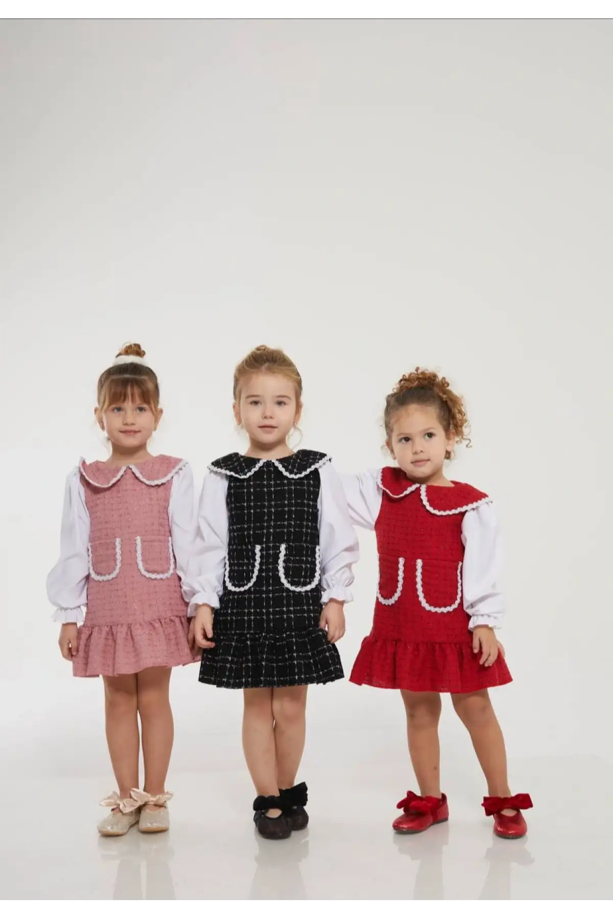 Kız Çocuk Düğme Detaylı Elbise Bluz Takım
