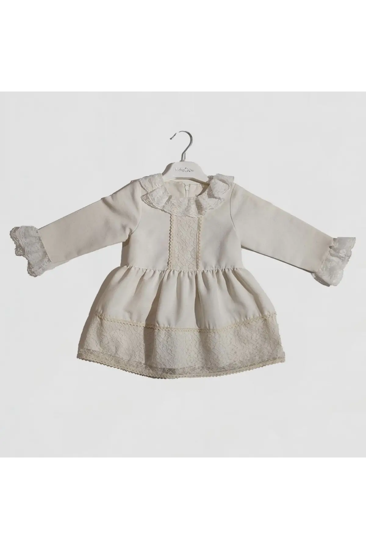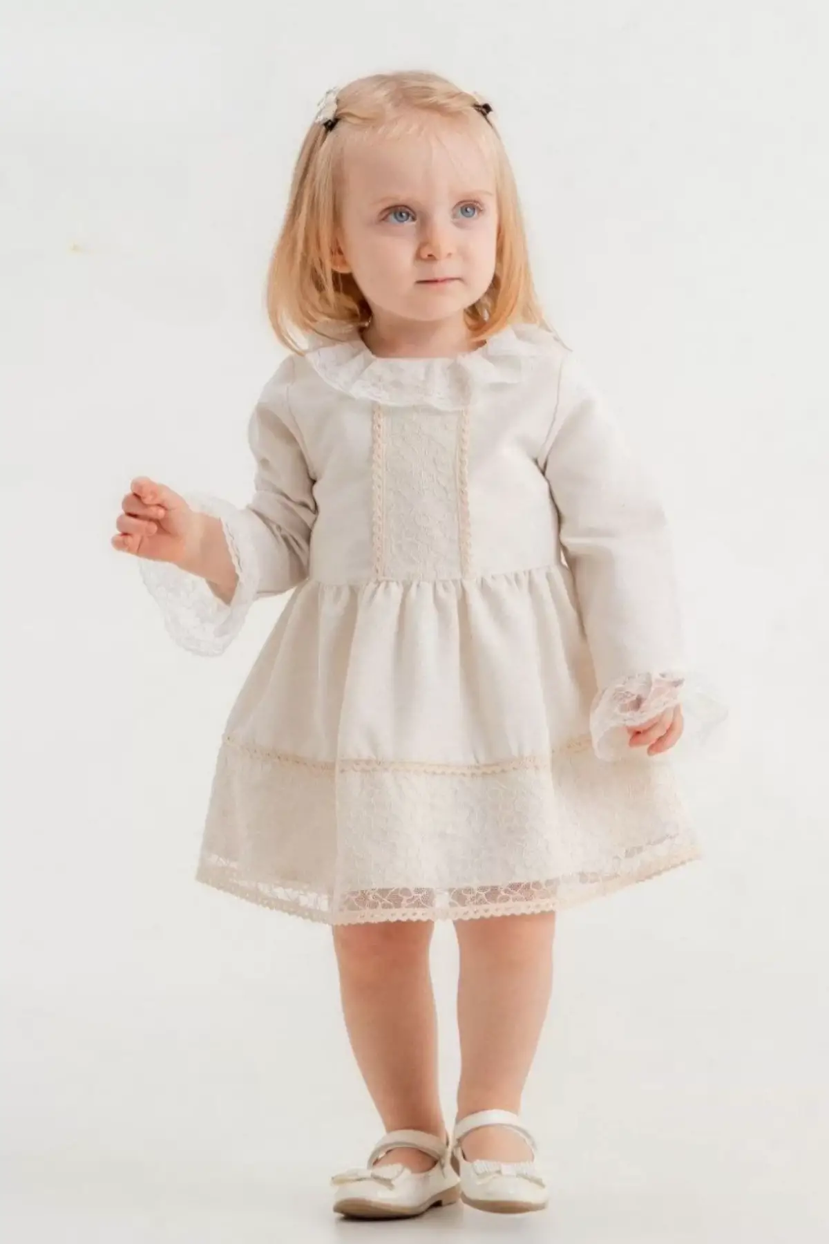 Kız Çocuk Krem Keten Güpür Detaylı Elbise