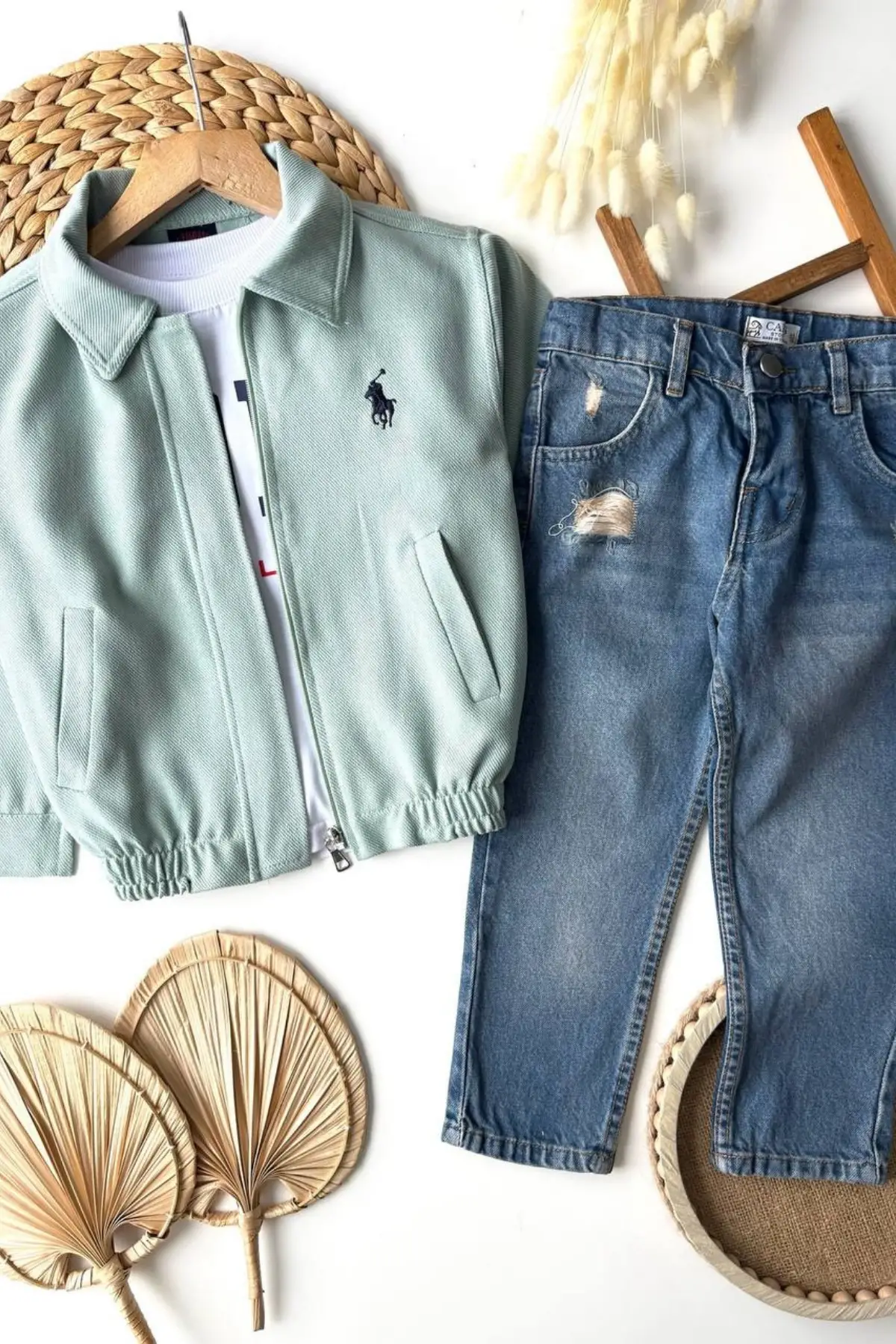 Erkek Çocuk Gabadin Yeşil Ceketli Kot Pantolonlu 3'lü Takım