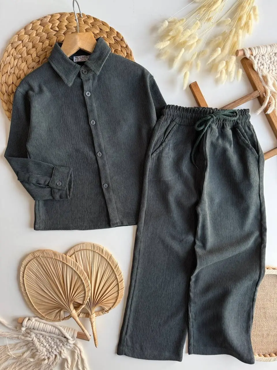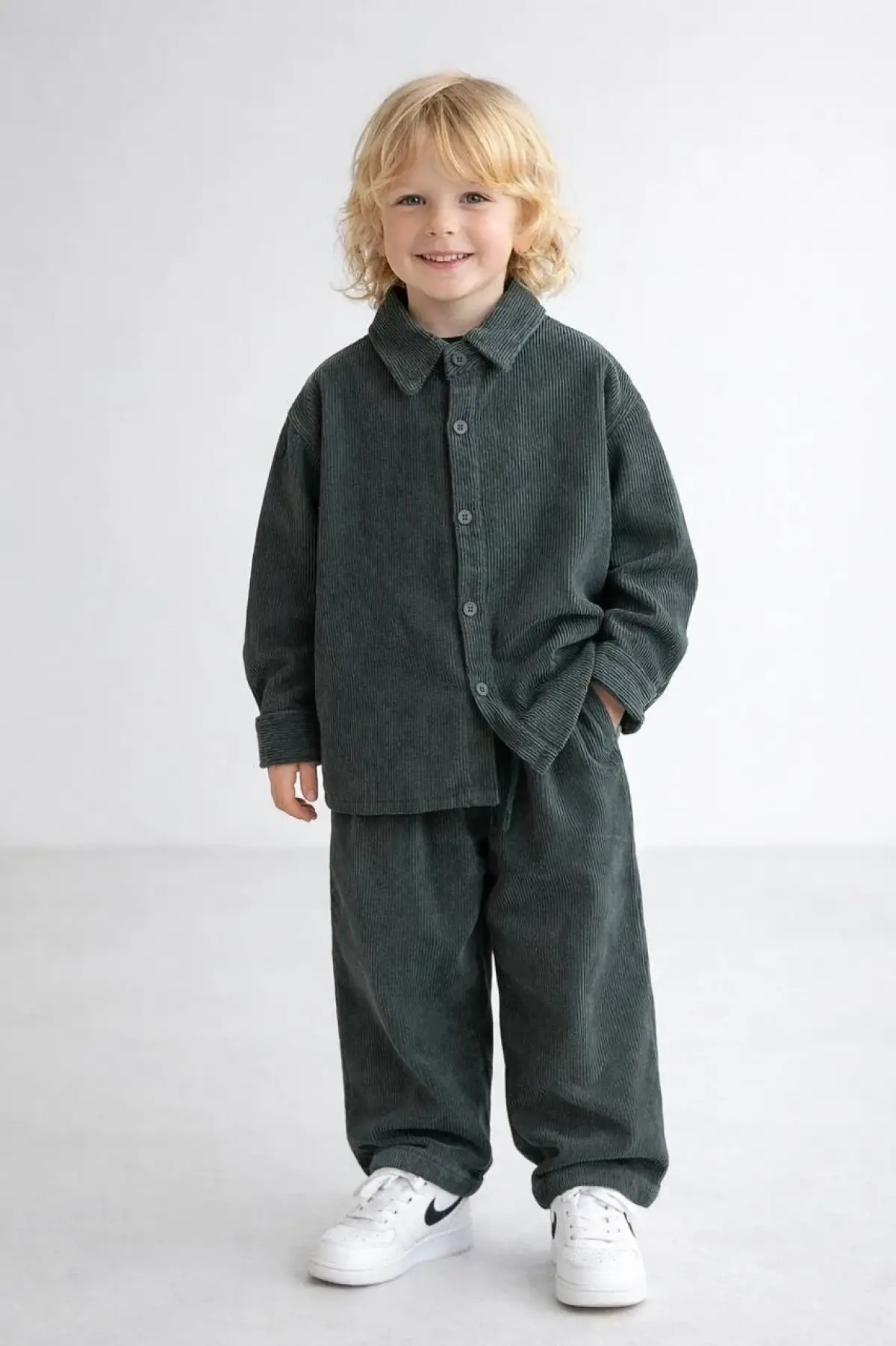 Erkek Çocuk Kadife Yeşil Gömlek Pantolon 2'li Takım