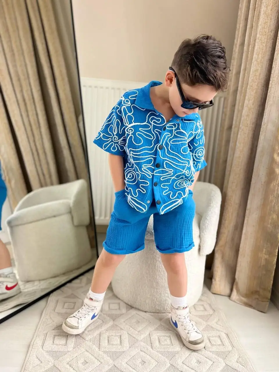 Erkek Çocuk Nakışlı Mavi Müslin Takım