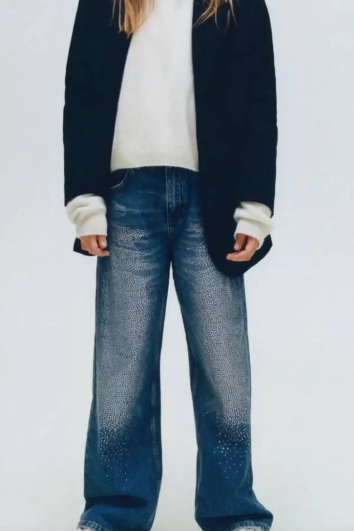 Kız Çocuk Kalp Detaylı Bol Paça Kot Pantolon