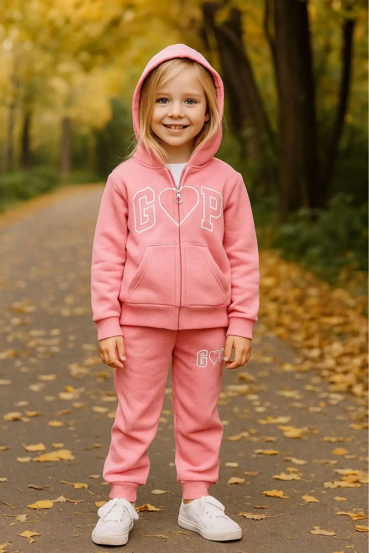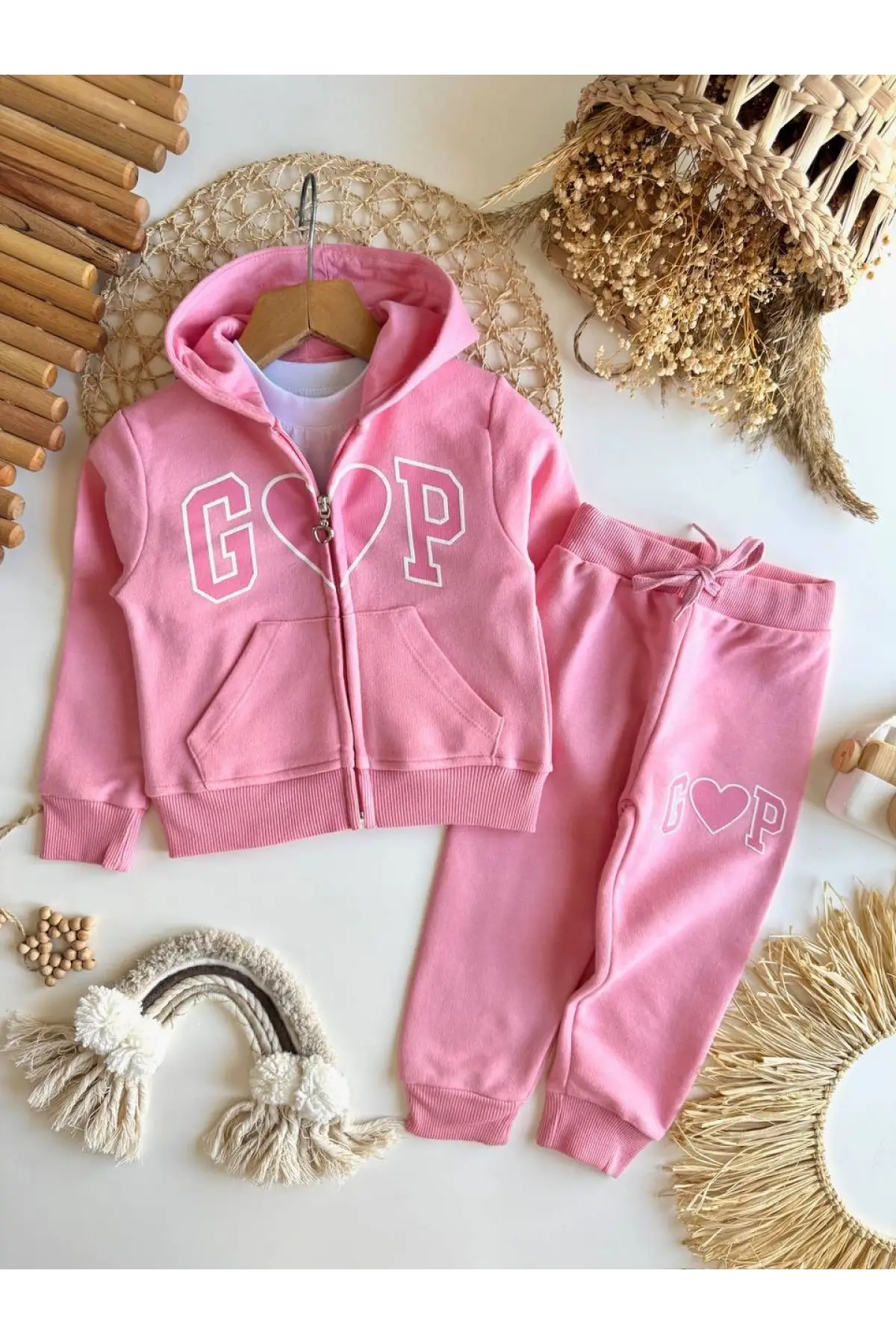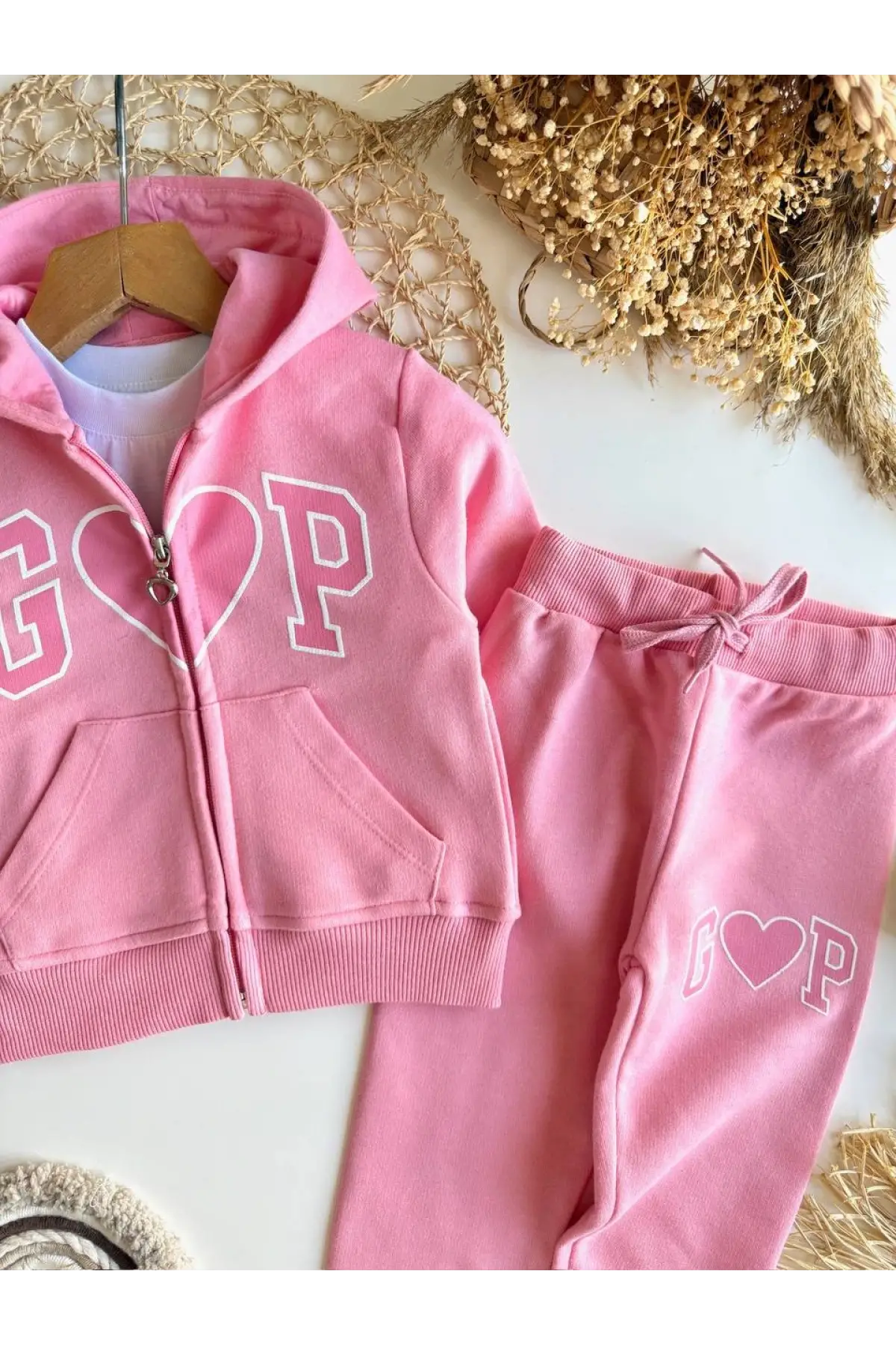 Kız Çocuk Kapüşonlu Kalp Detaylı Pembe Alt Üst Takım
