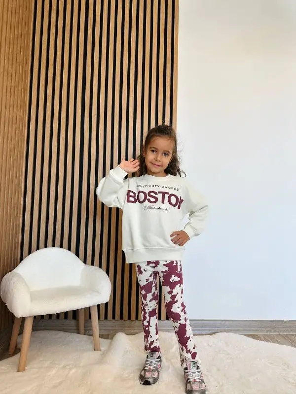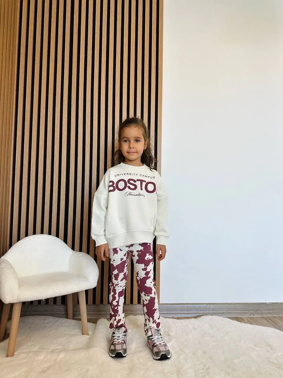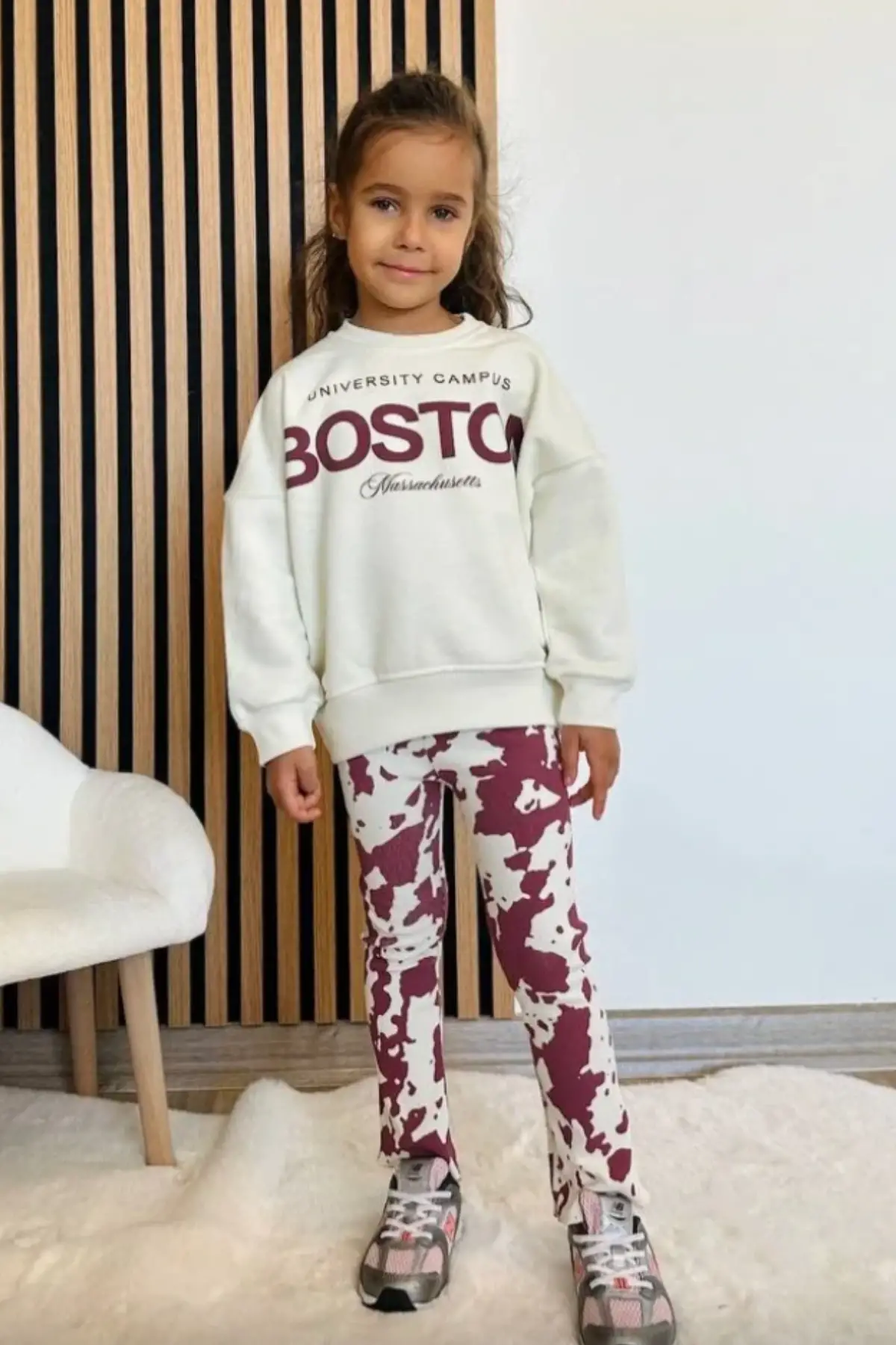 Kız Çocuk Boston Baskılı Bordo Taytlı %100 Pamuk Takım