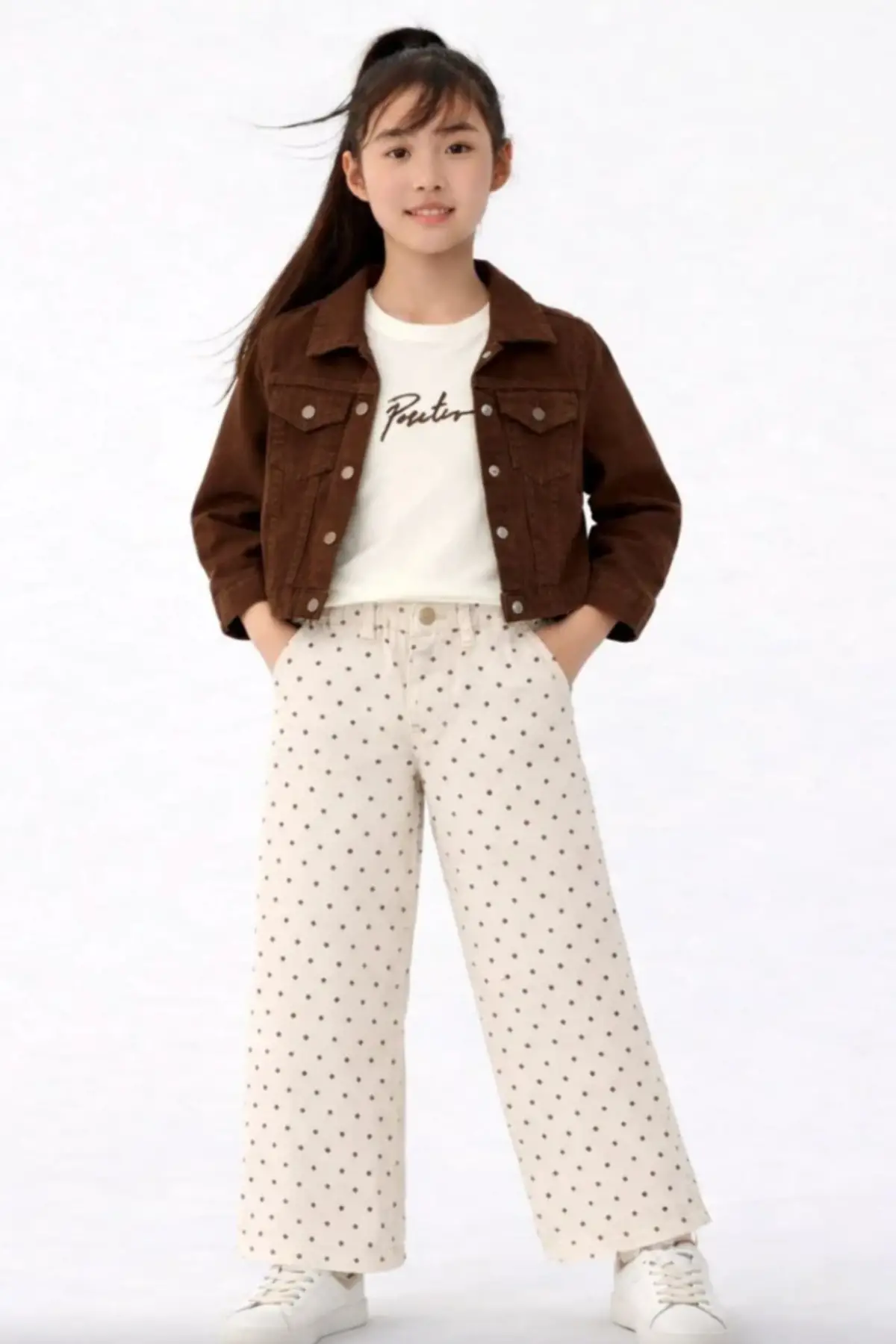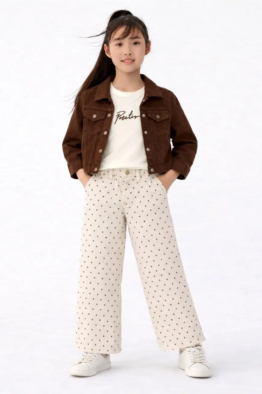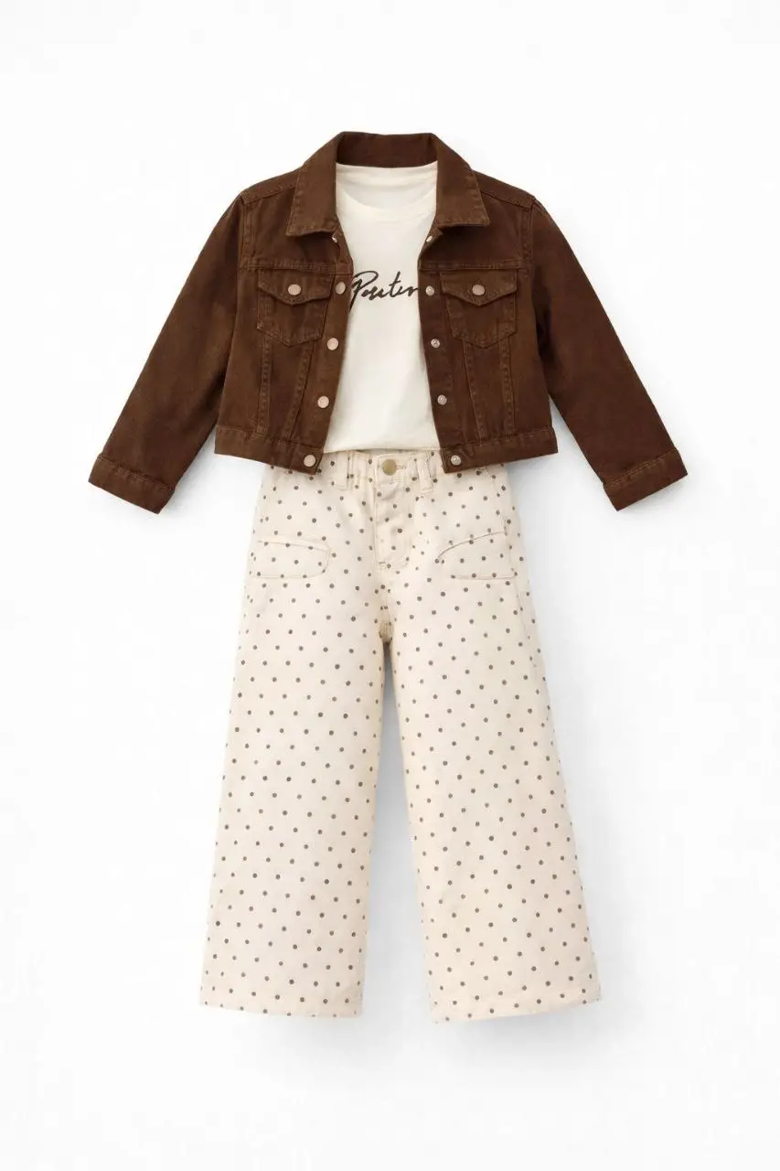 Kız Çocuk Kahverengi Ceket Puantiye Detaylı 3'lü Takım