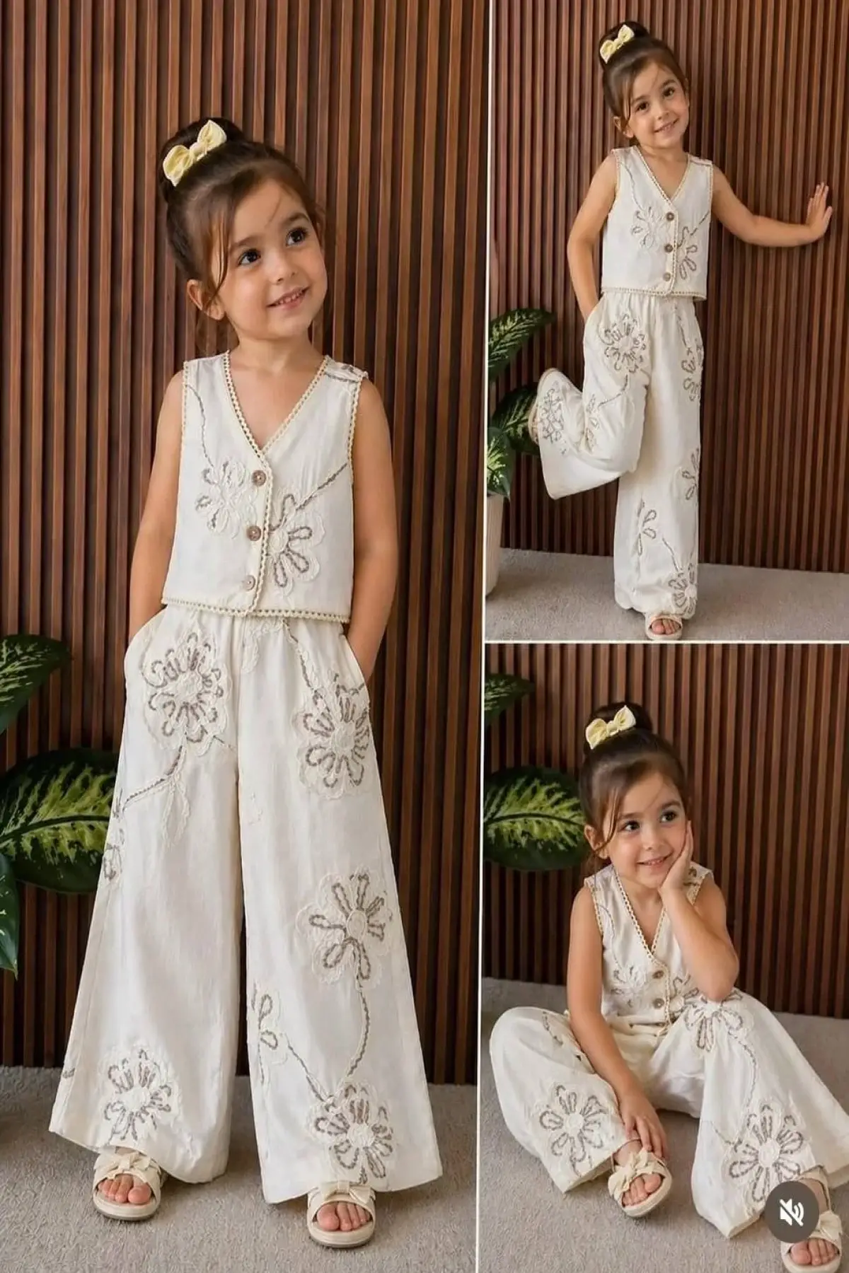 Kız Çocuk Çiçek İşleme Yelekli Takım