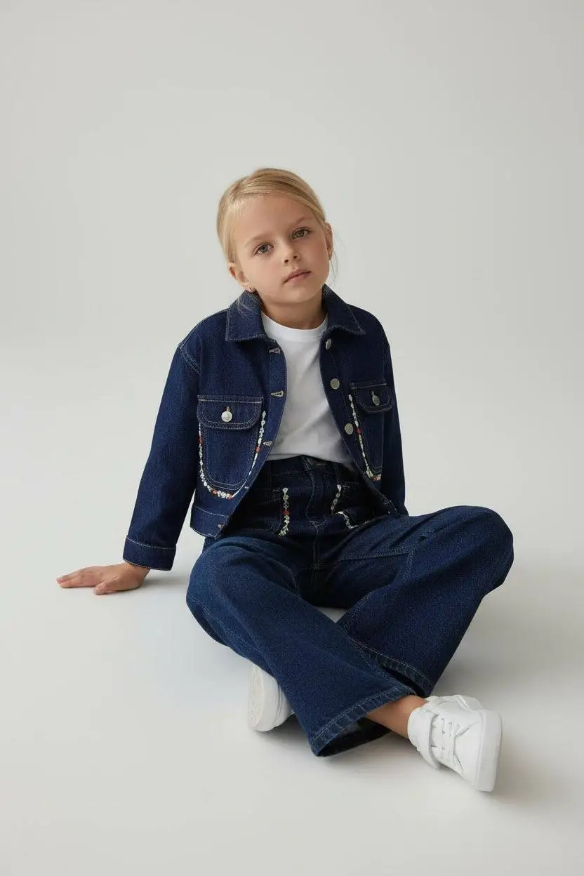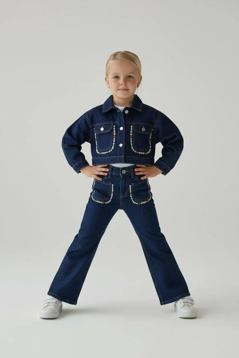 Kız Çocuk Çiçek Nakışlı Kot Ceketli 3'lü Denim Takım