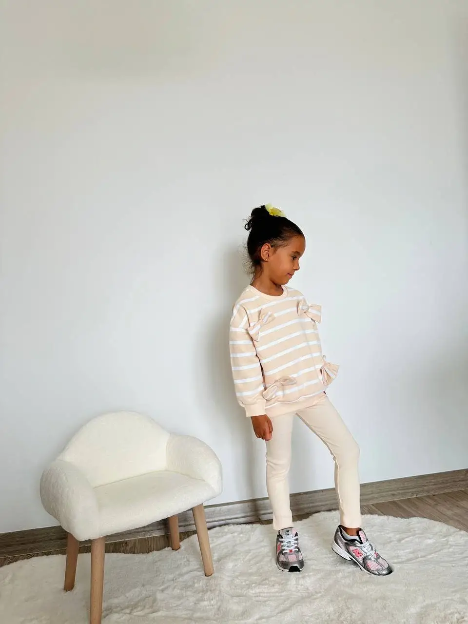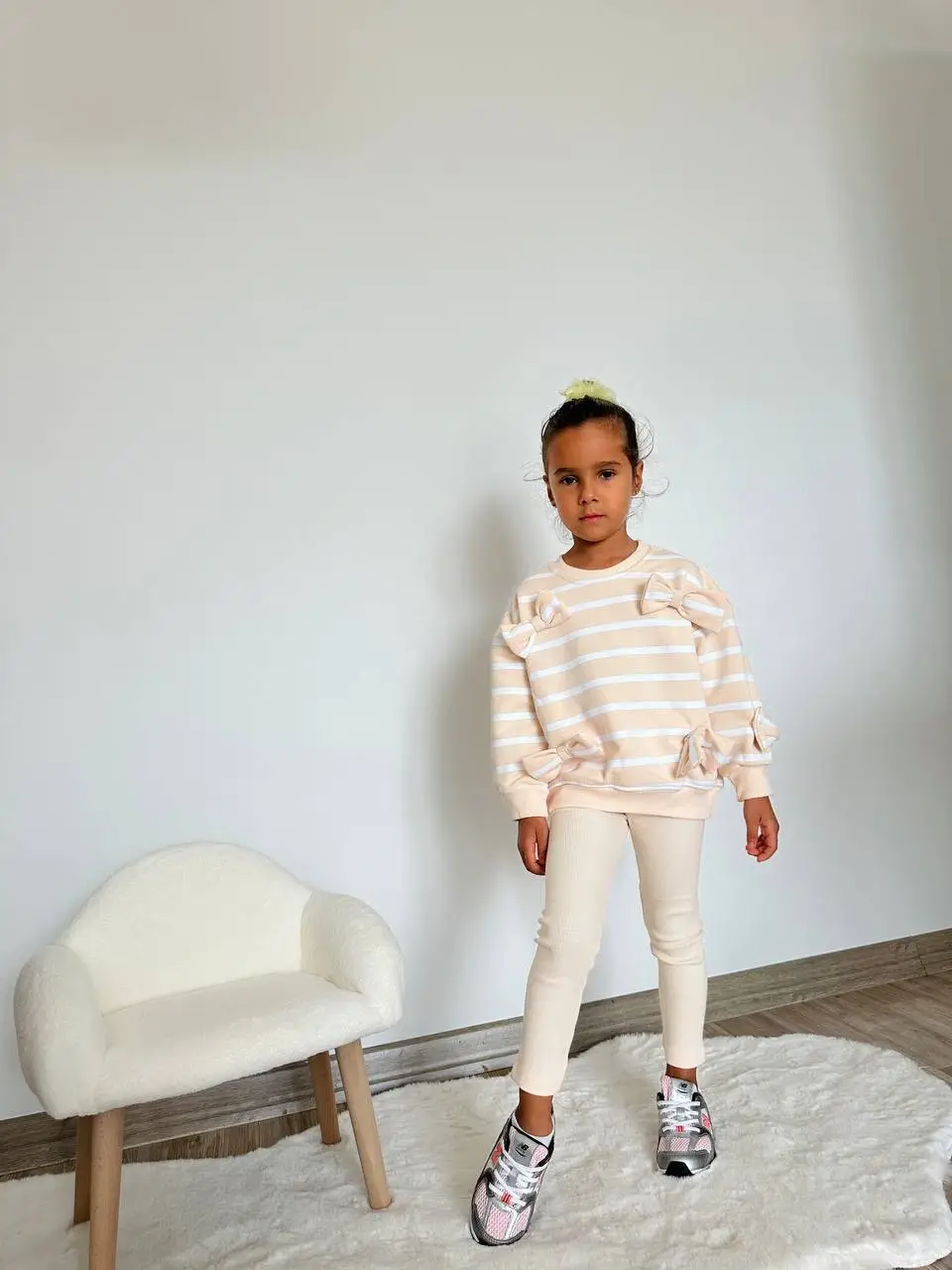 Kız Çocuk Çizgili Kurdele Detaylı Alt-Üst Takım
