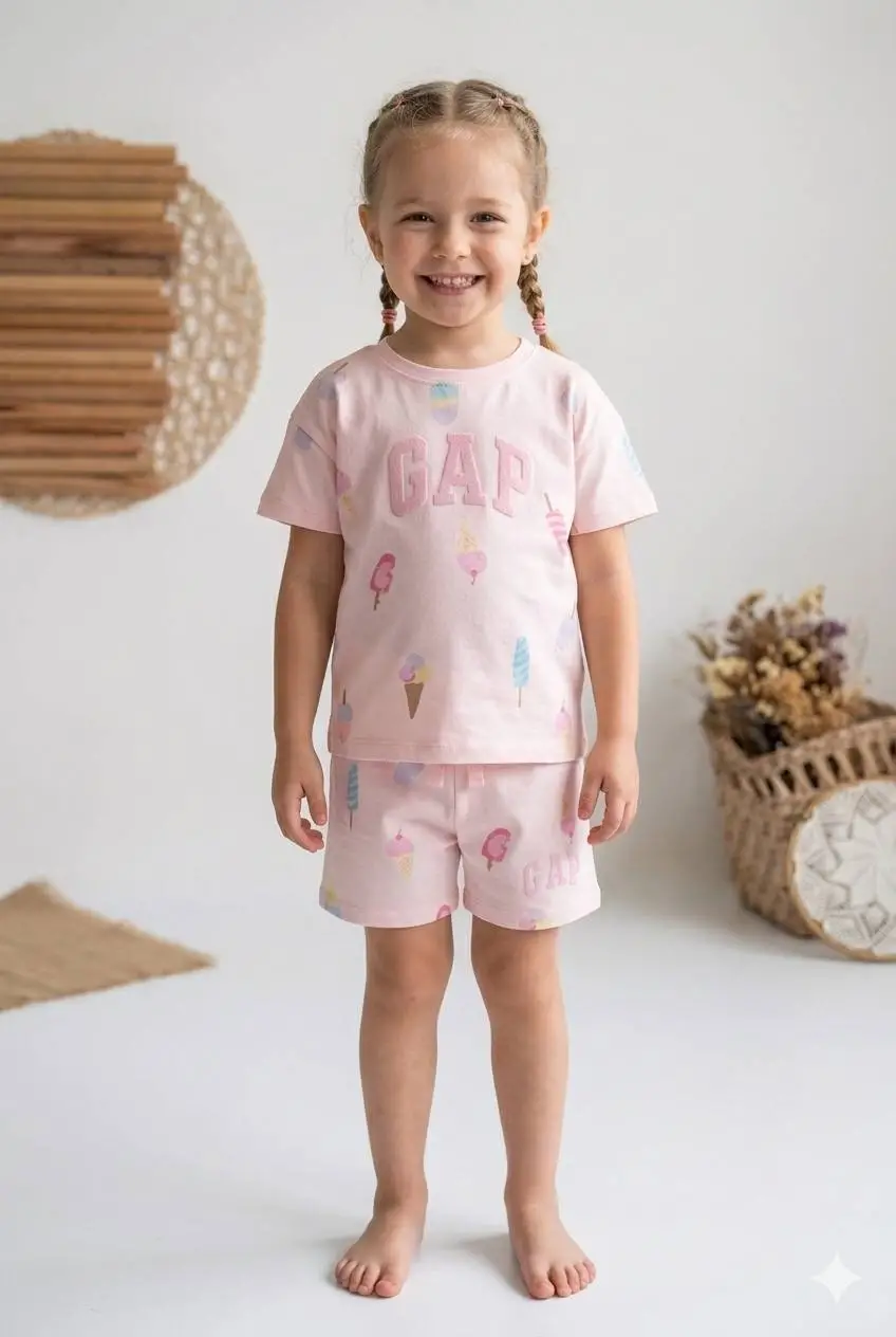 Kız Çocuk Dondurma Baskılı %100 Pamuk Pembe Takım