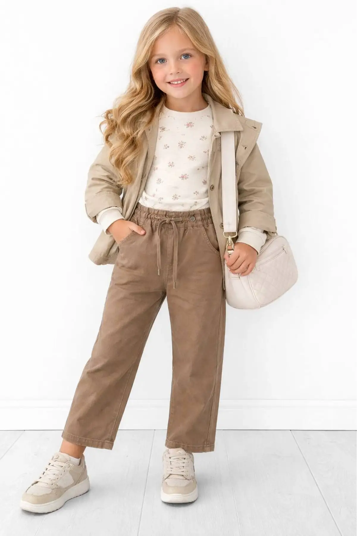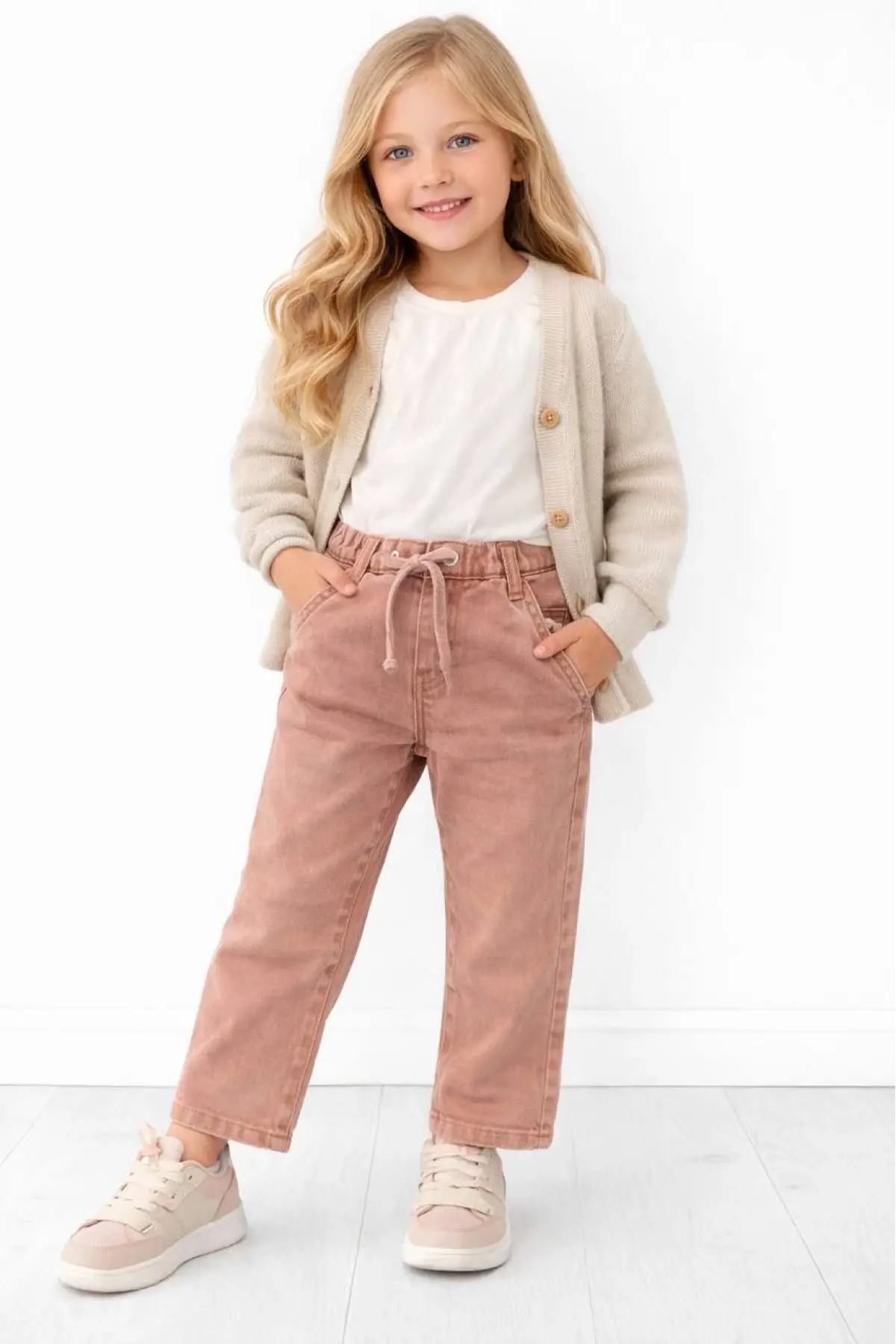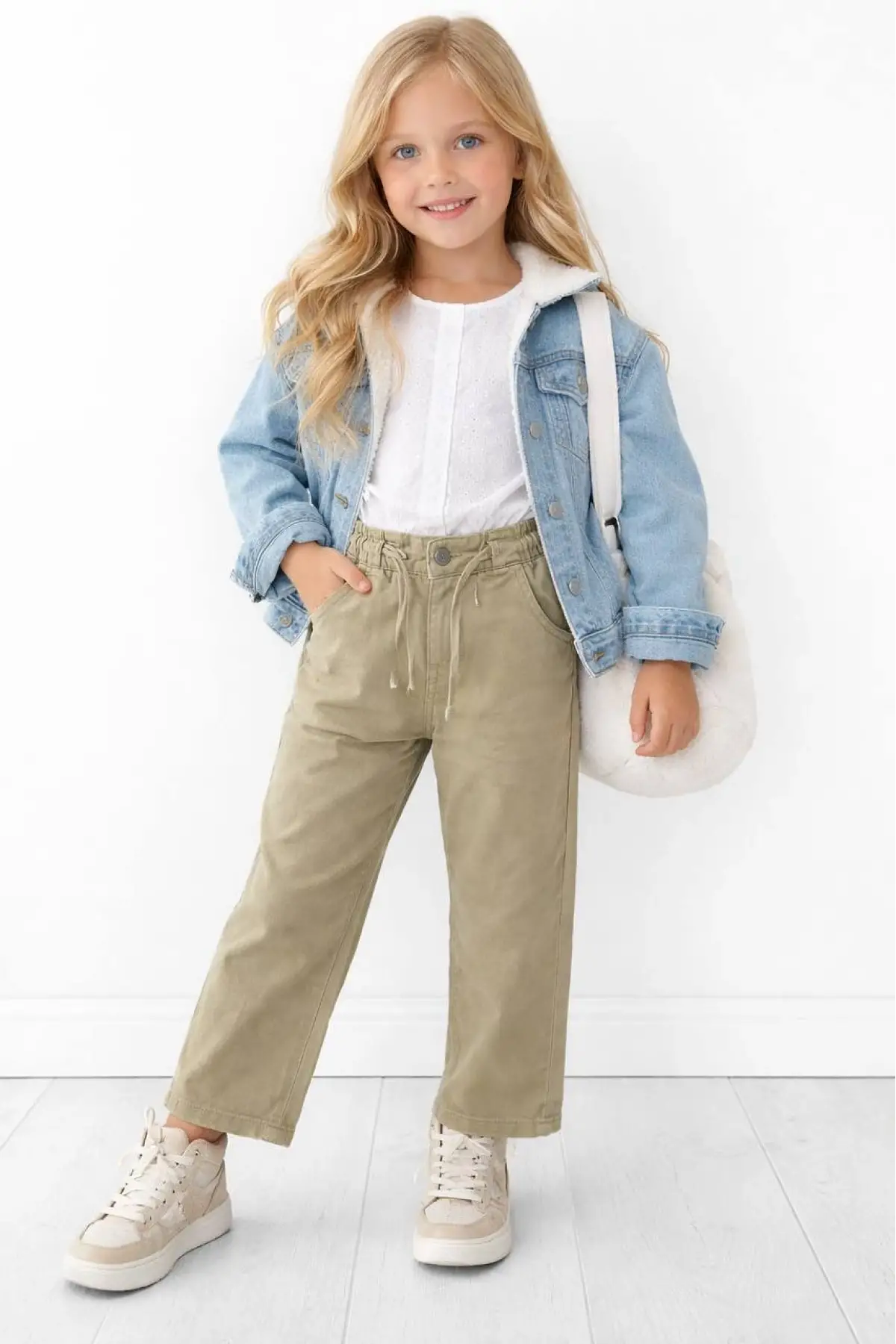 Kız Çocuk Gofre Kumaş Kemerli Bol Paça Pantolon