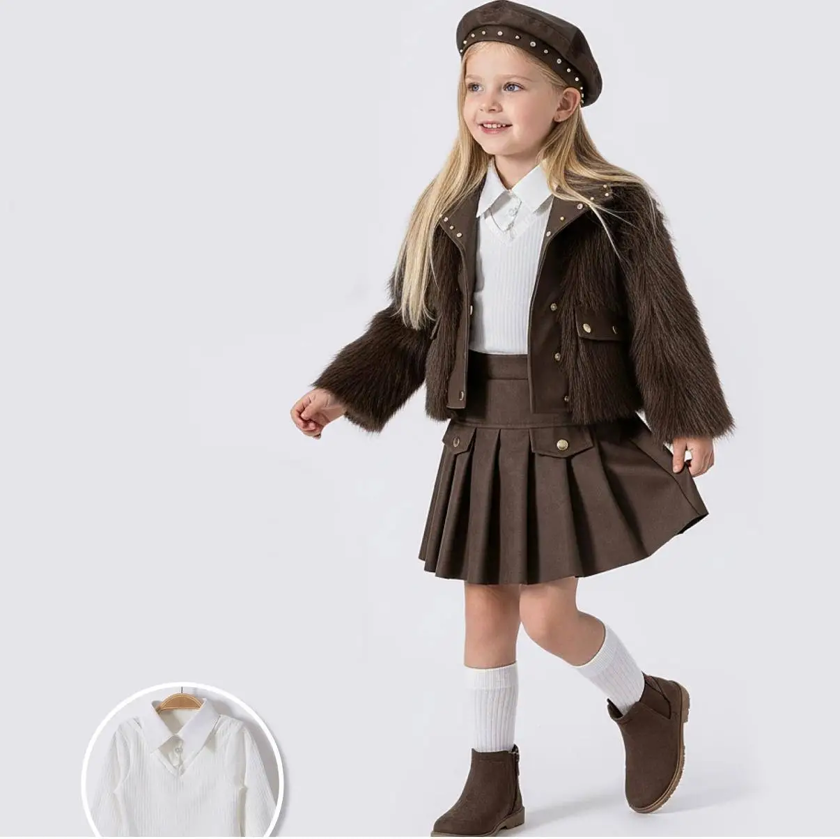 Kız Çocuk Kürklü Deri Etekli 4'lü Acı Kahve Takım