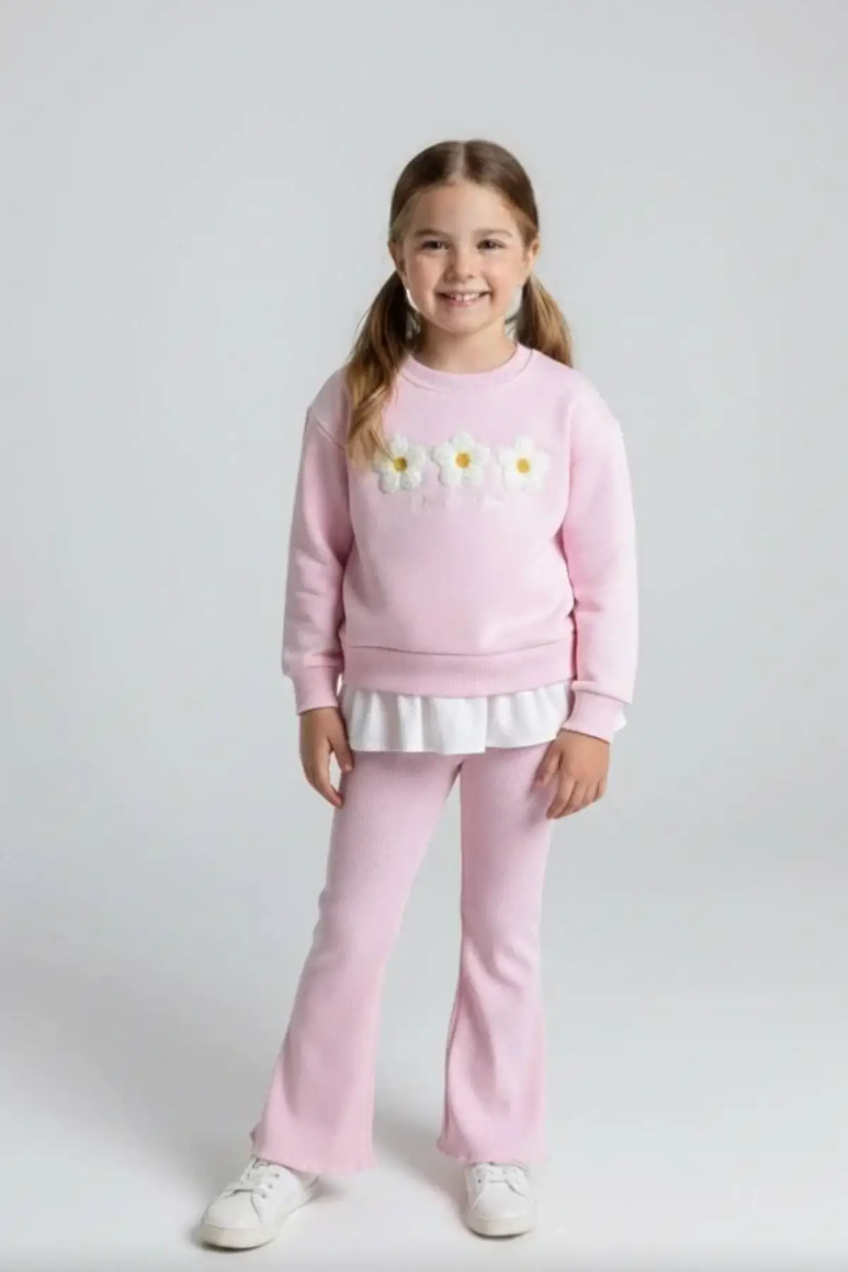 Kız Çocuk Pembe Zambak İşlemeli Aplike Etekli Yazlık Takım