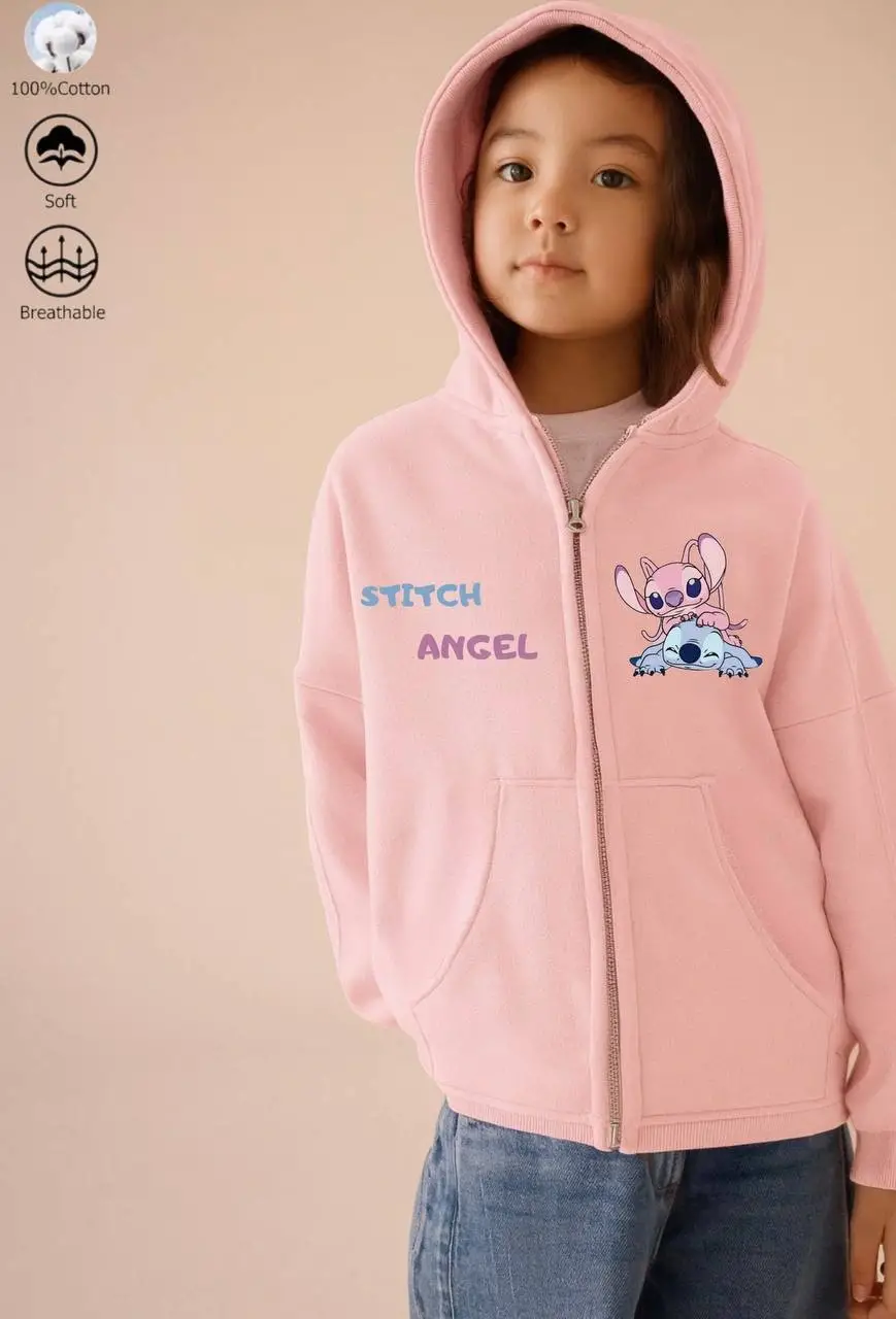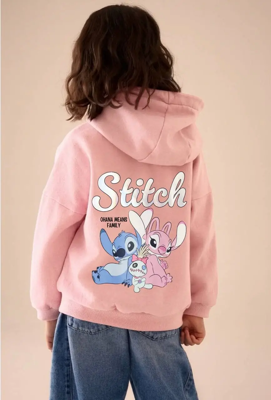Kız Çocuk Stitch Baskılı Kapüşonlu Fermuarlı Pembe Sweatshirt