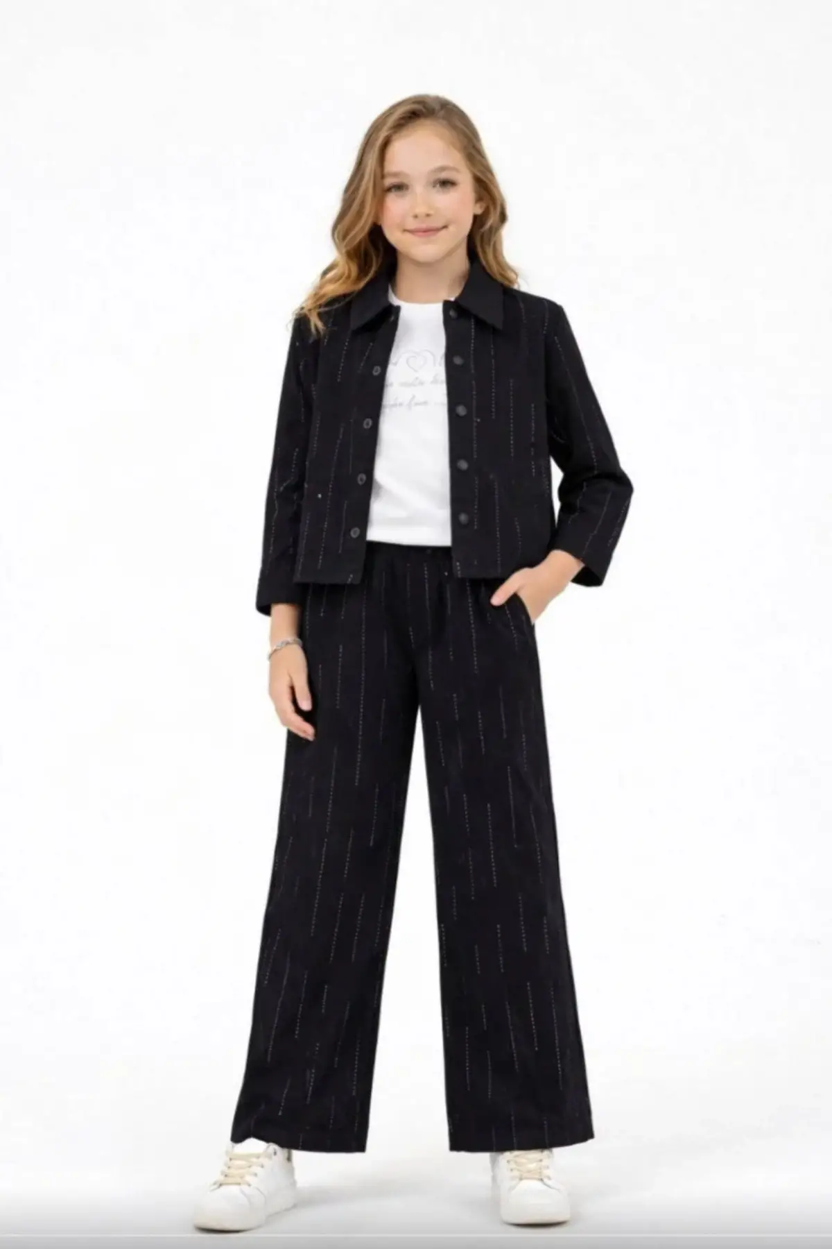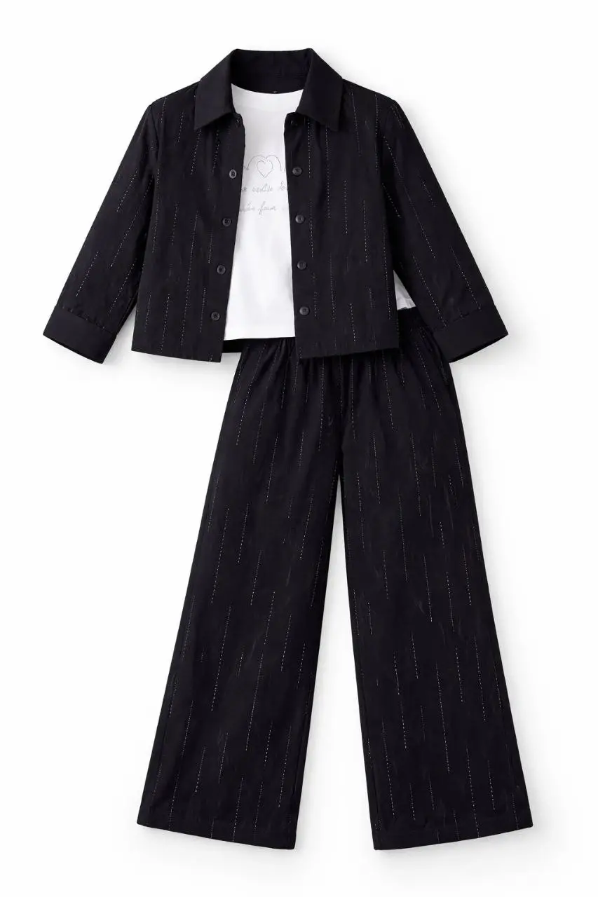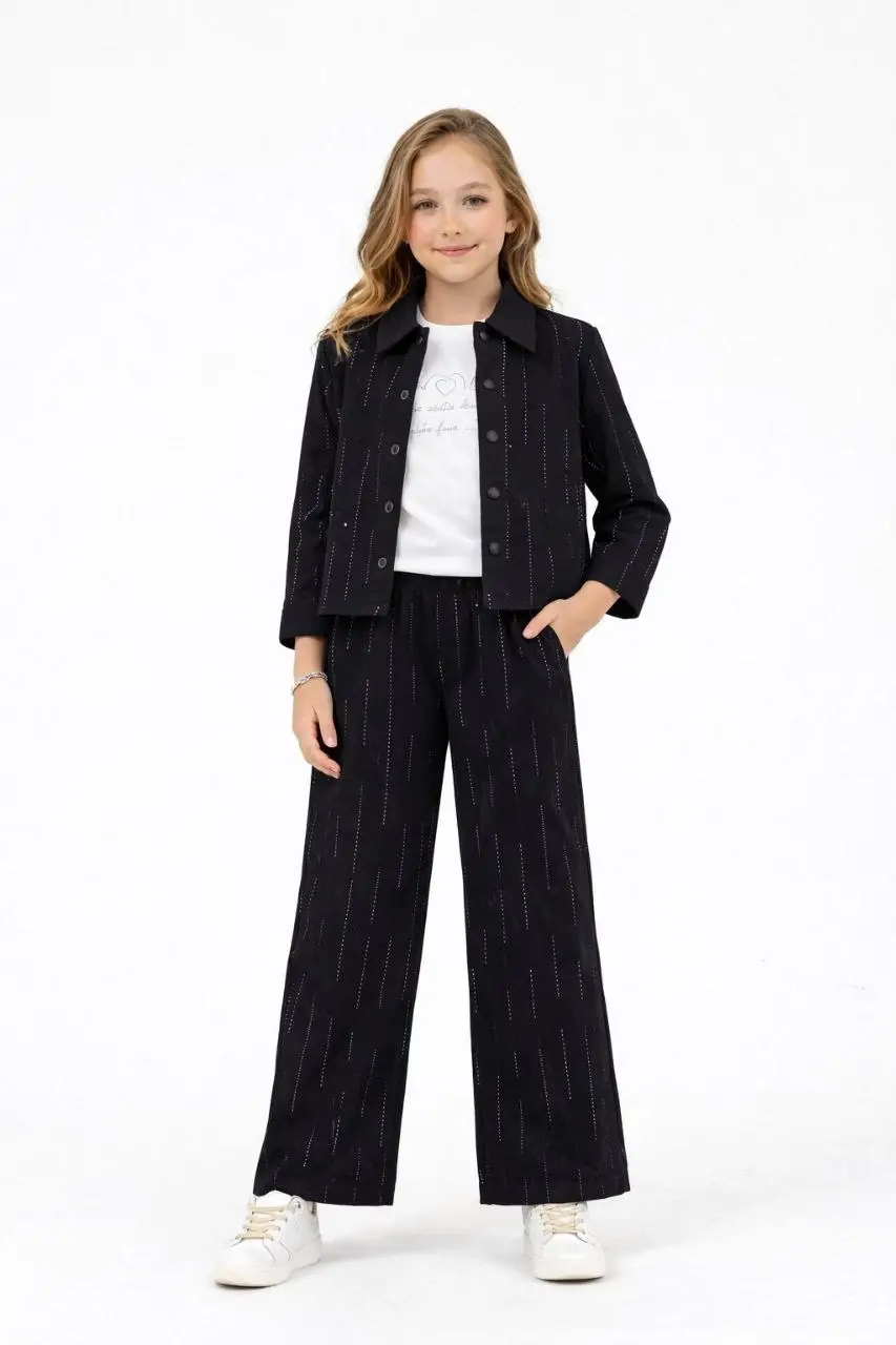 Kız Çocuk Taş Detaylı 3'lü Dokuma Siyah Takım