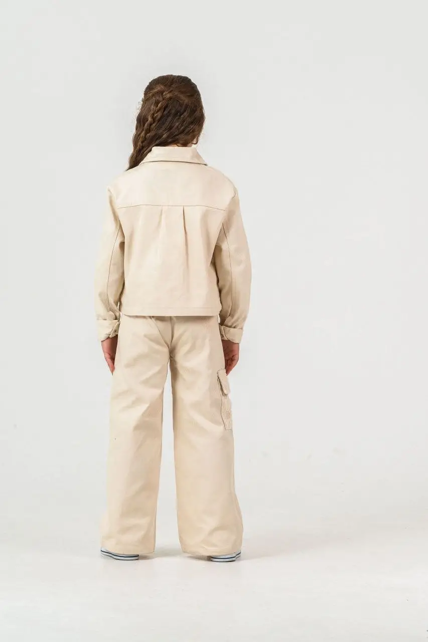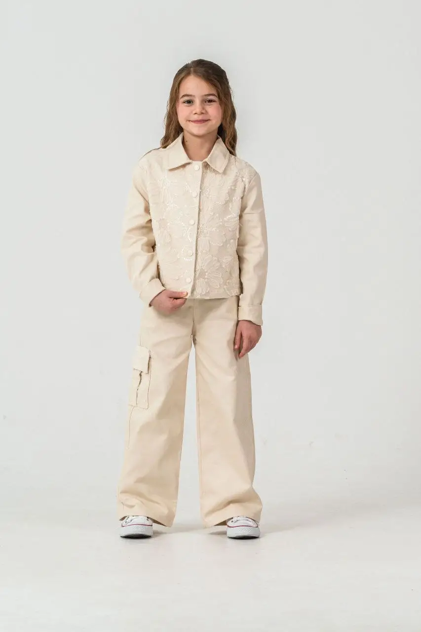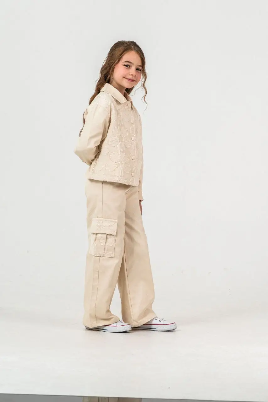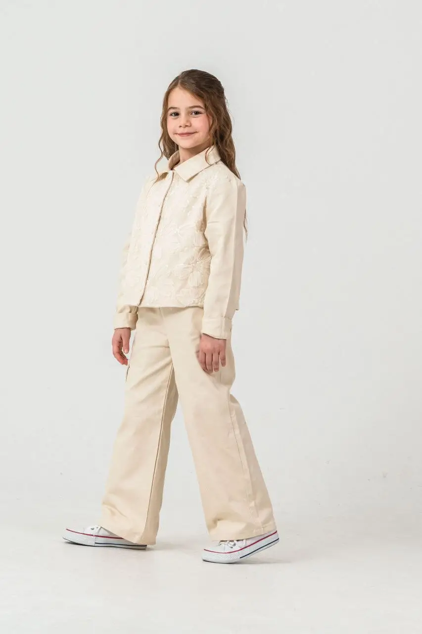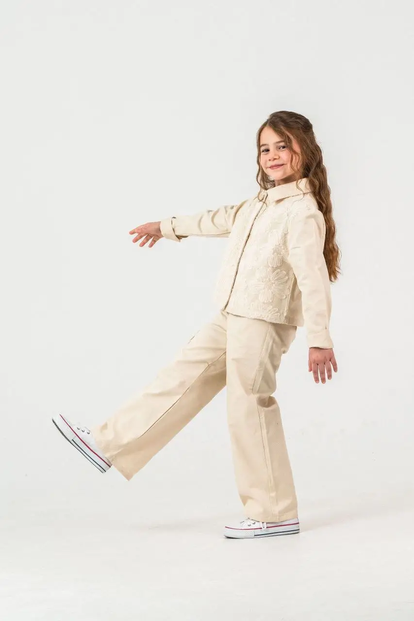 Kız Çocuk Zambak Detaylı Pantolon Krem Dokuma Takım