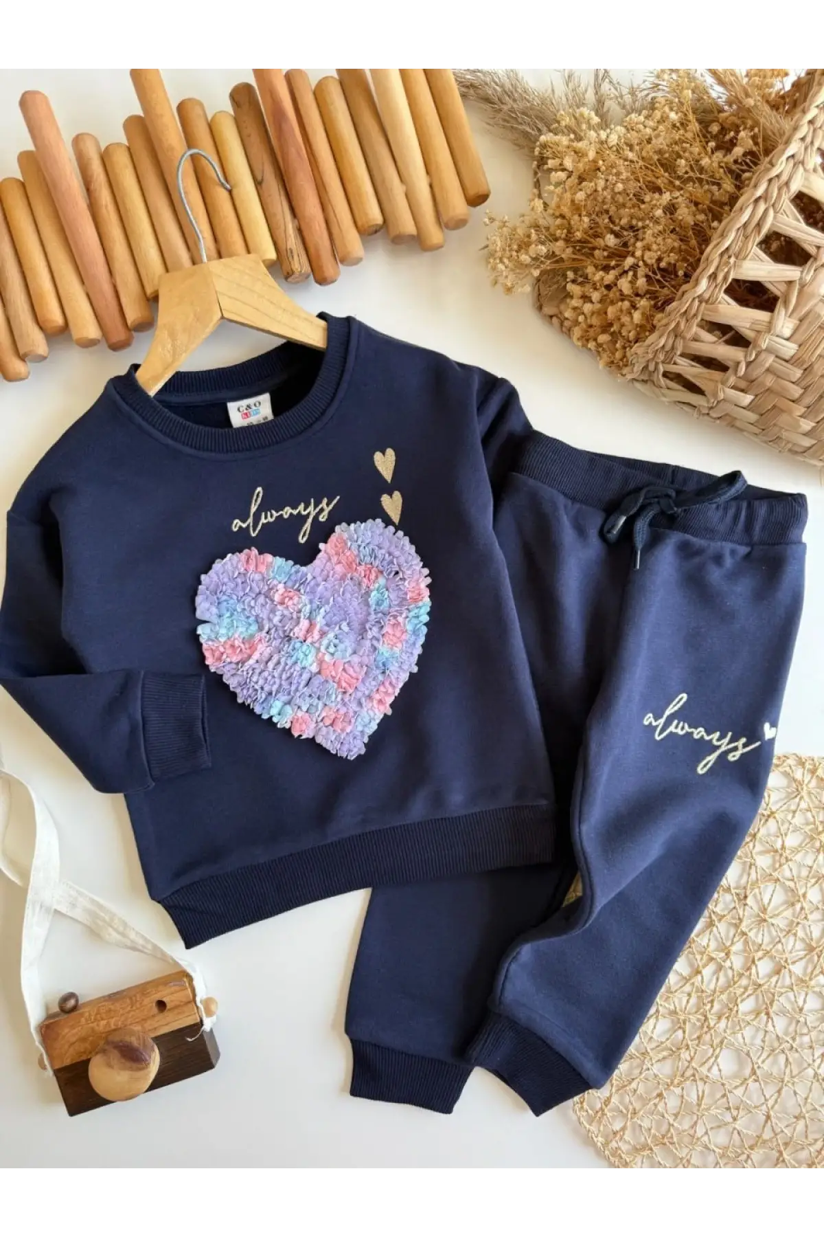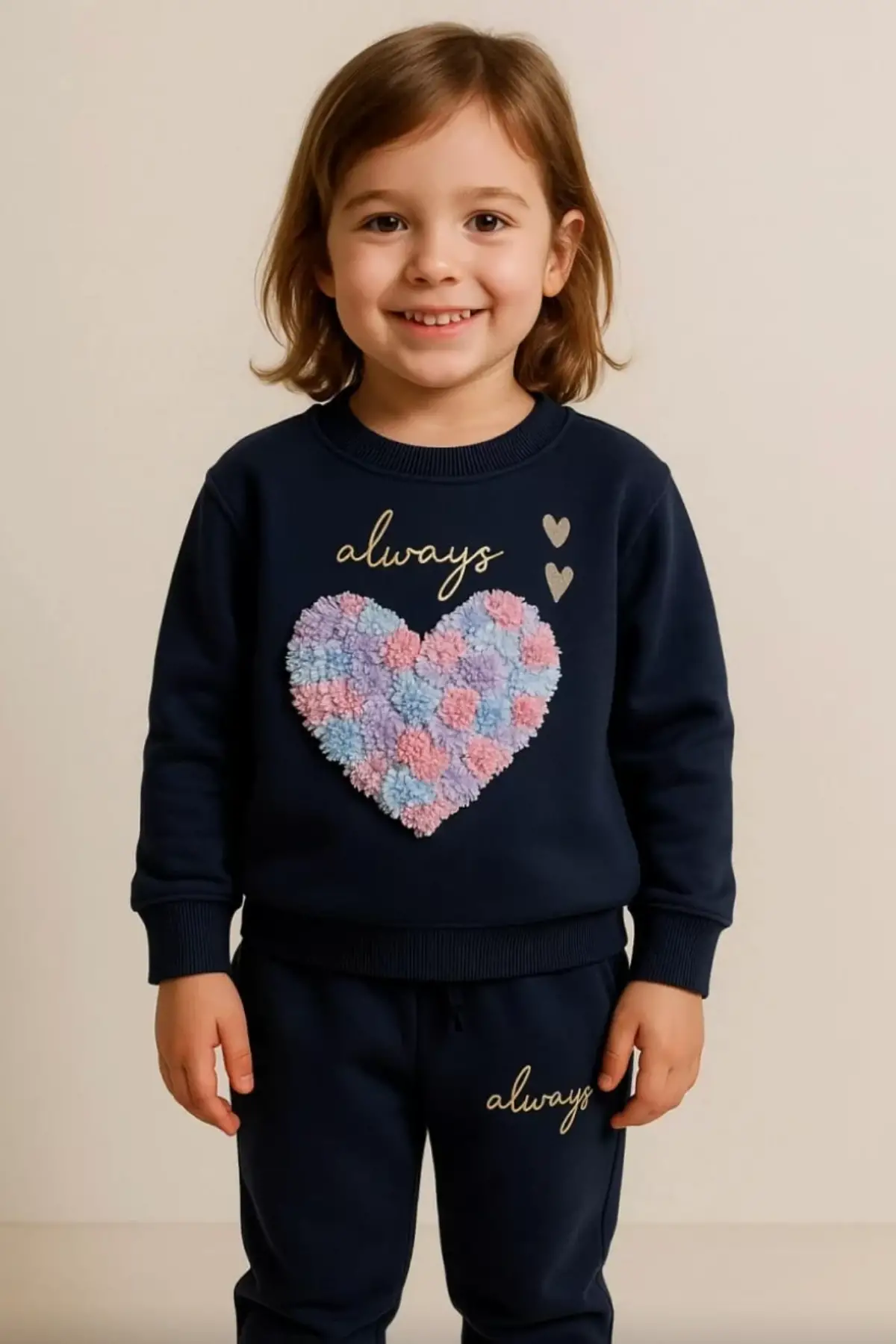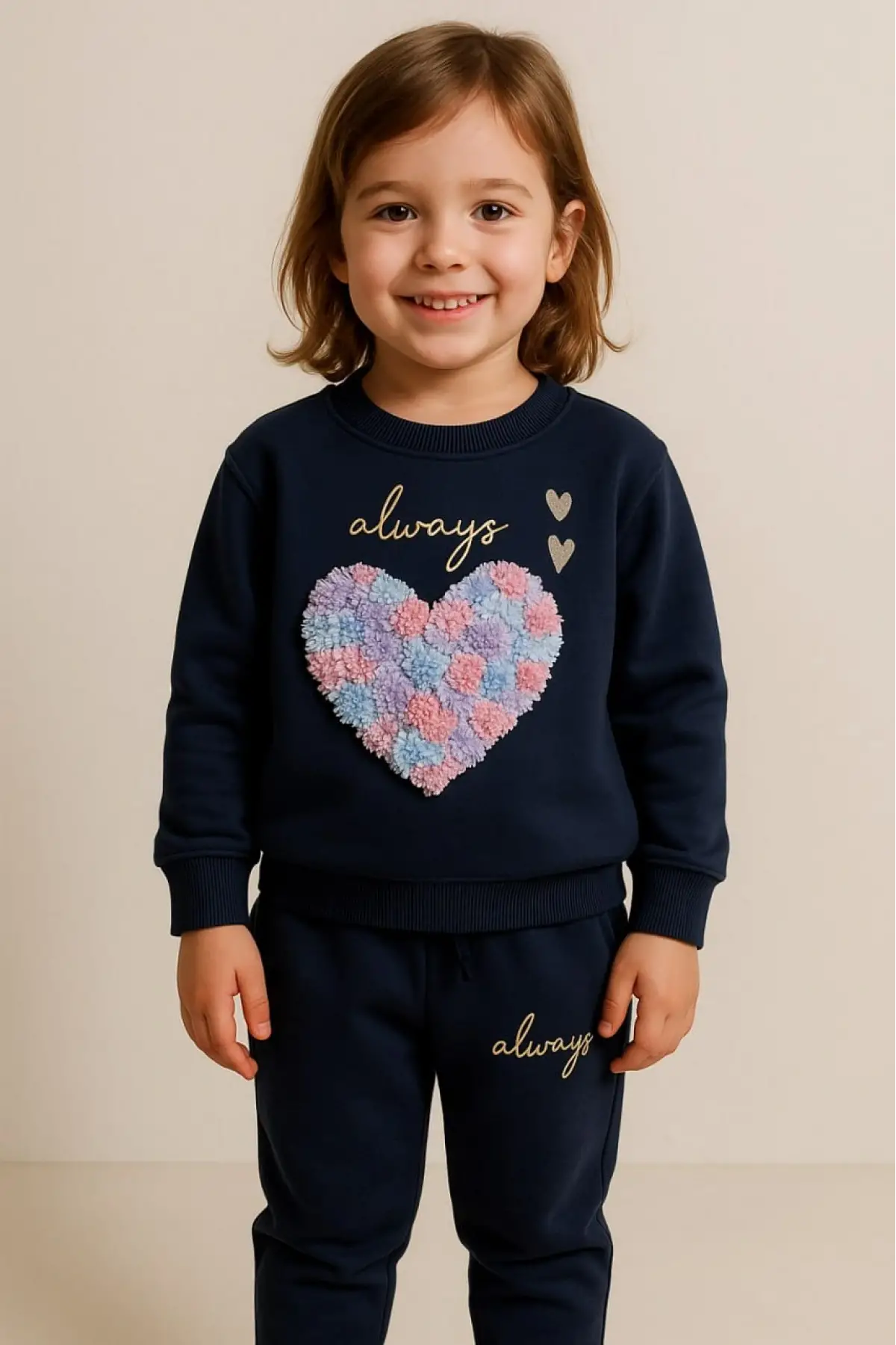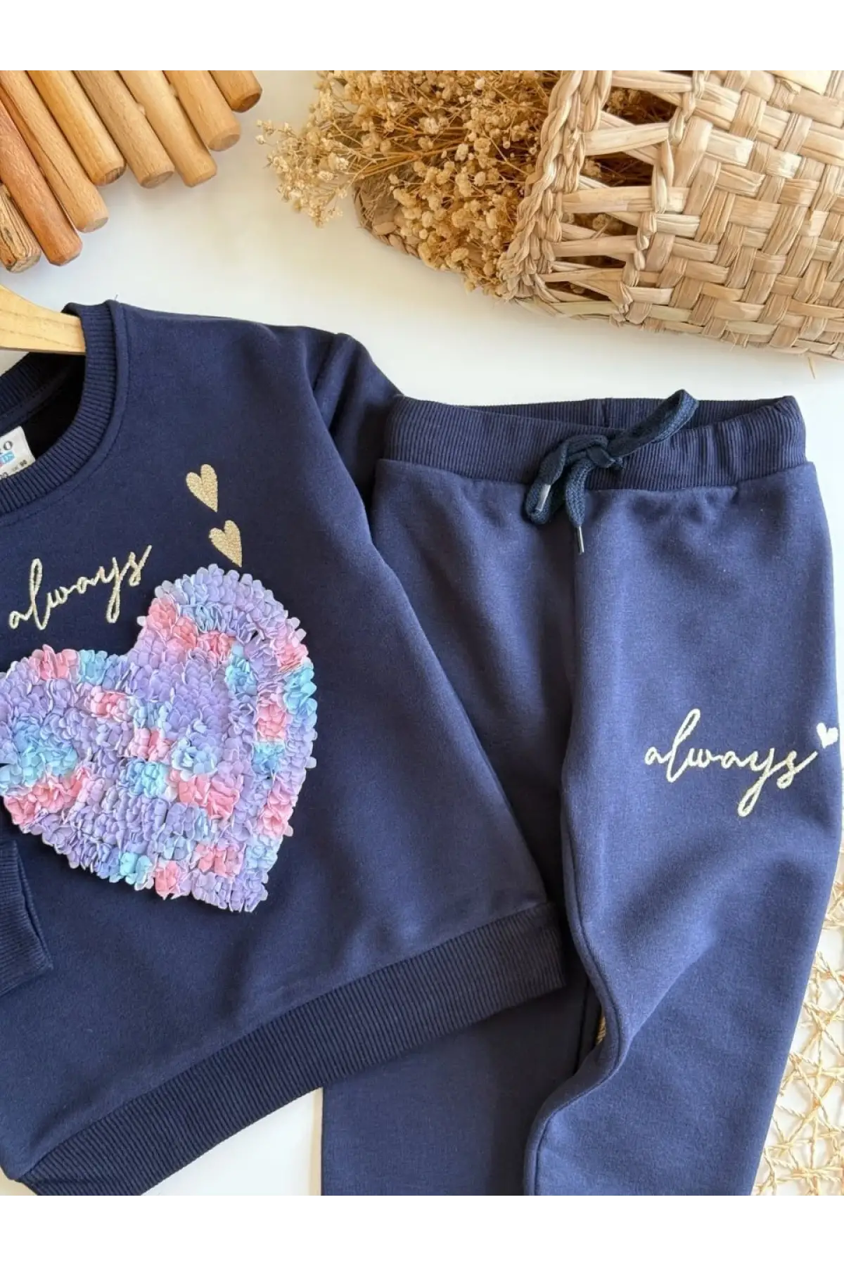 Kız Çocuk 3D Çiçek İşlemeli Lacivert %100 Pamuk Takım
