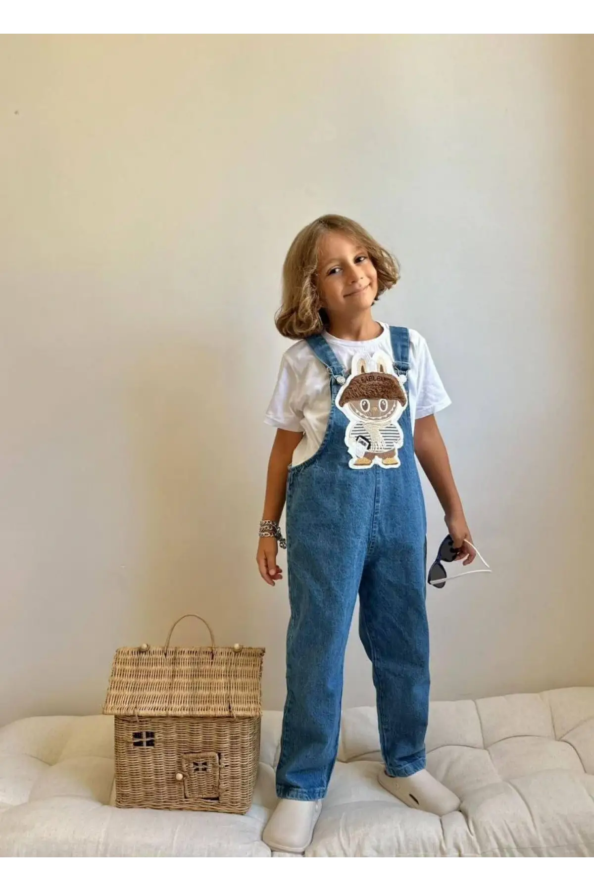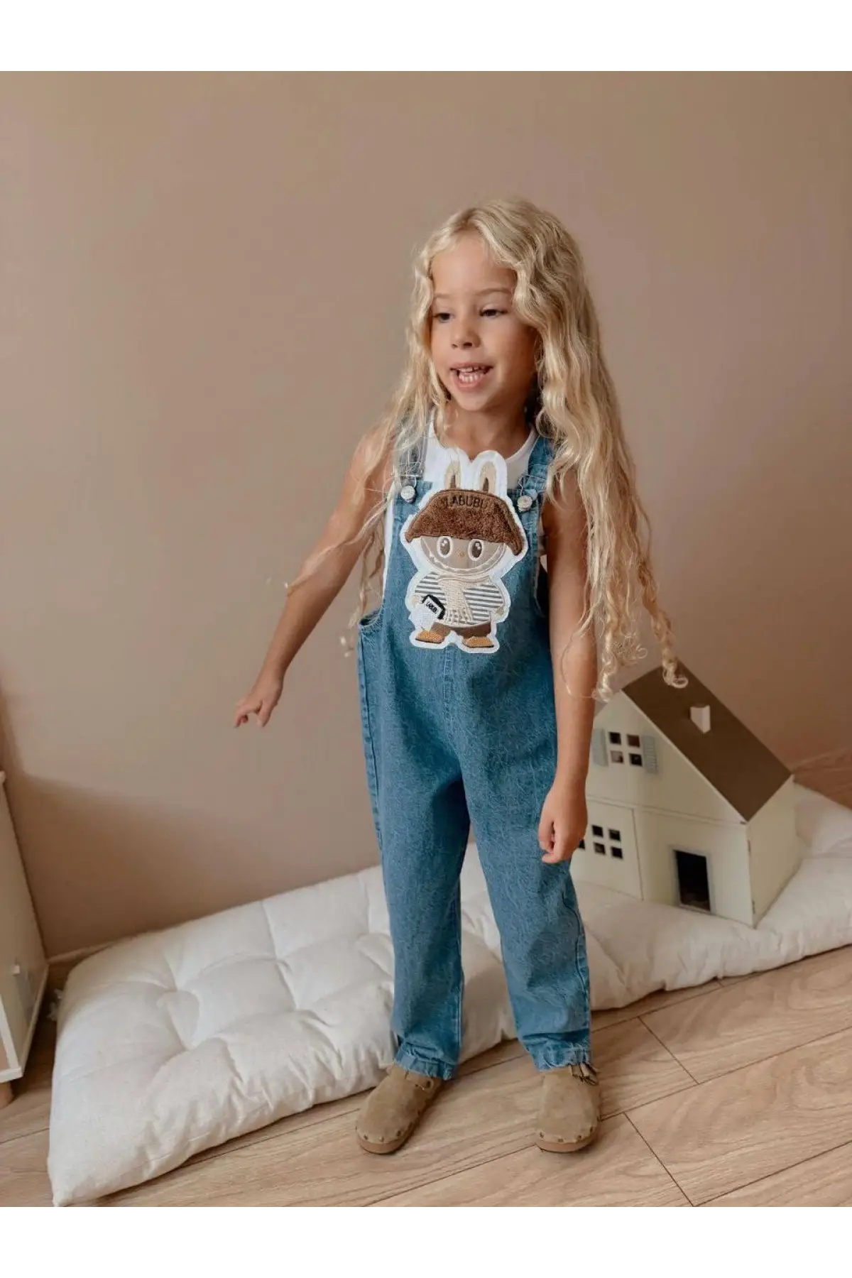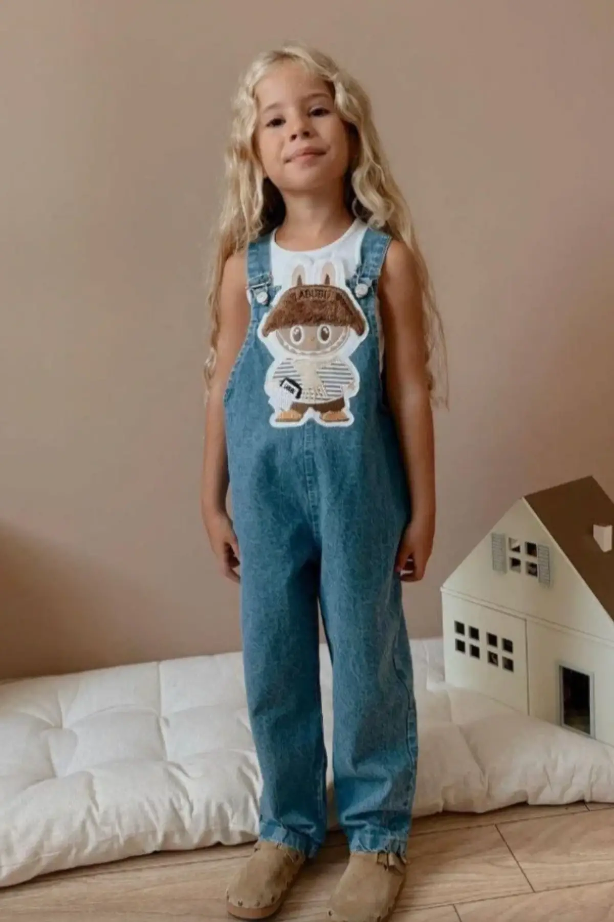 Çocuk Unisex Labubu Kabartma Baskılı Kot Salopet