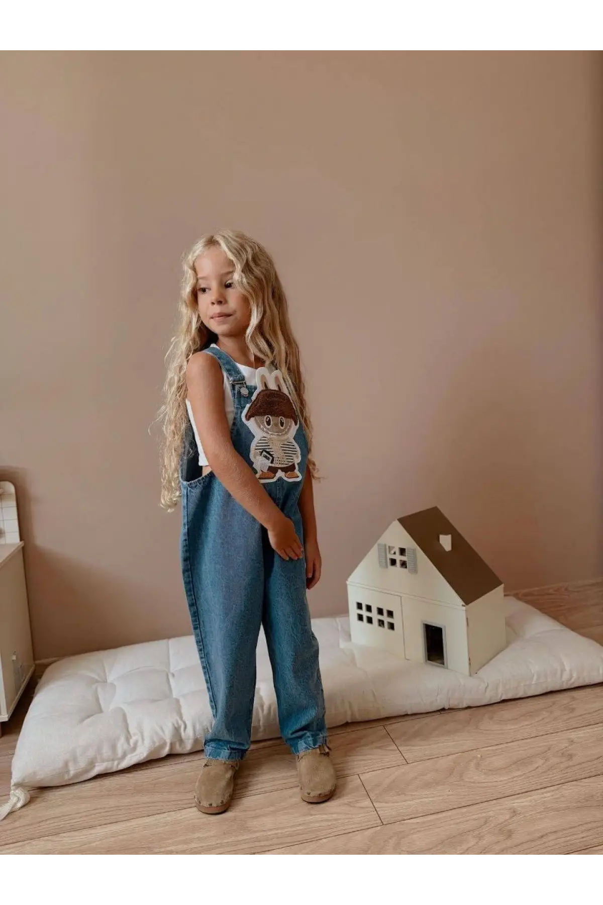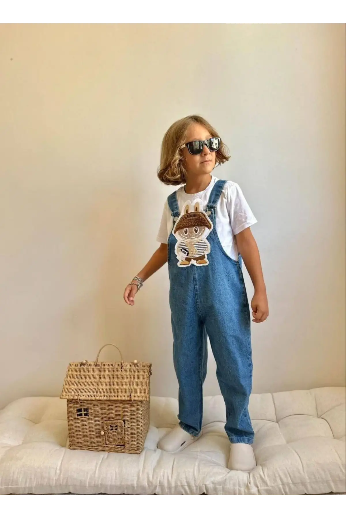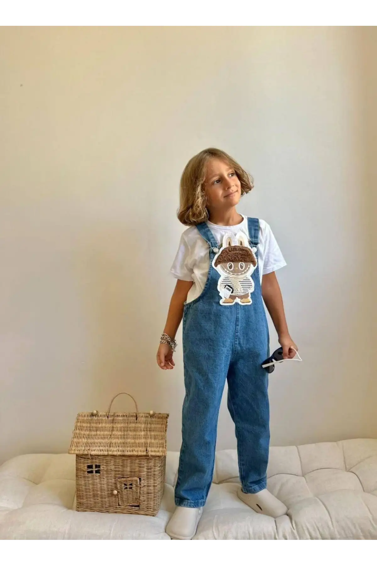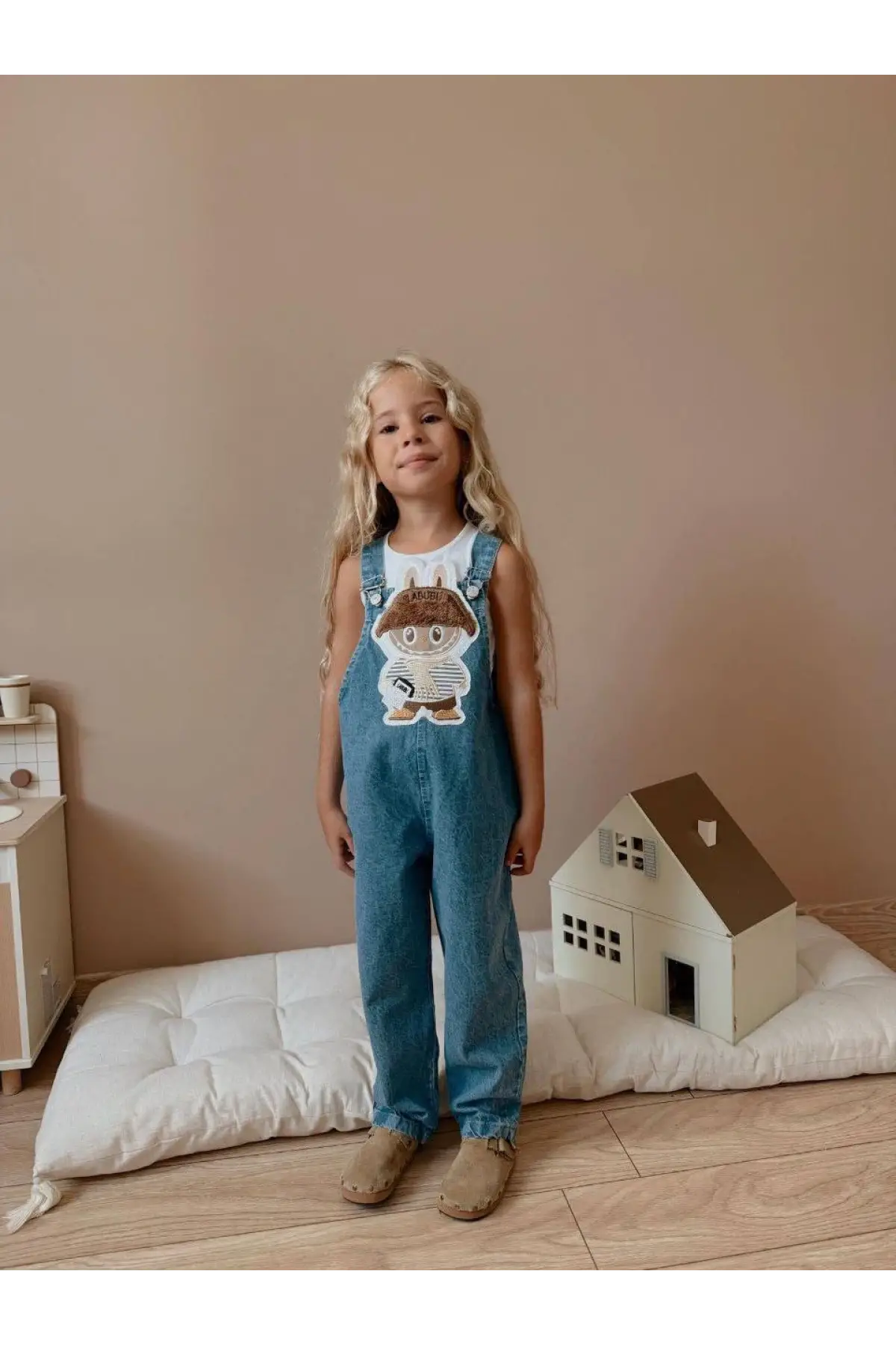 Çocuk Unisex Labubu Kabartma Baskılı Kot Salopet