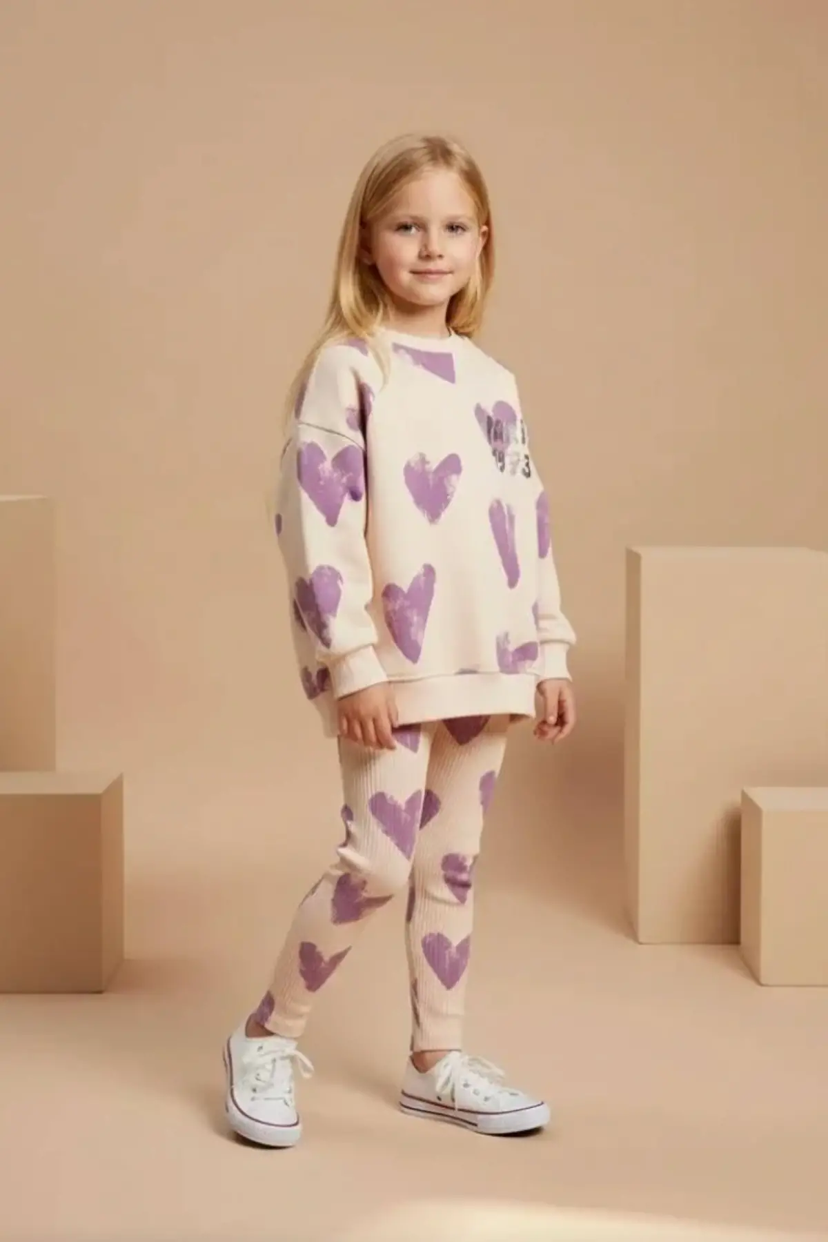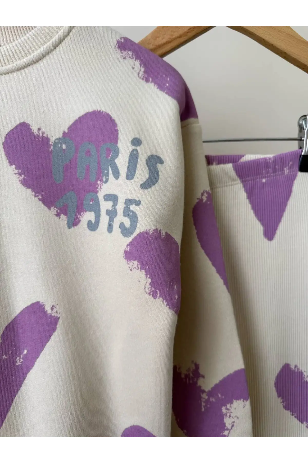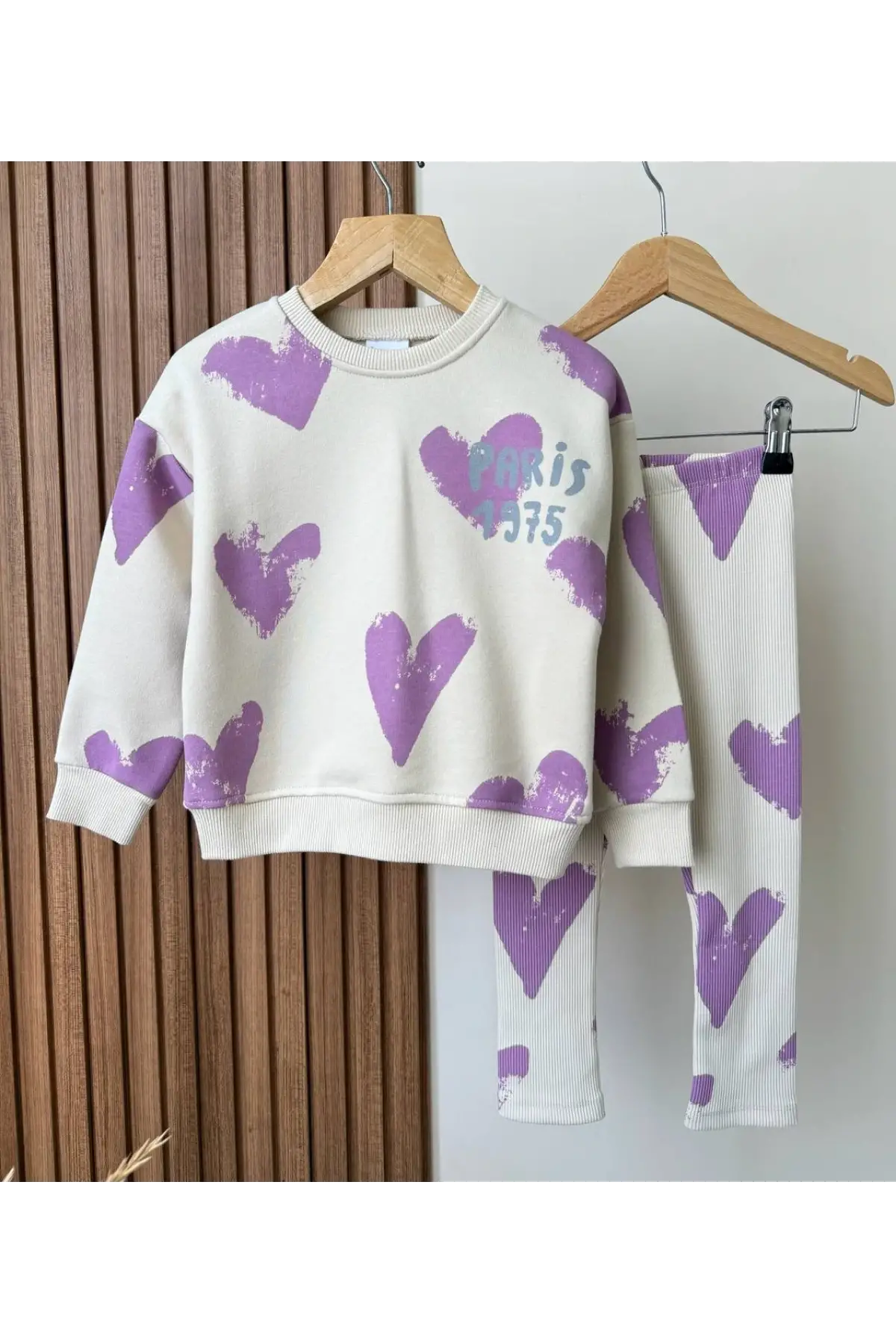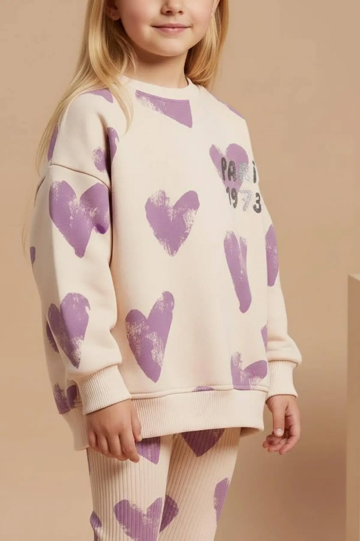 Kız Çocuk Kalp Baskılı %100 Pamuk Mor Taytlı Takım