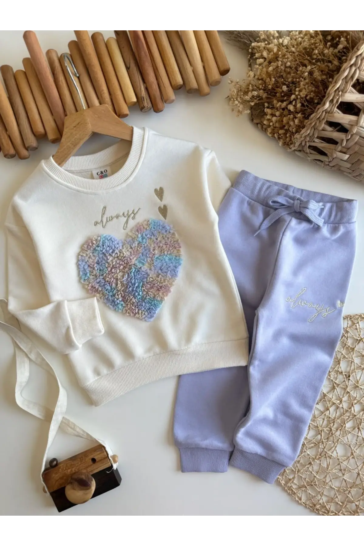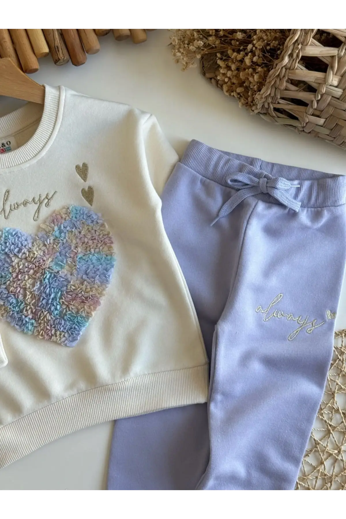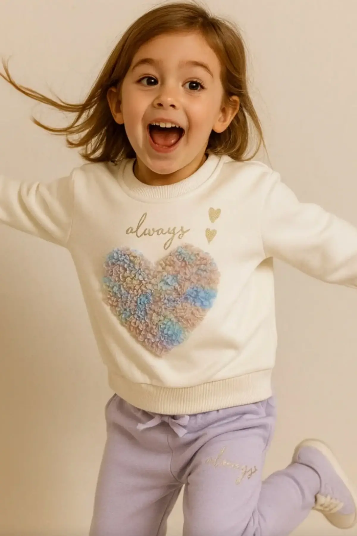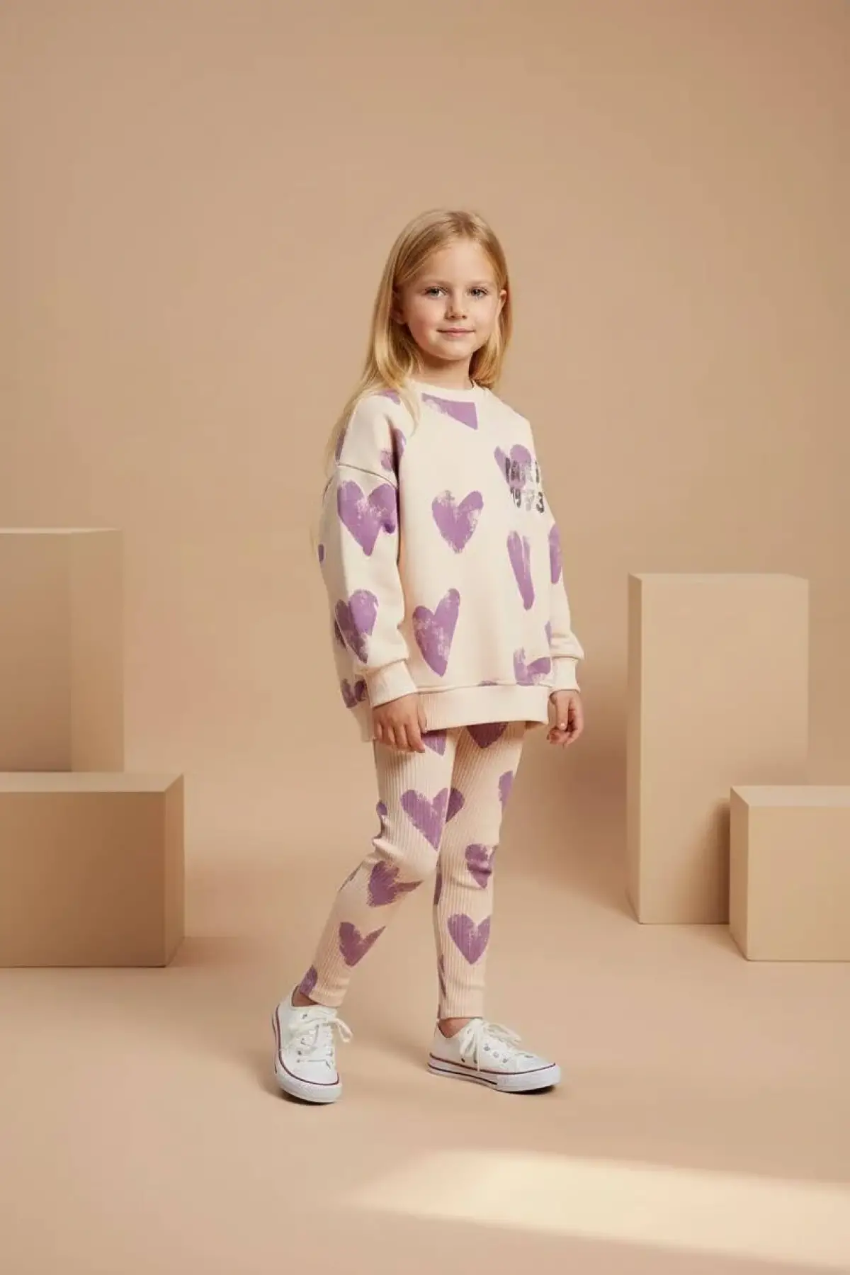 Kız Çocuk Kalp Baskılı %100 Pamuk Mor Taytlı Takım