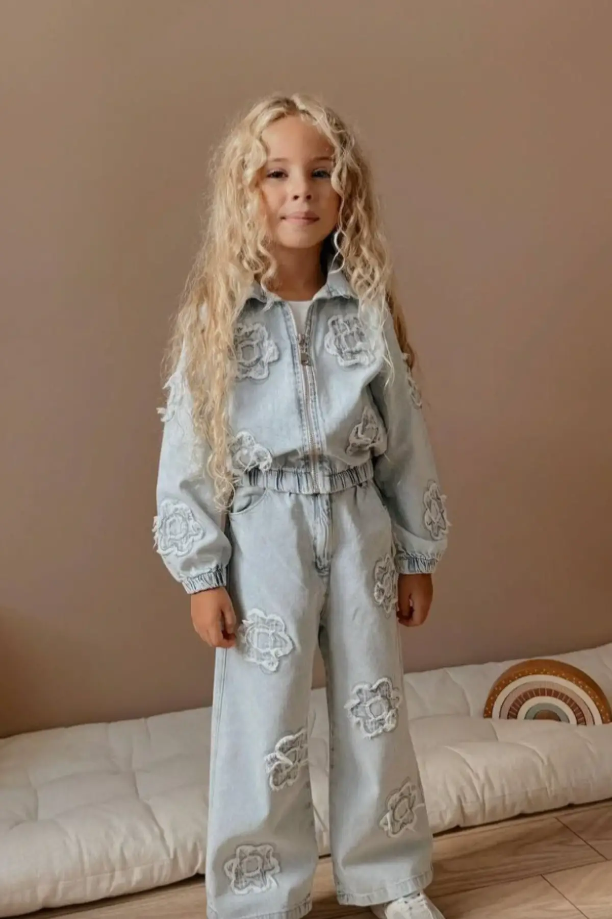Kız Çocuk Çiçek Desenli Kot Alt-Üst Takım