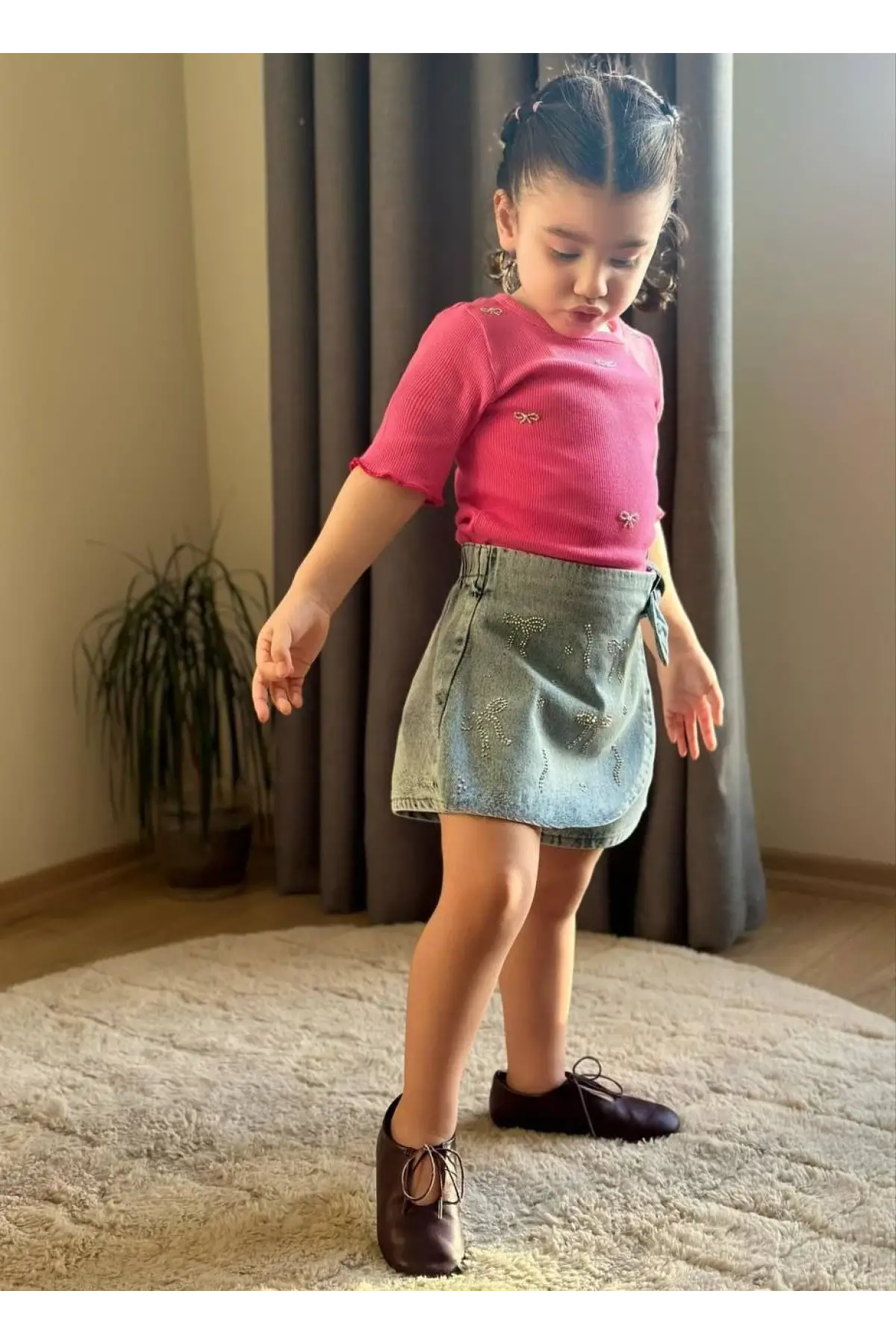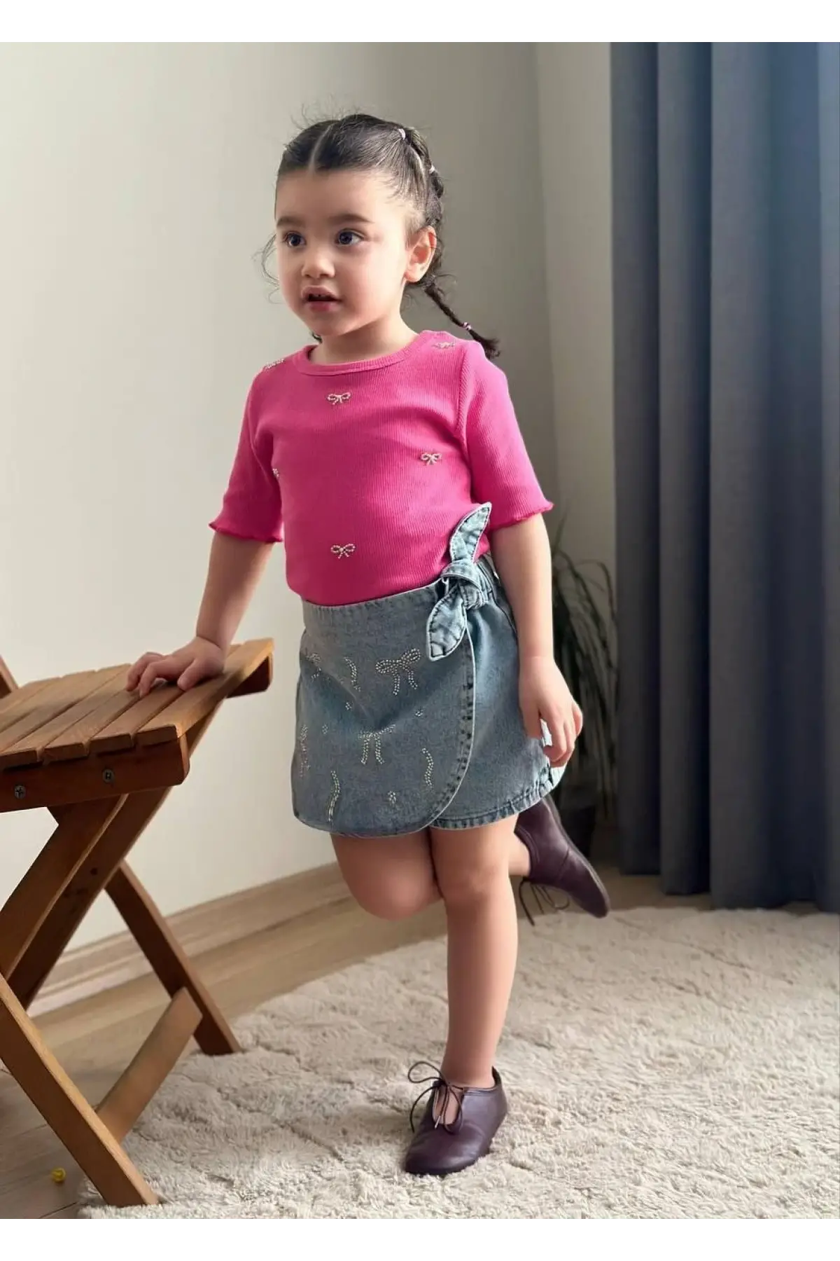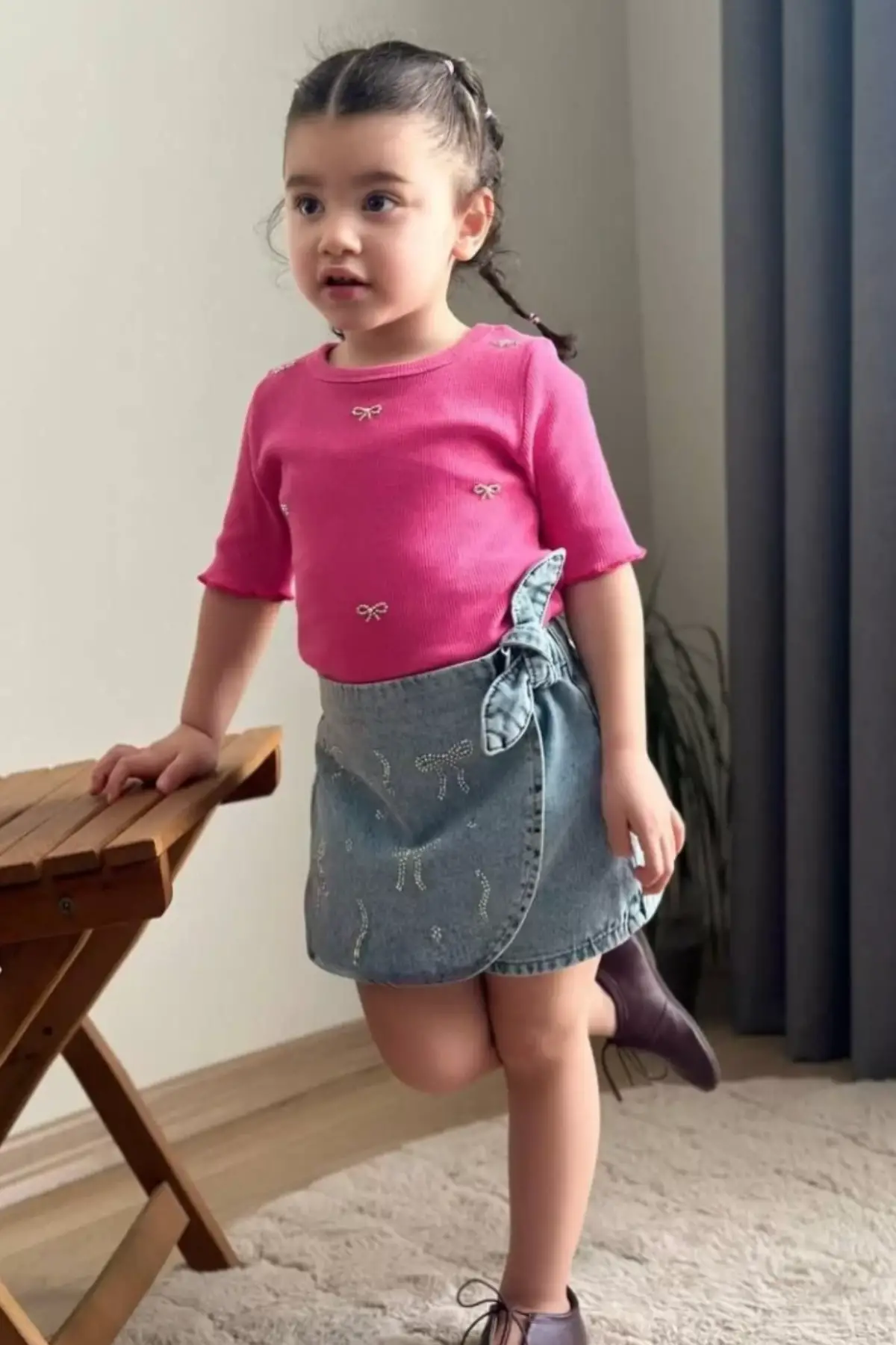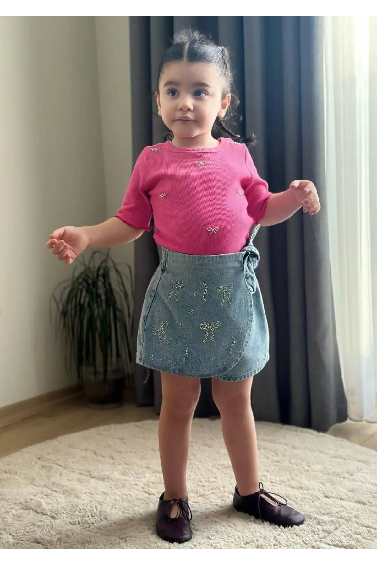 Kız Çocuk Kalp Detaylı Pembe Kot Şort Etekli Takım