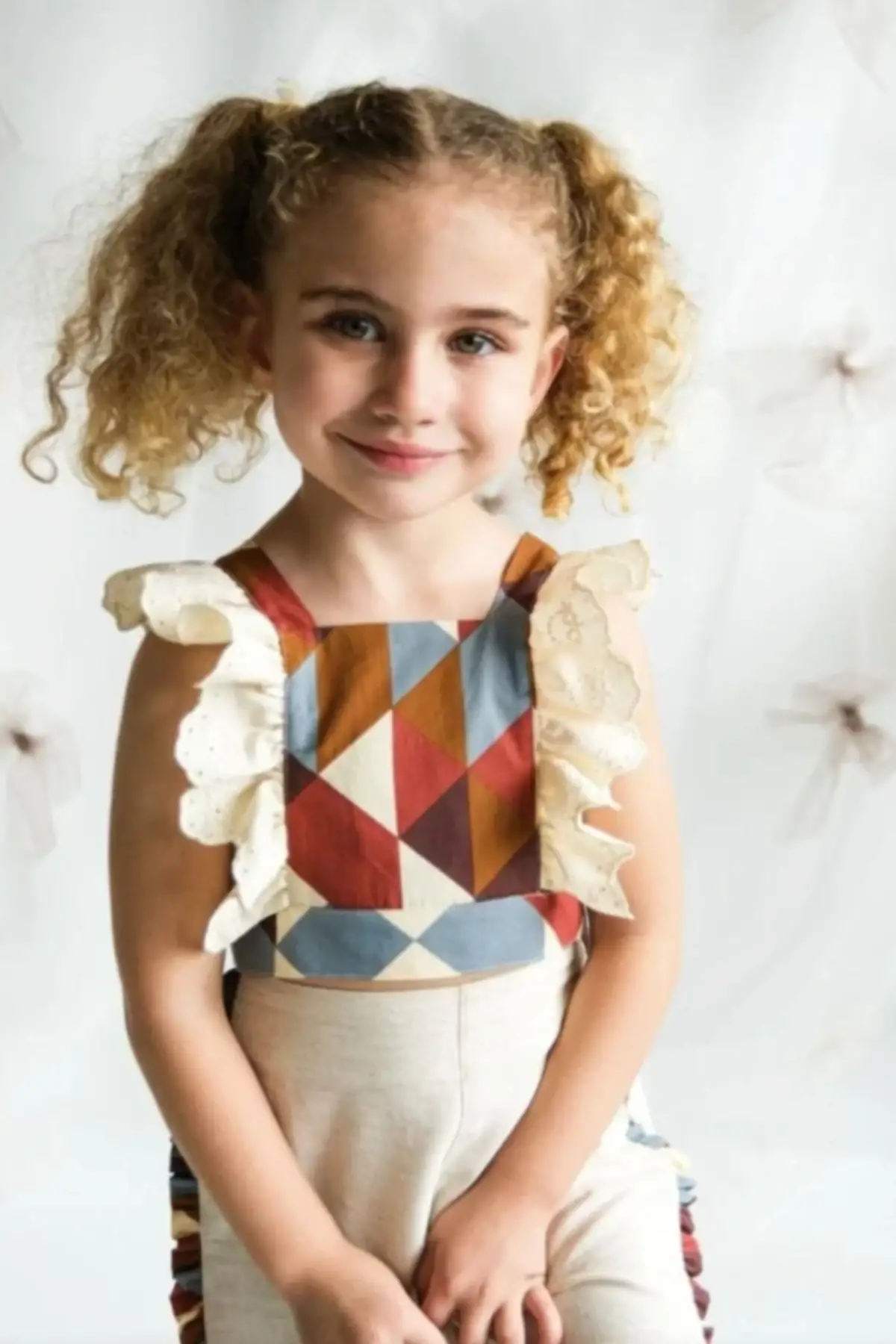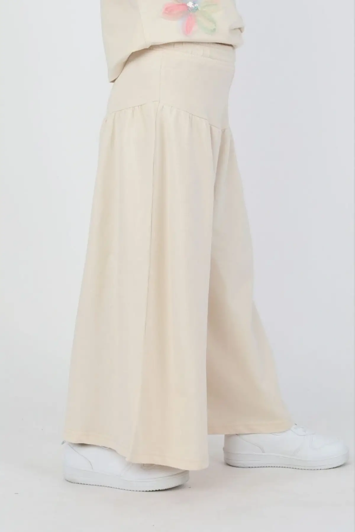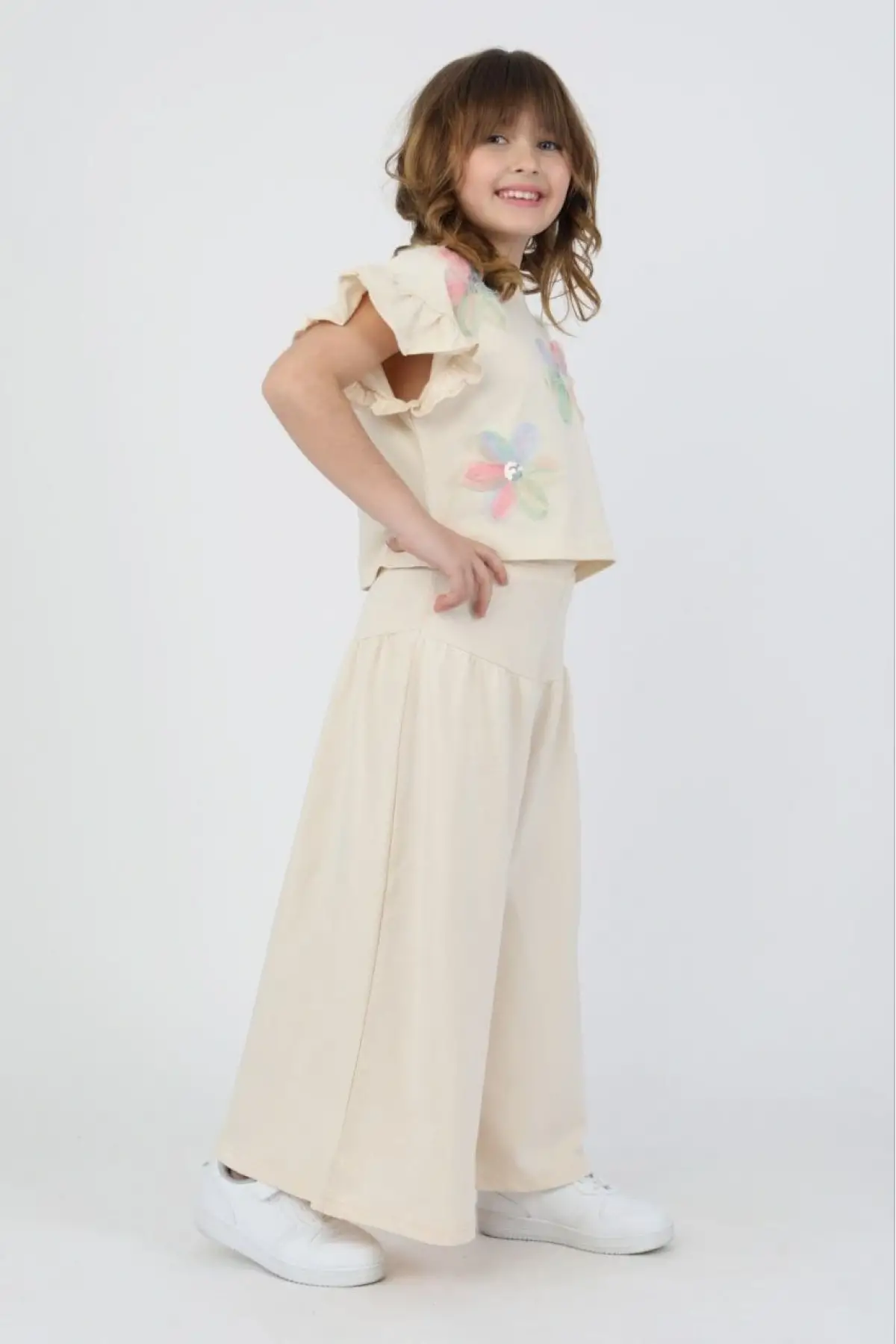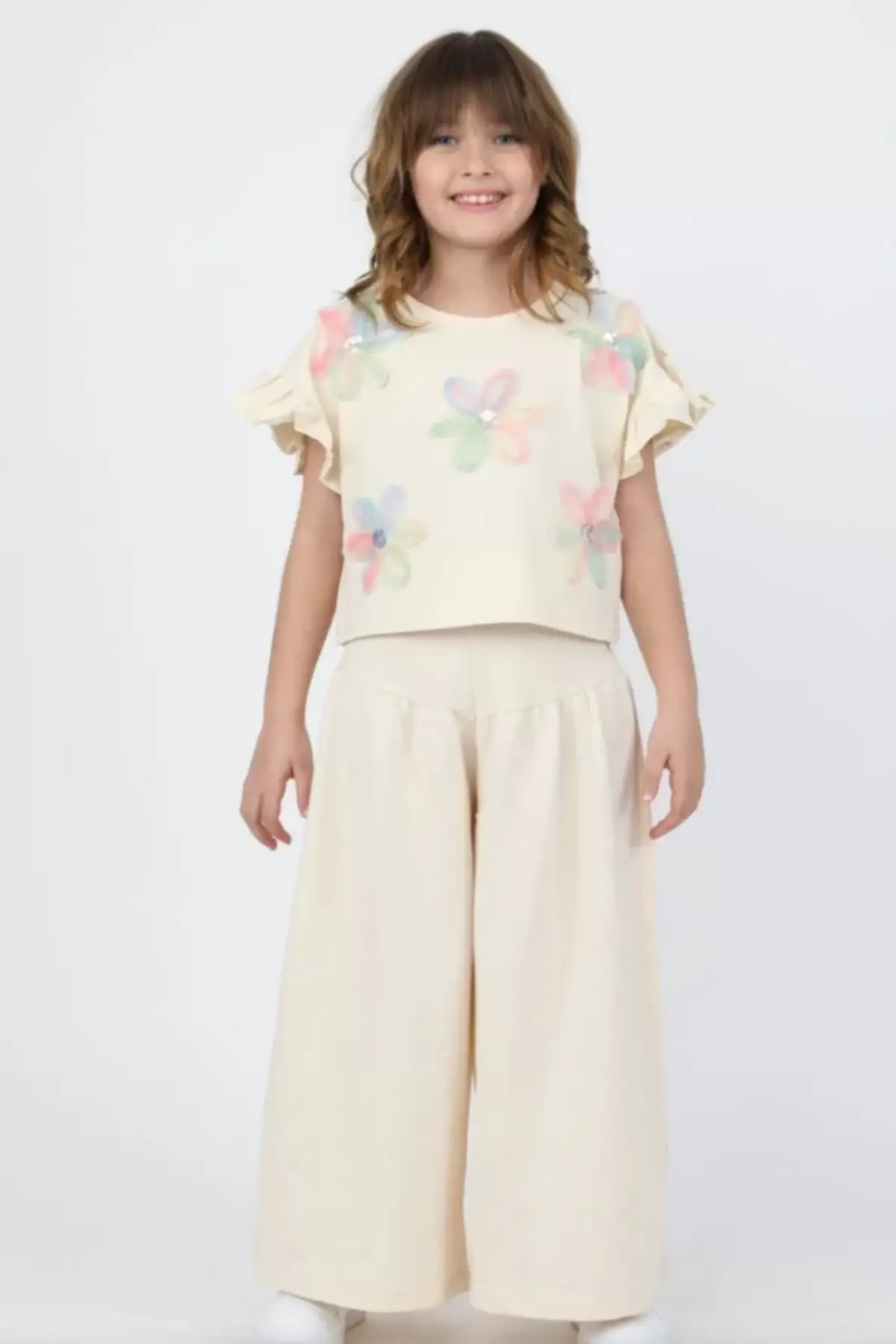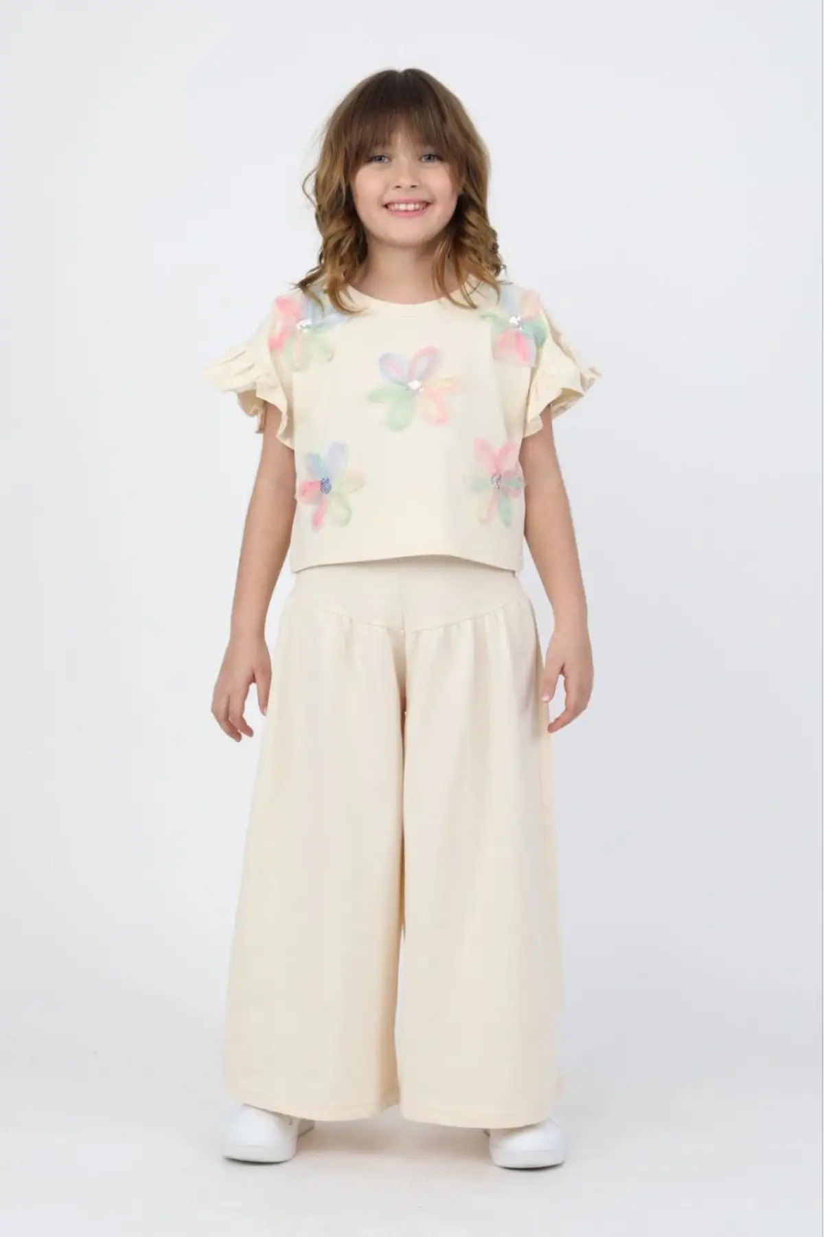 Kız Çocuk Çiçek Detaylı Krem Bol Paça Takım