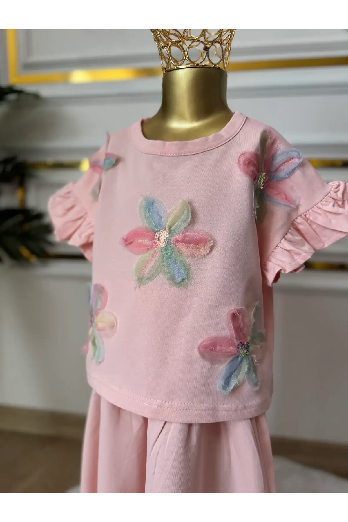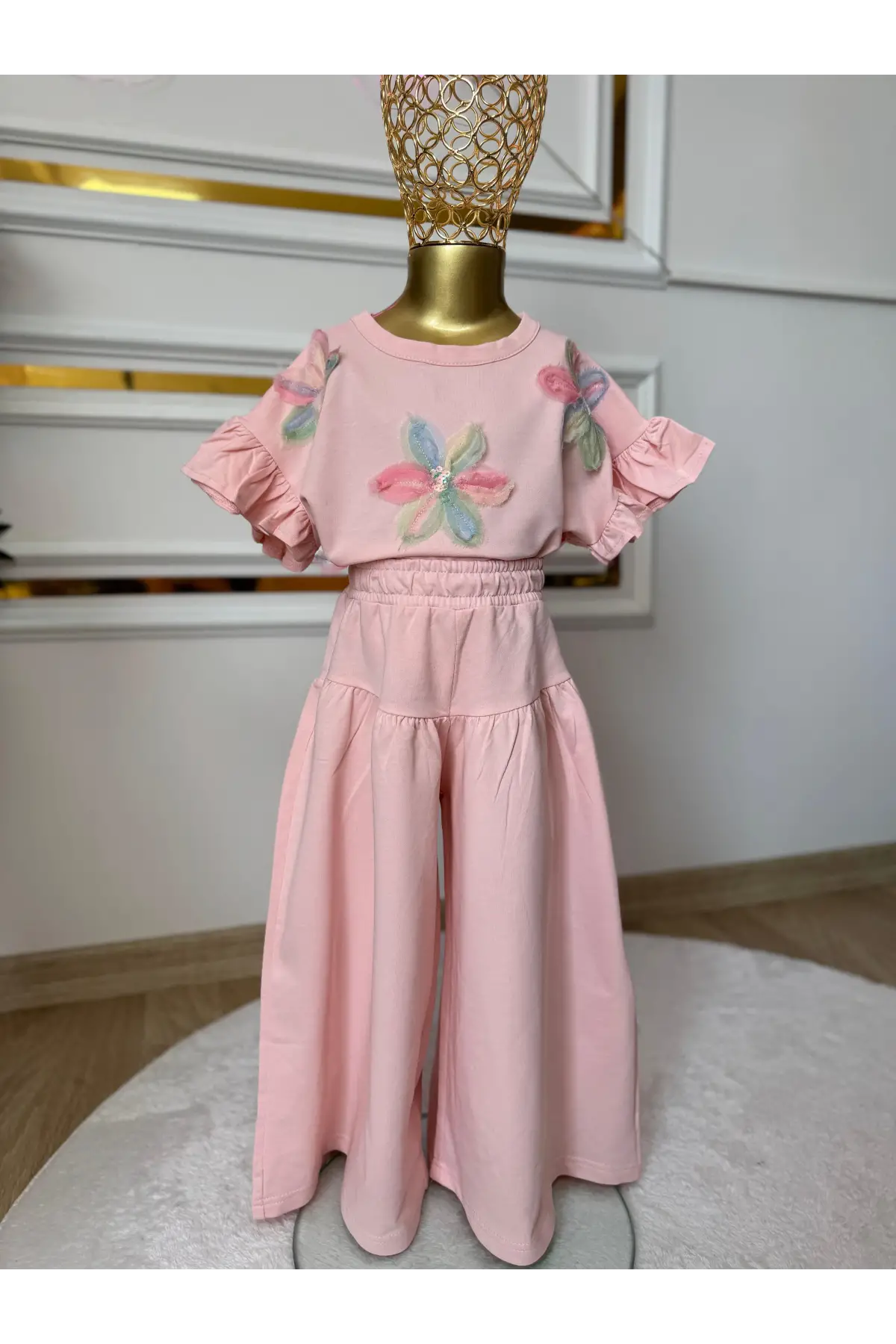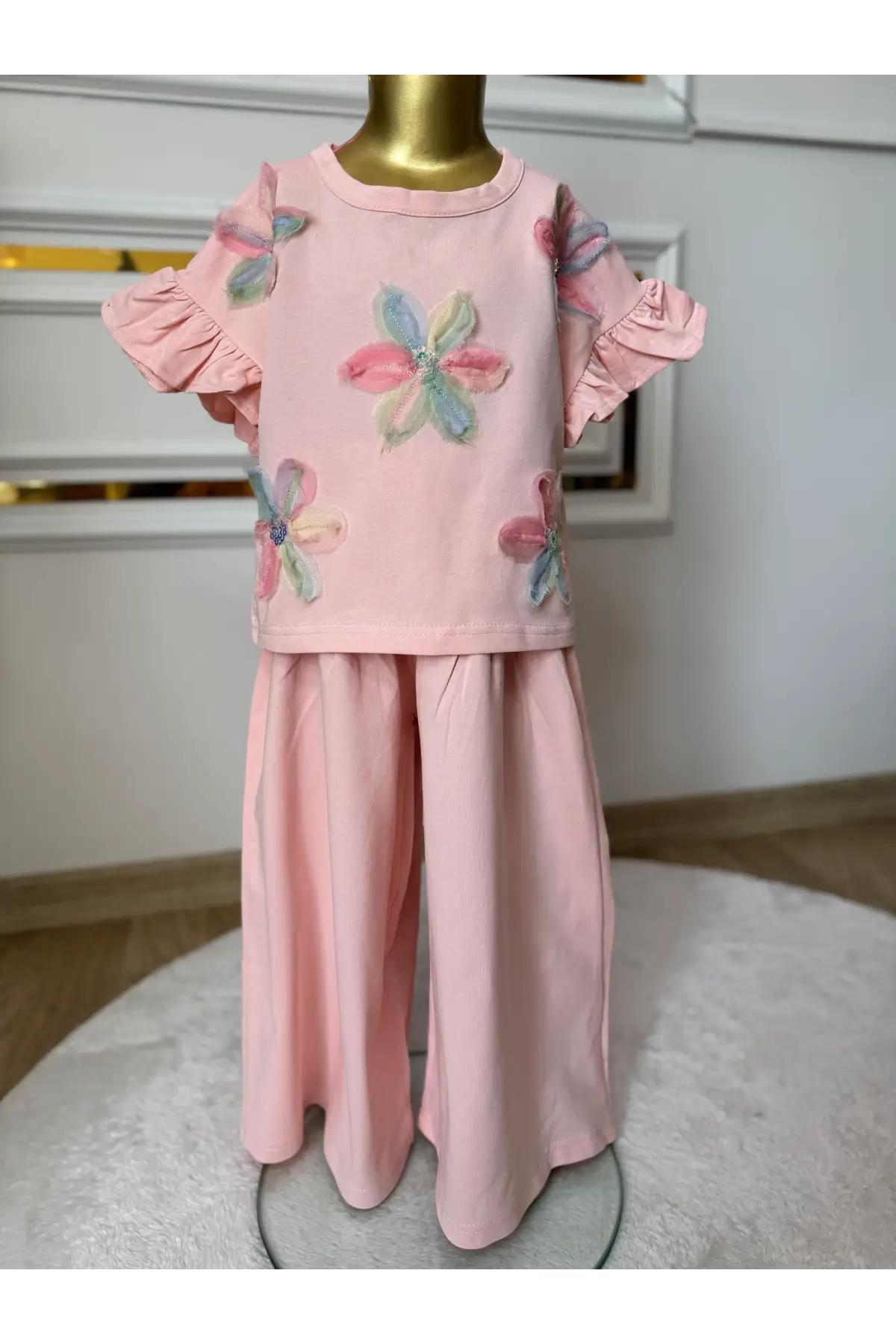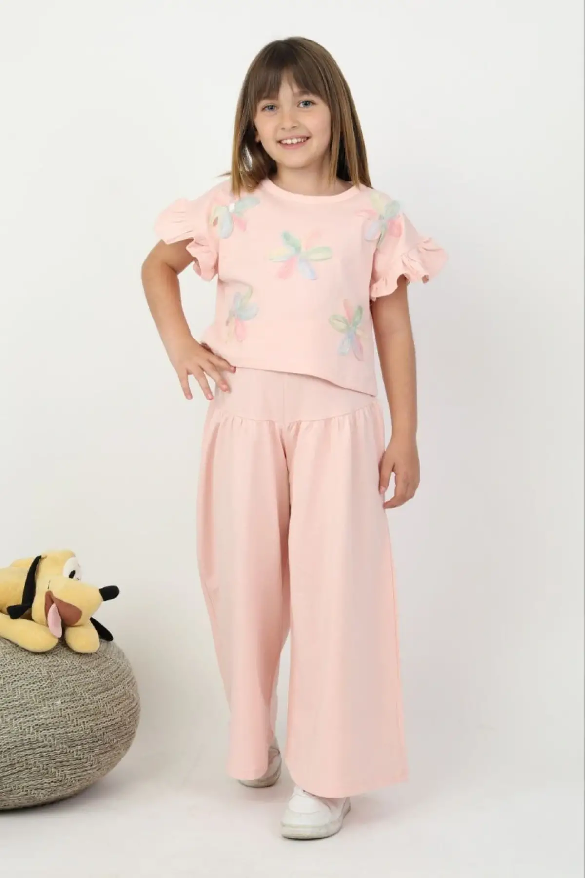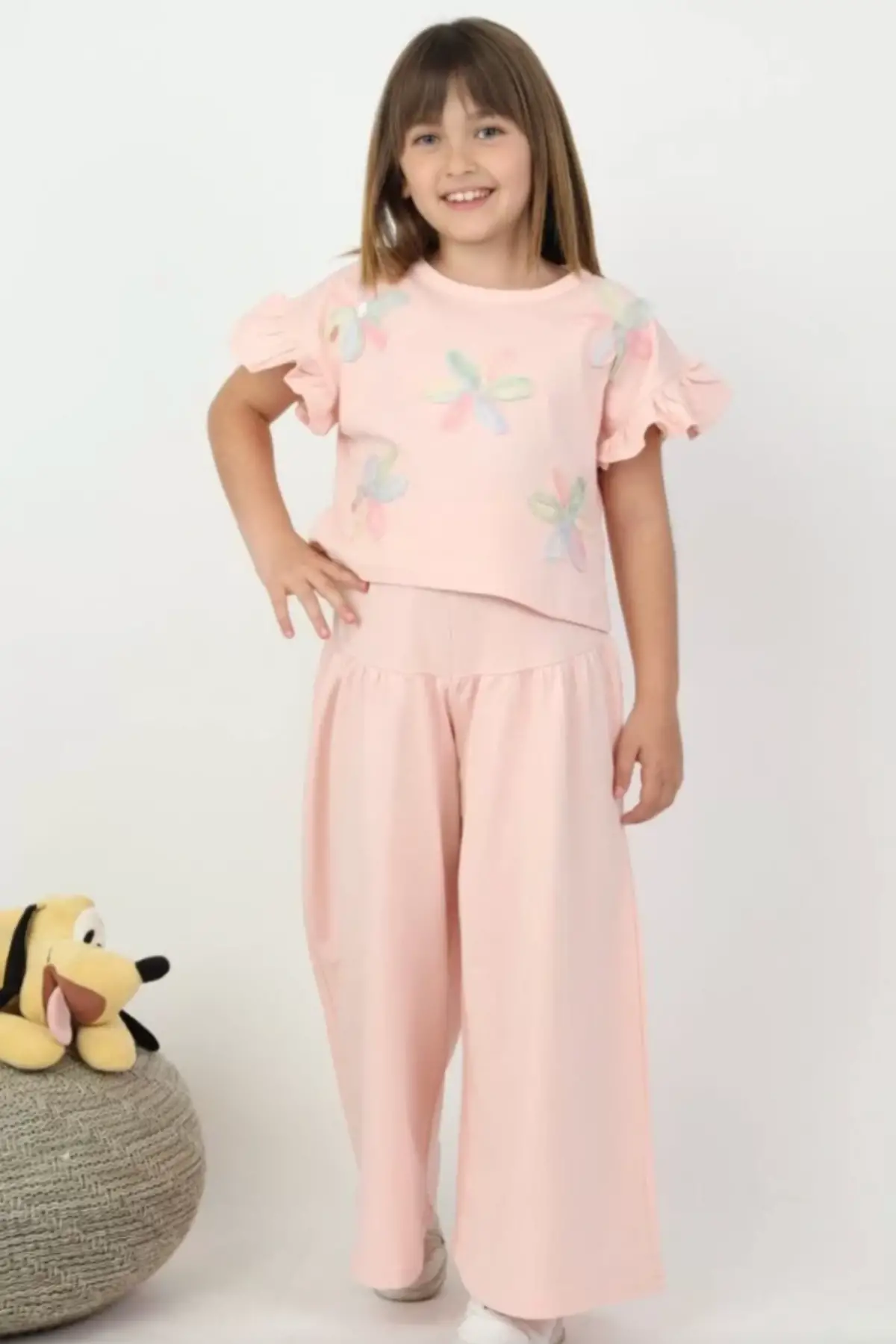 Kız Çocuk Çiçek Detaylı Pembe Bol Paça Takım