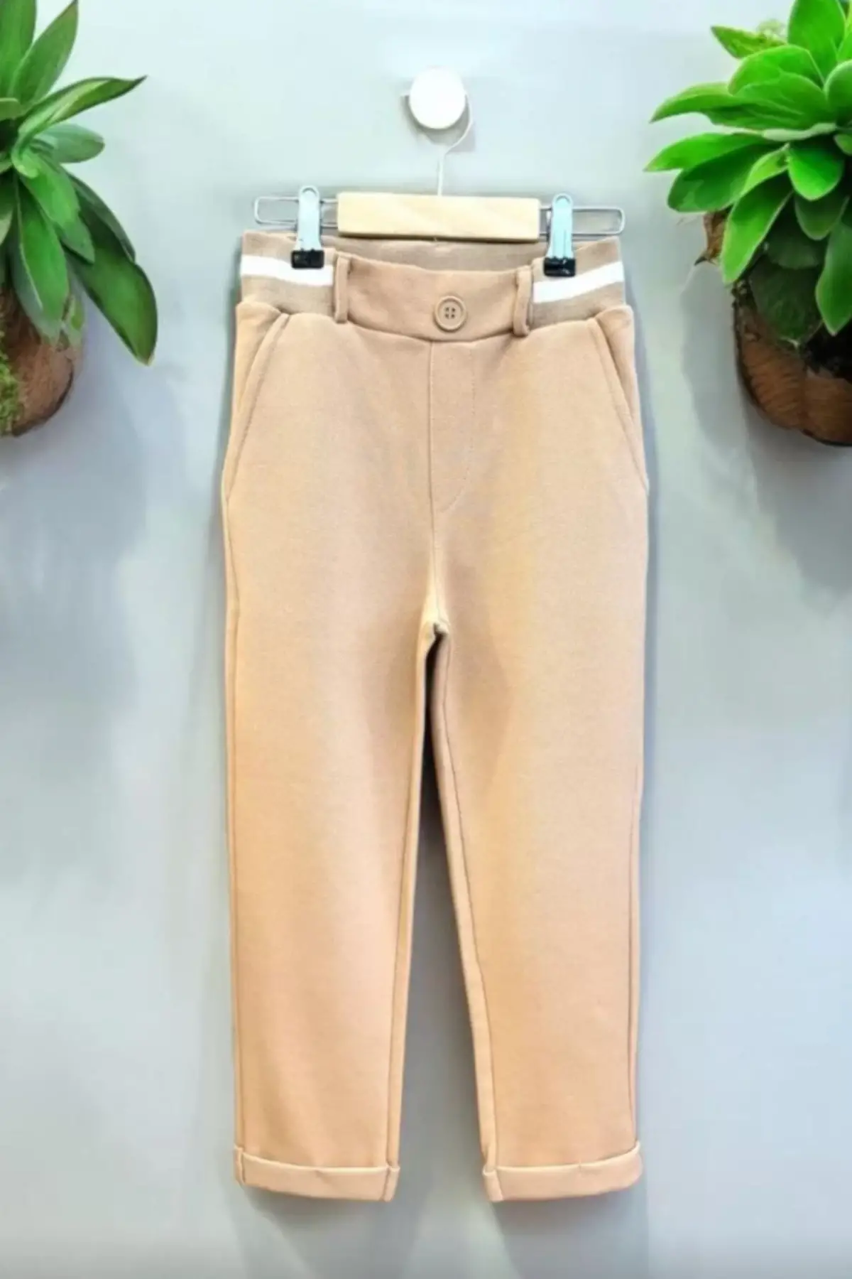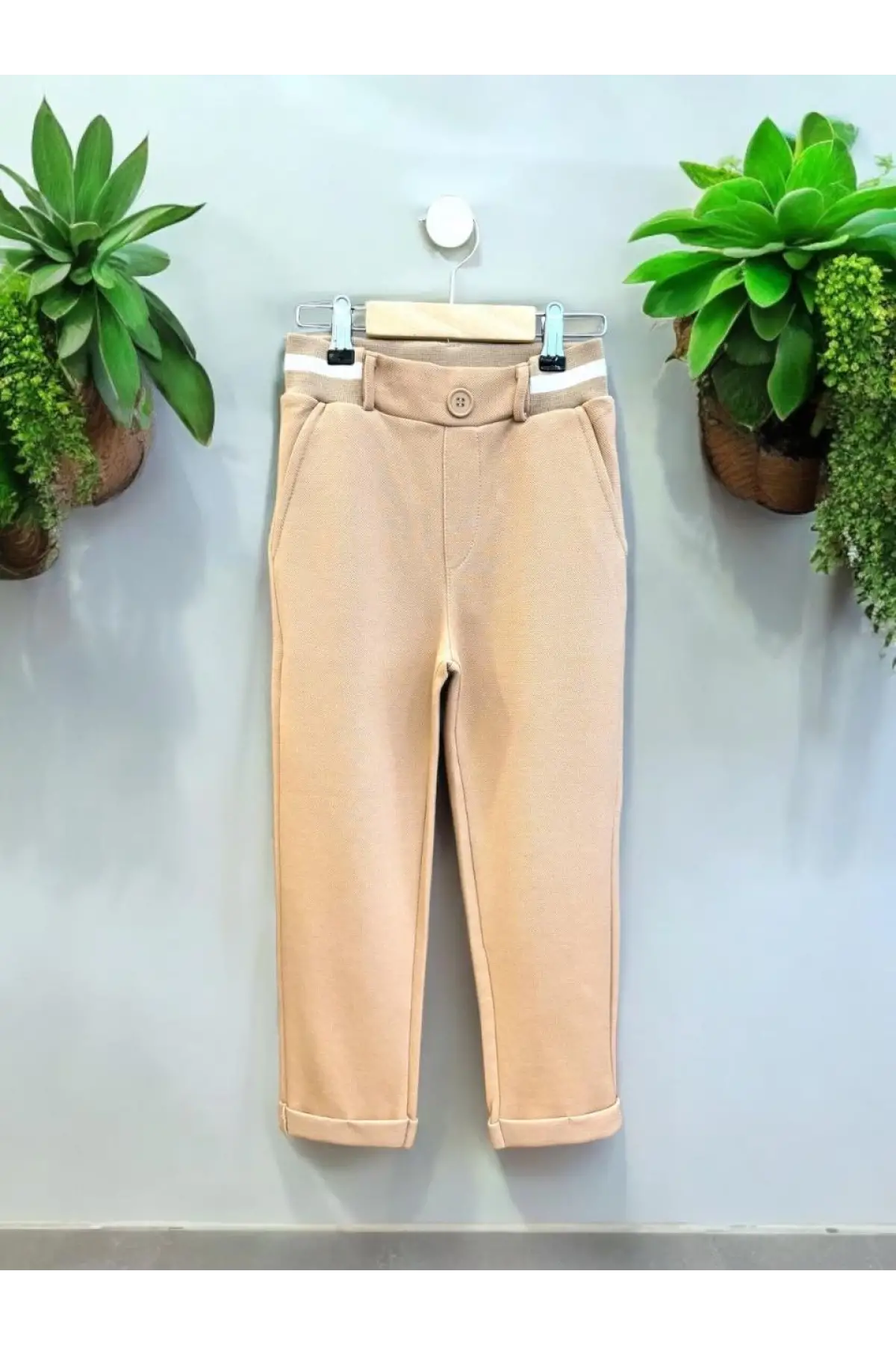 Çocuk Kemer Detaylı Gofre Kumaş Taba Pantolon