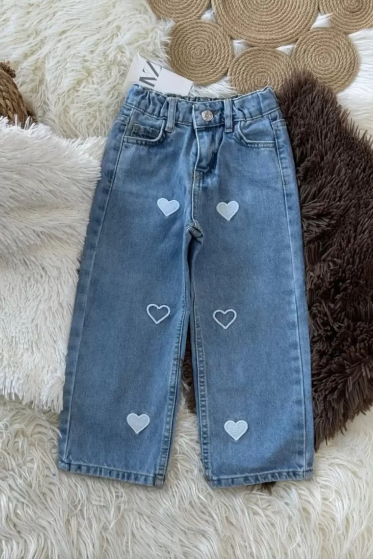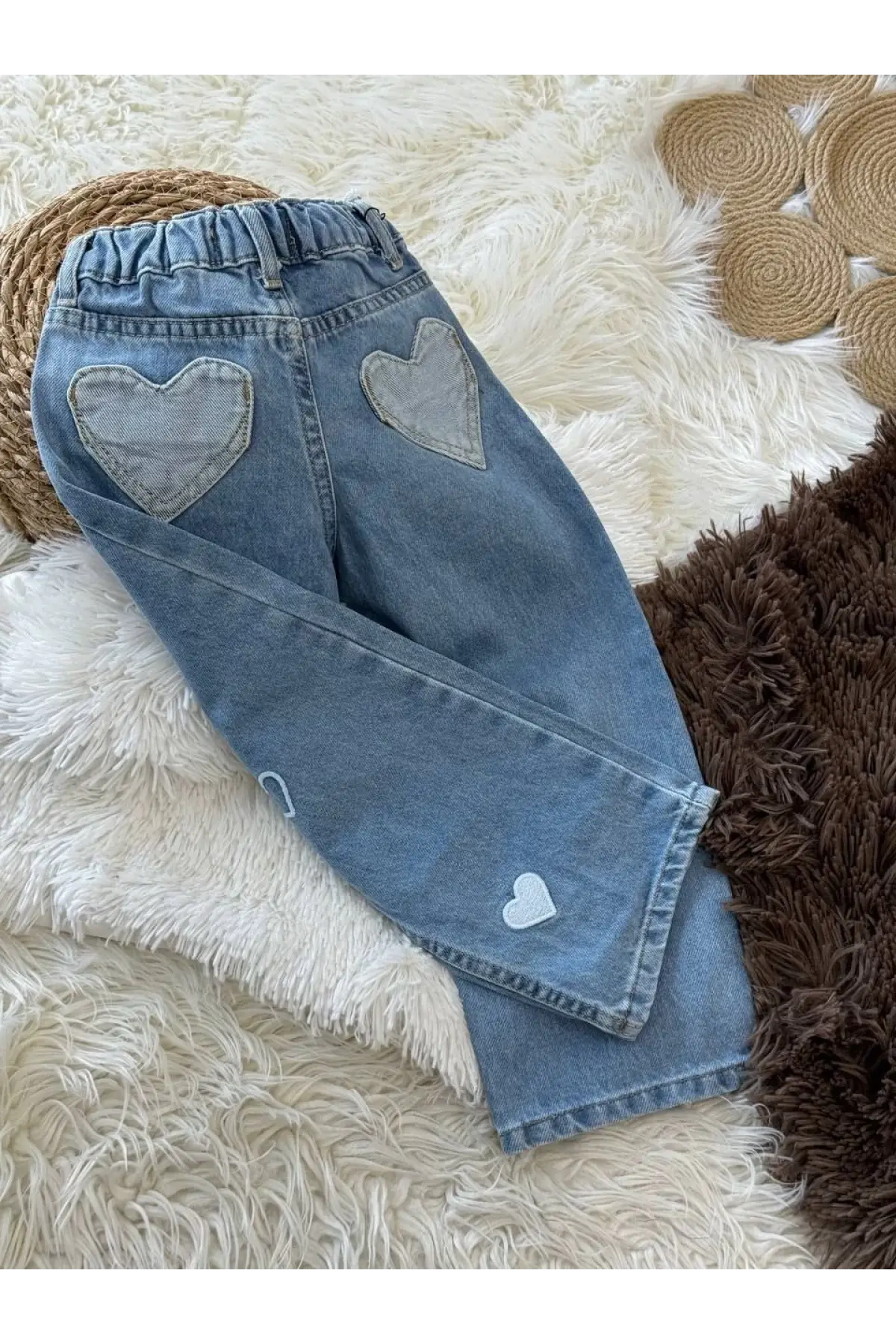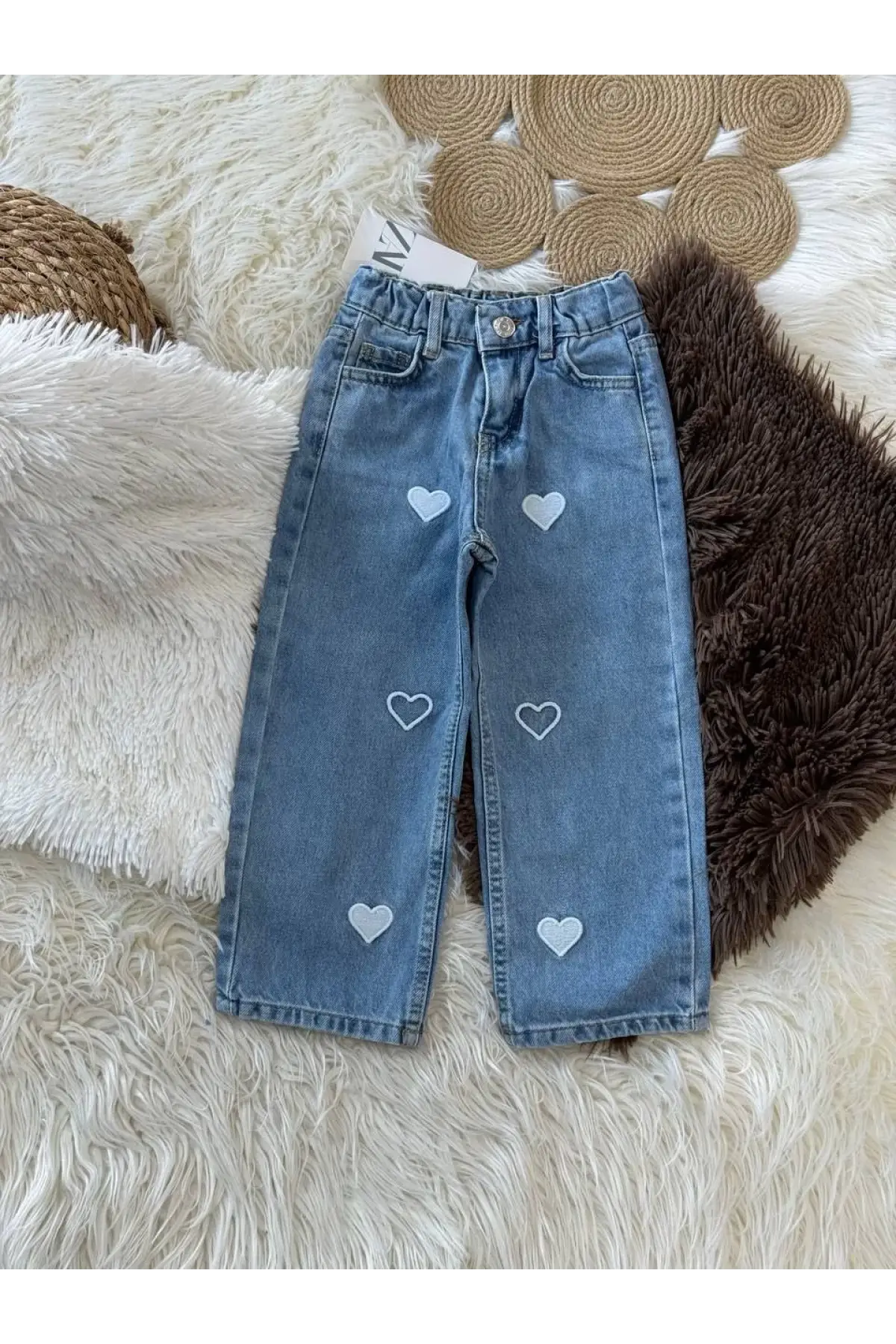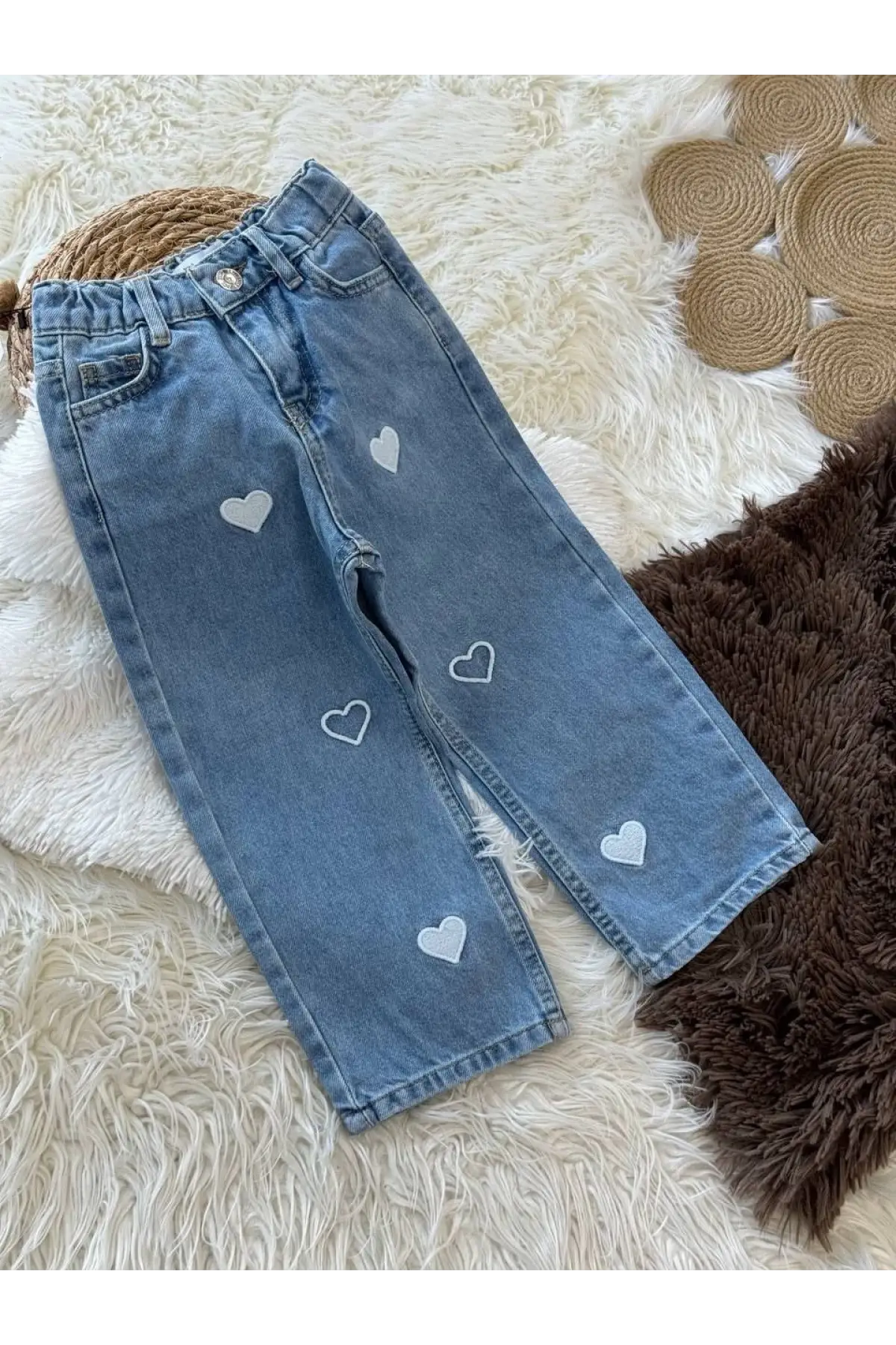 Kız Çocuk Kalp Detaylı Bol Paça Kot Pantolon