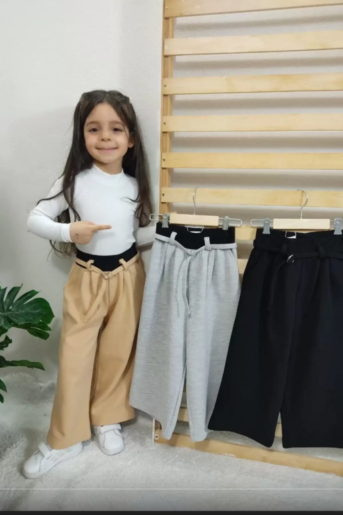 Kız Çocuk Gofre Kumaş Kemerli Bol Paça Pantolon