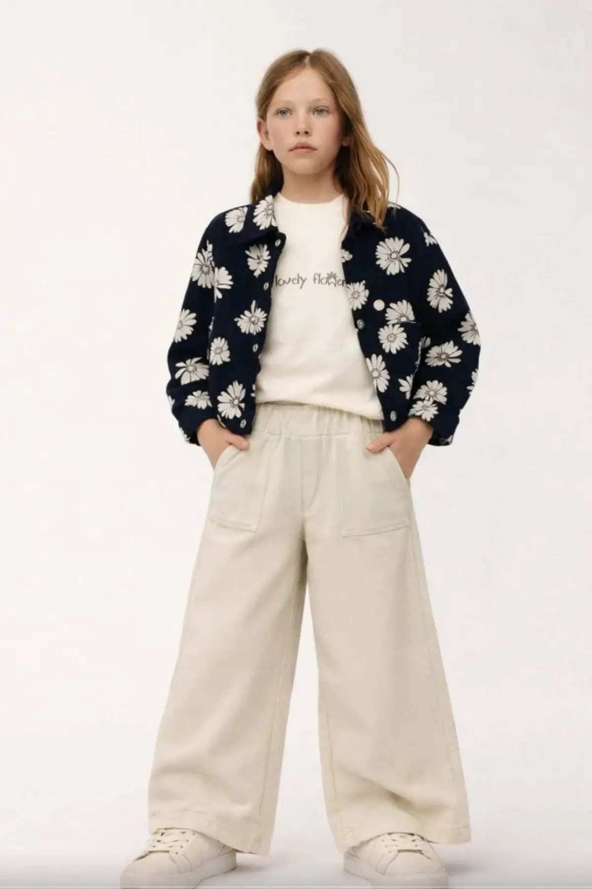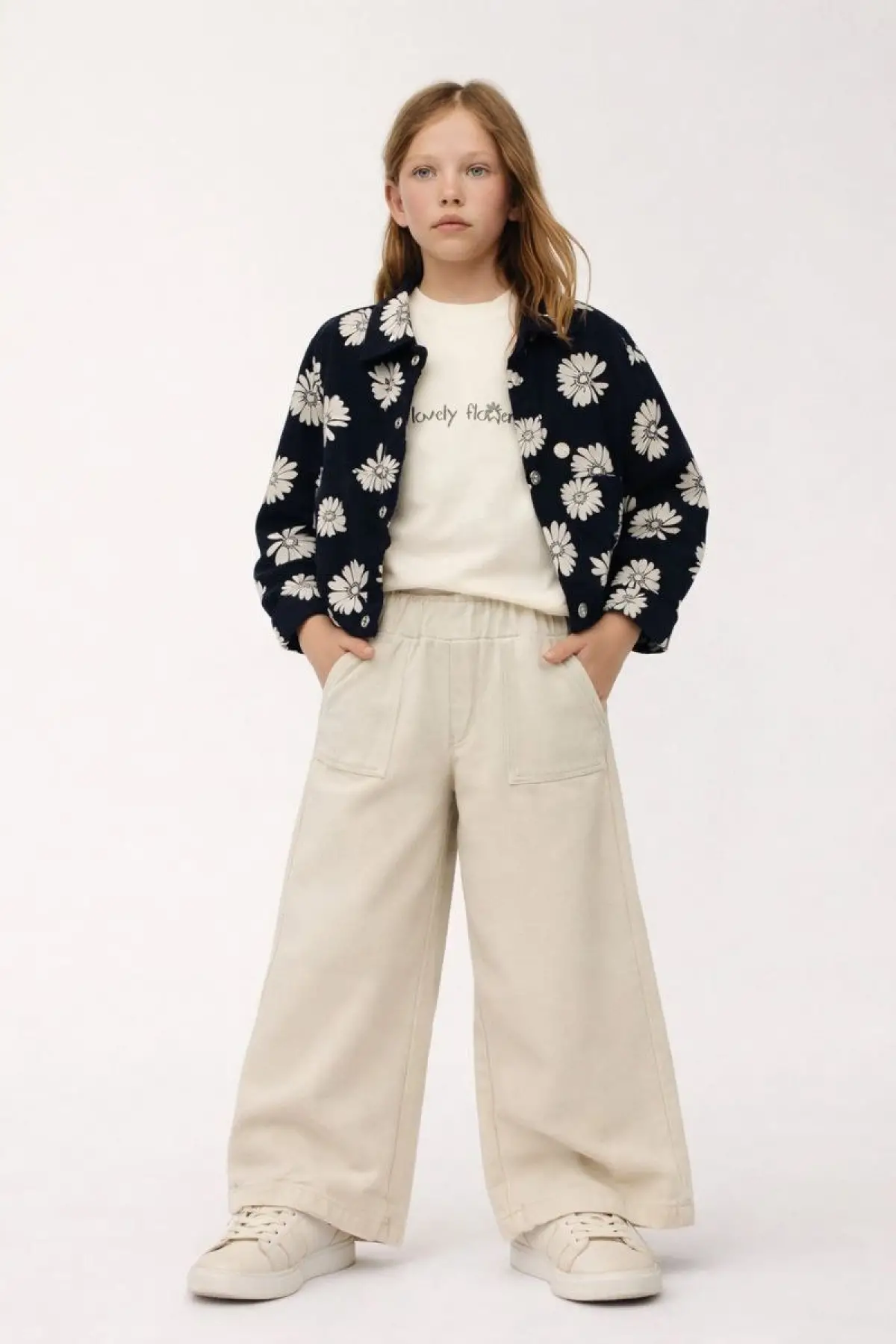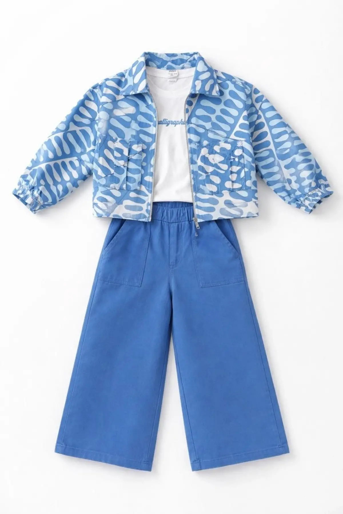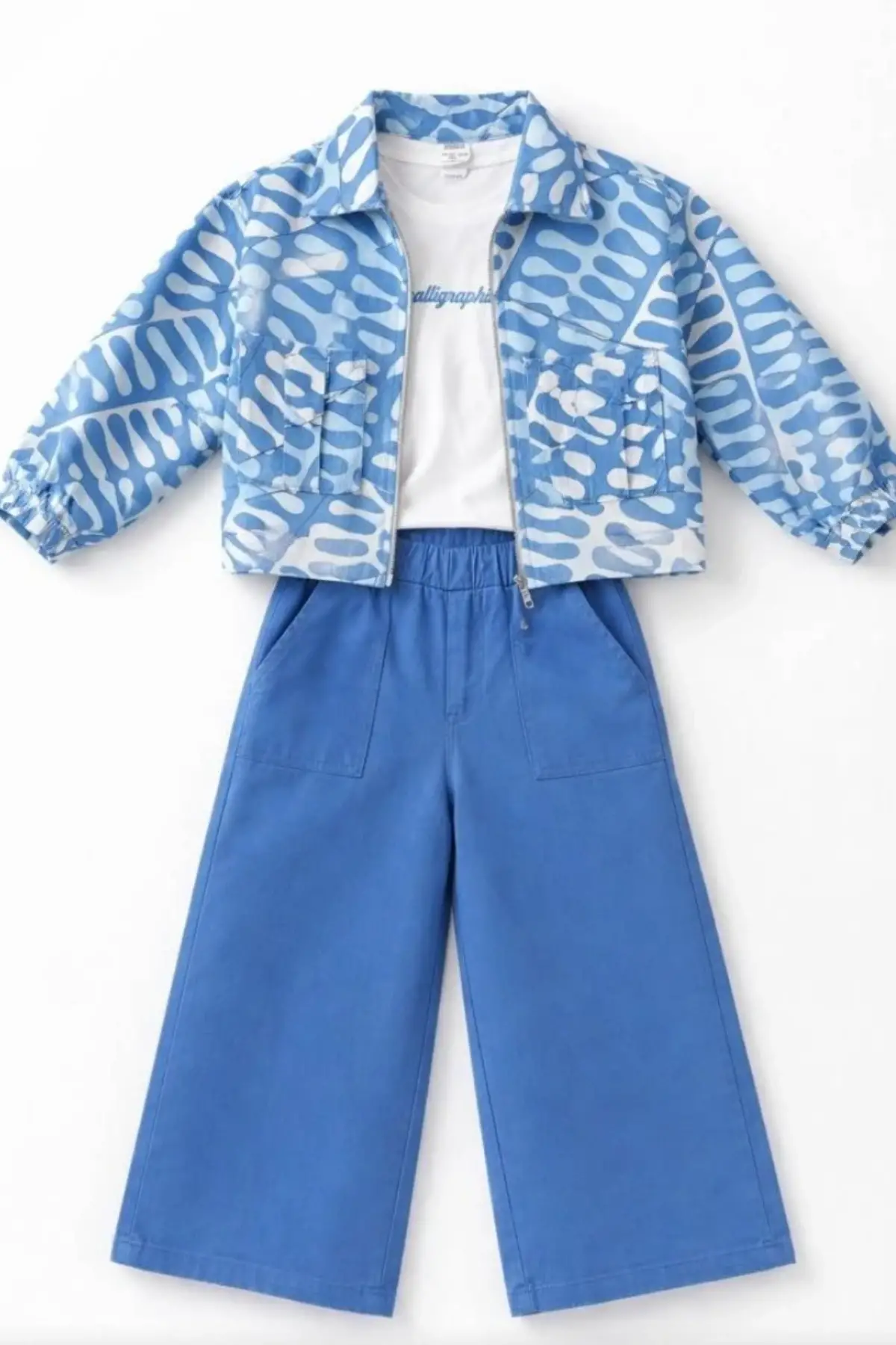 Kız Çocuk Ceket Desenli Bol Paça Pantolon 3'lü Mavi Takım