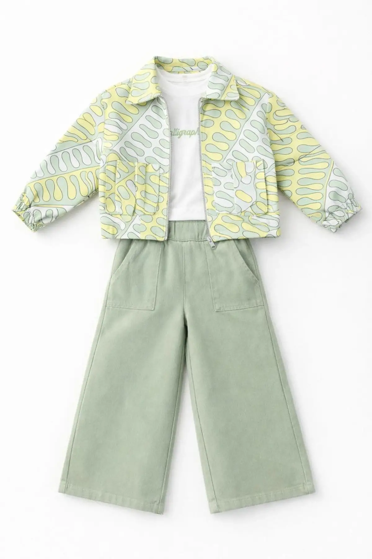 Kız Çocuk Ceket Desenli Bol Paça Pantolon 3'lü Yeşil Takım