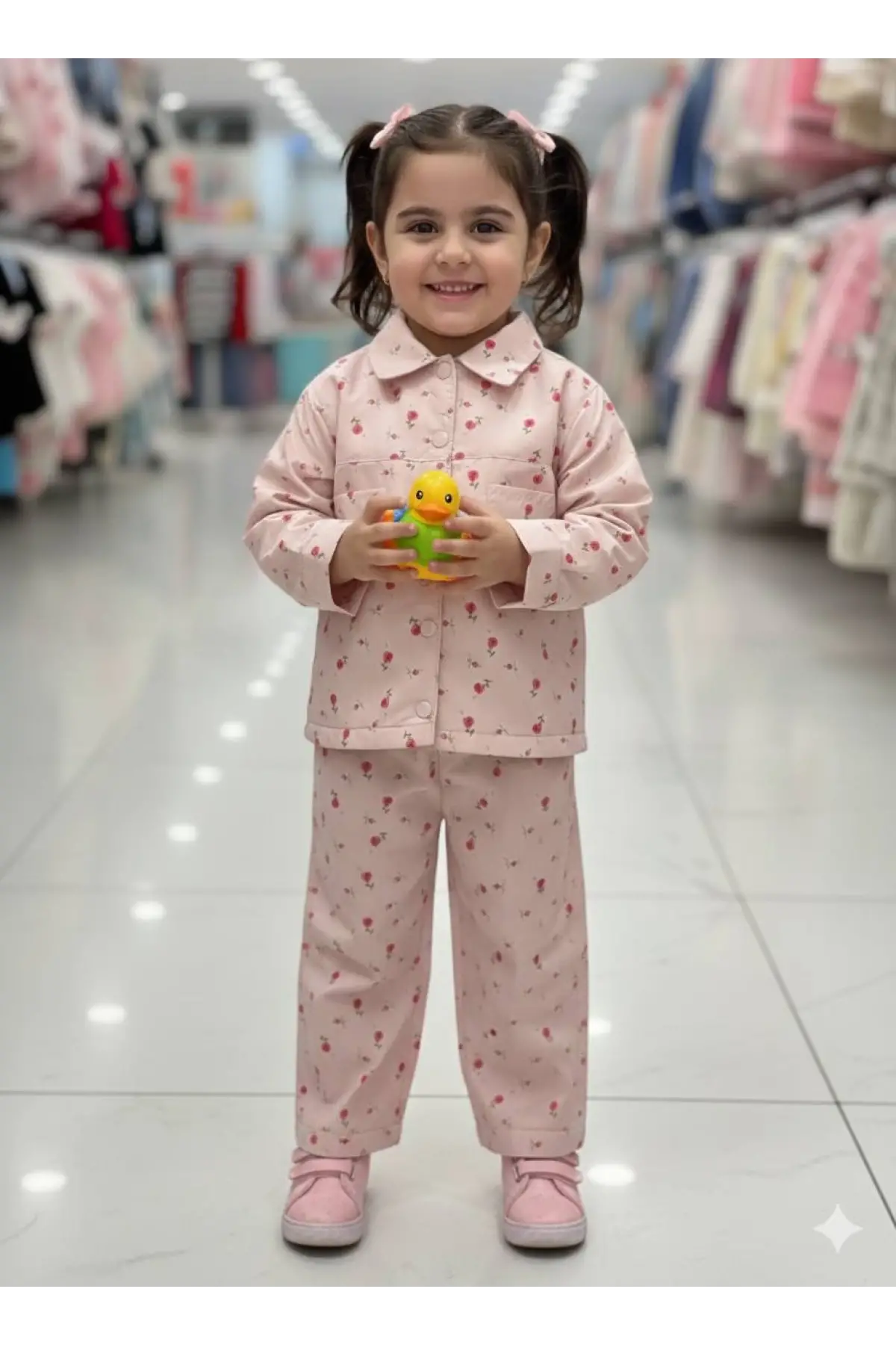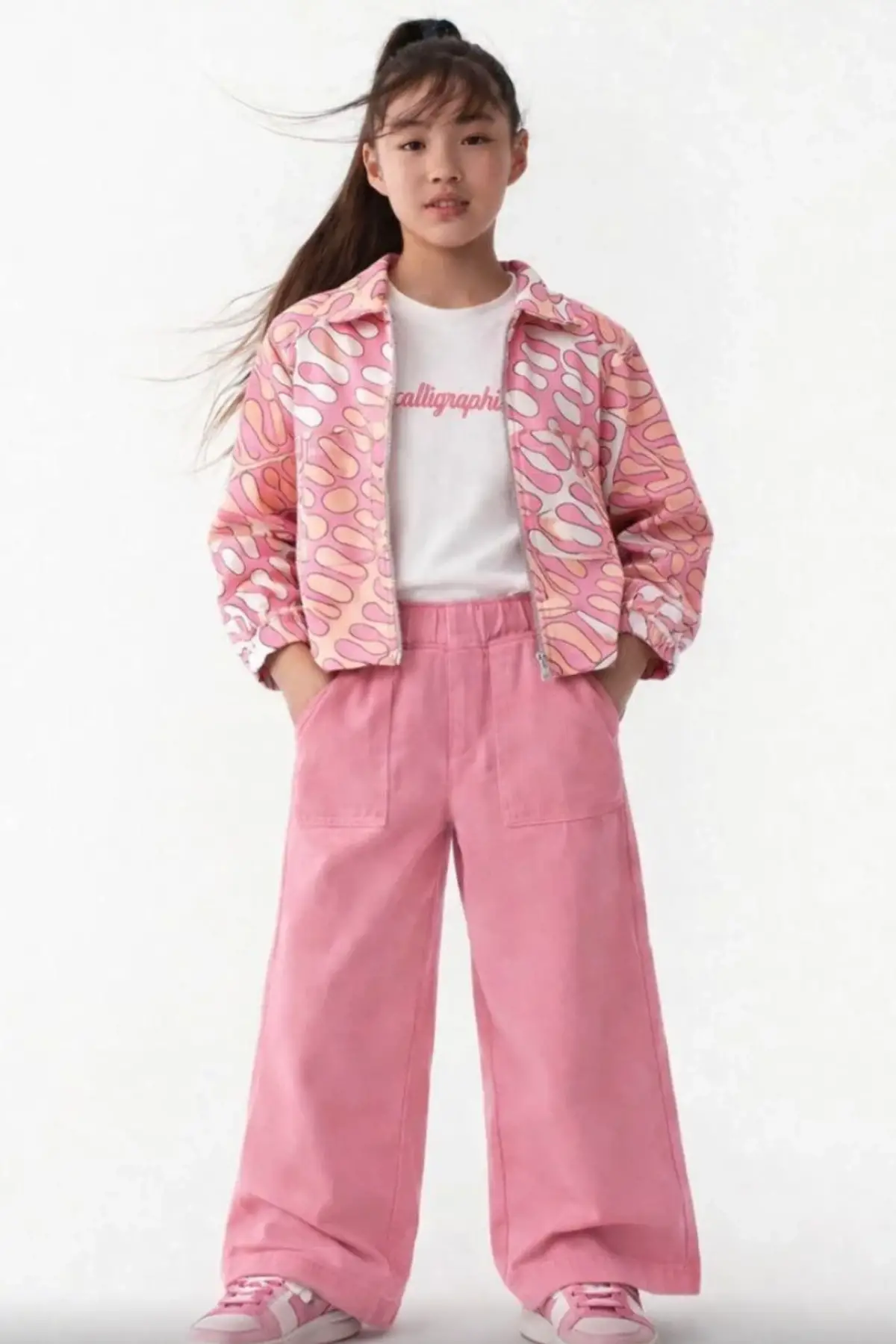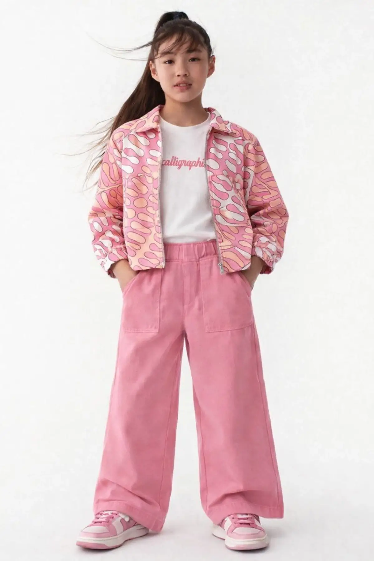 Kız Çocuk Ceket Desenli Bol Paça Pantolon 3'lü Pembe Takım
