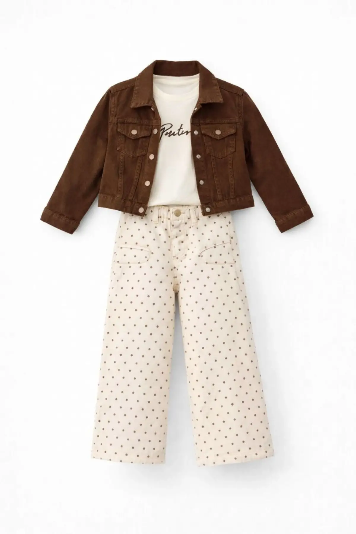 Kız Çocuk Kahverengi Ceket Puantiye Detaylı 3'lü Takım