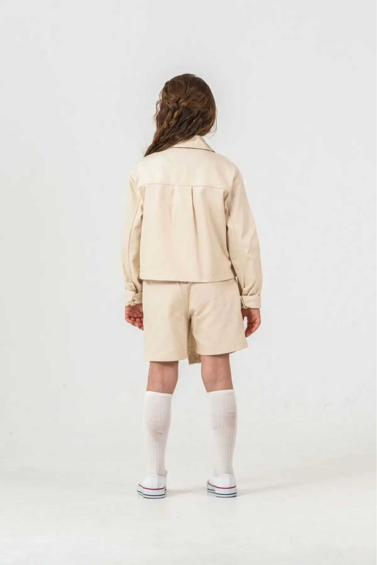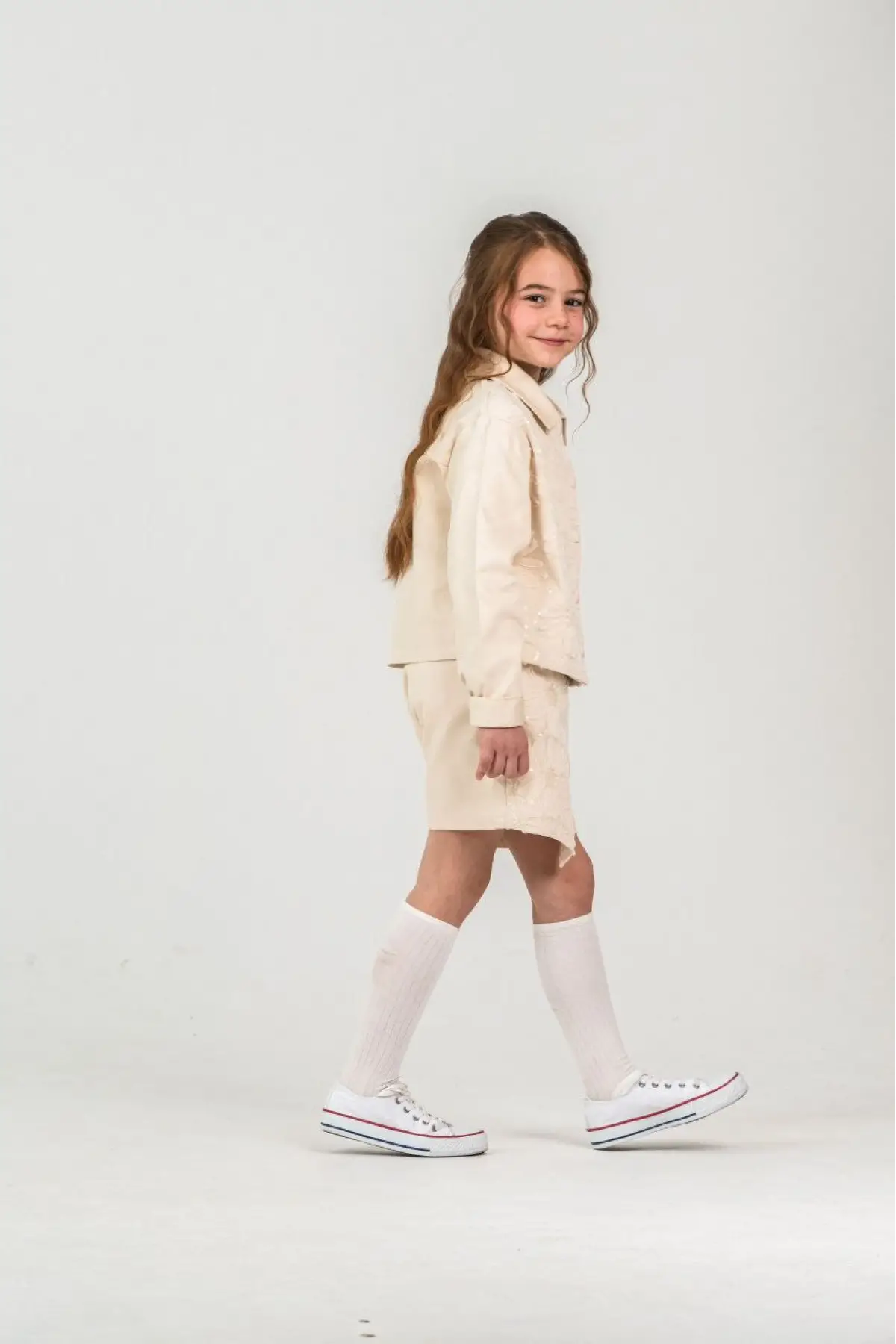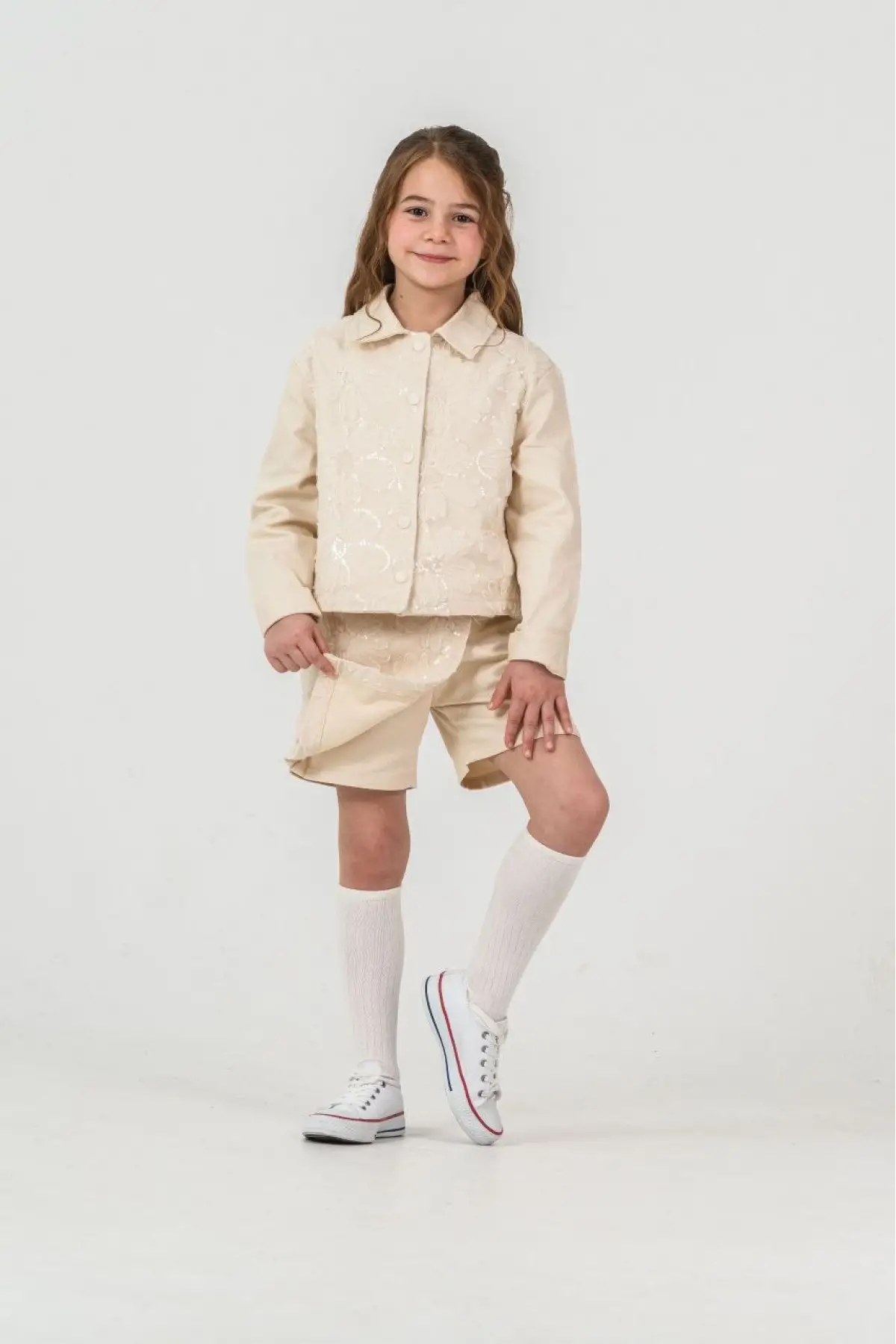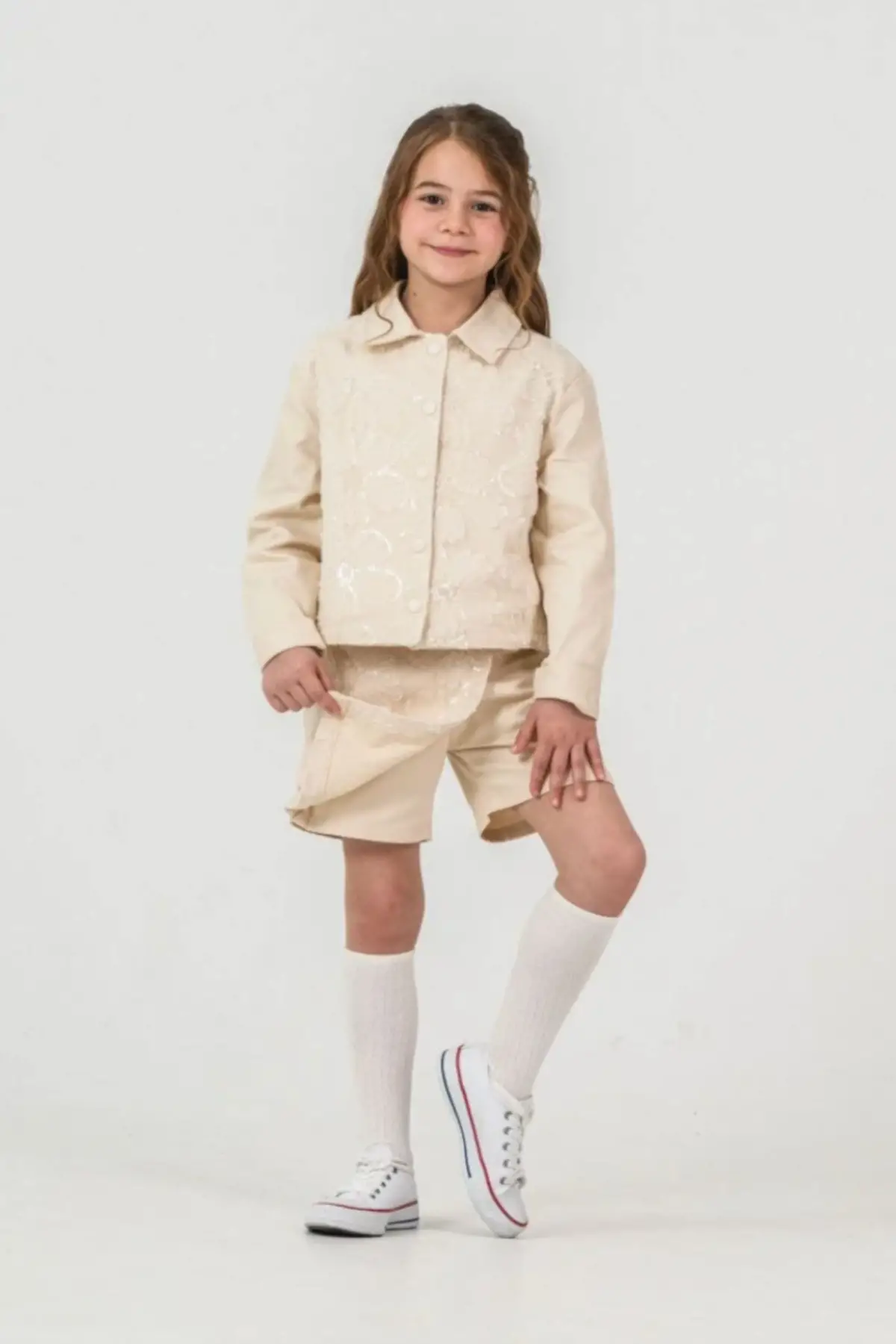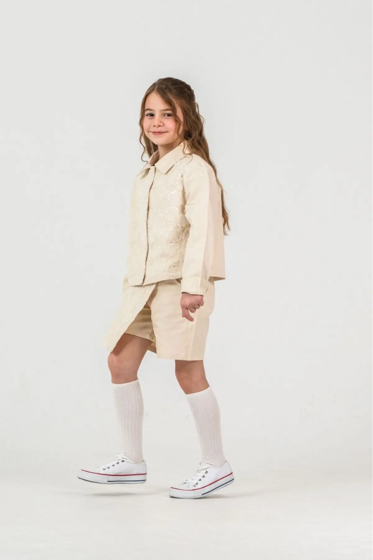 Kız Çocuk Zambak Detaylı Şort Etek Krem Dokuma Takım
