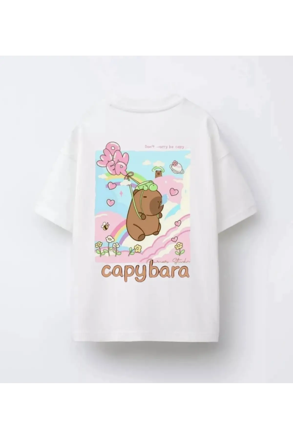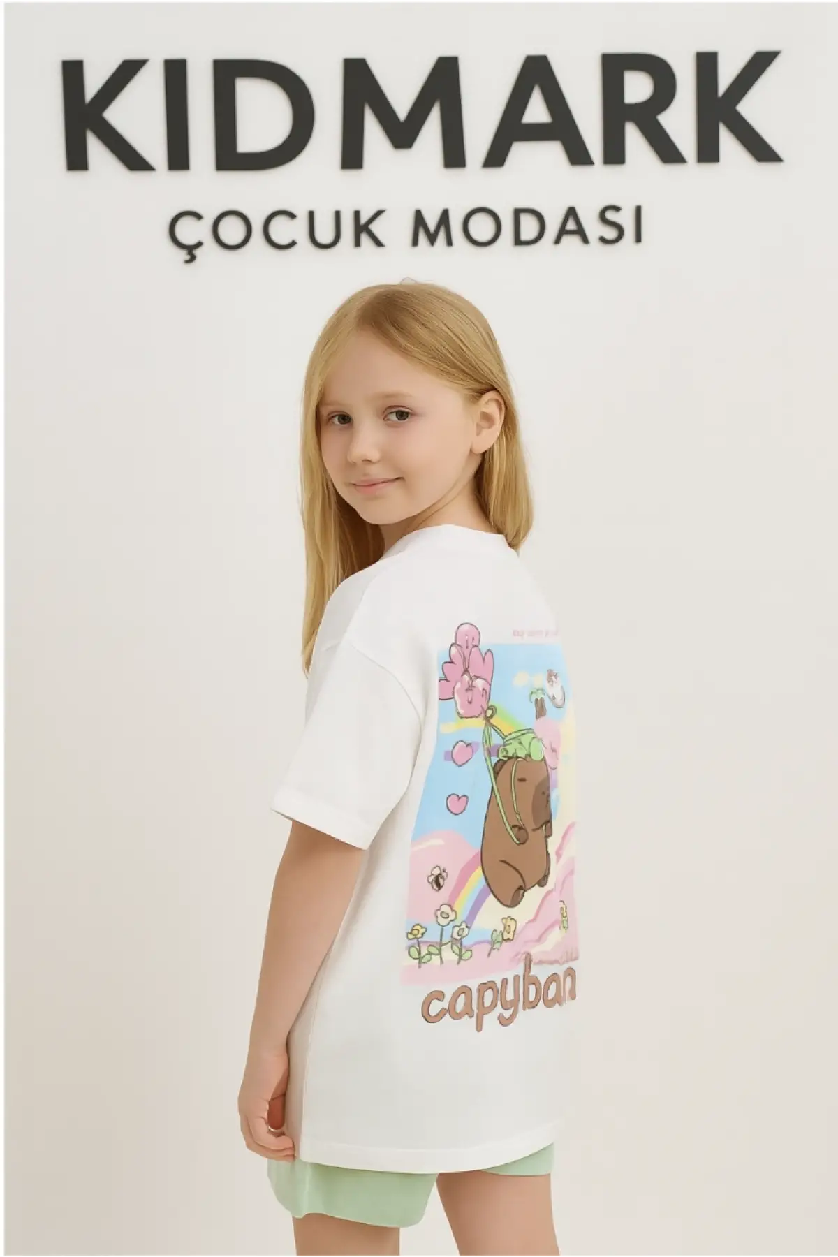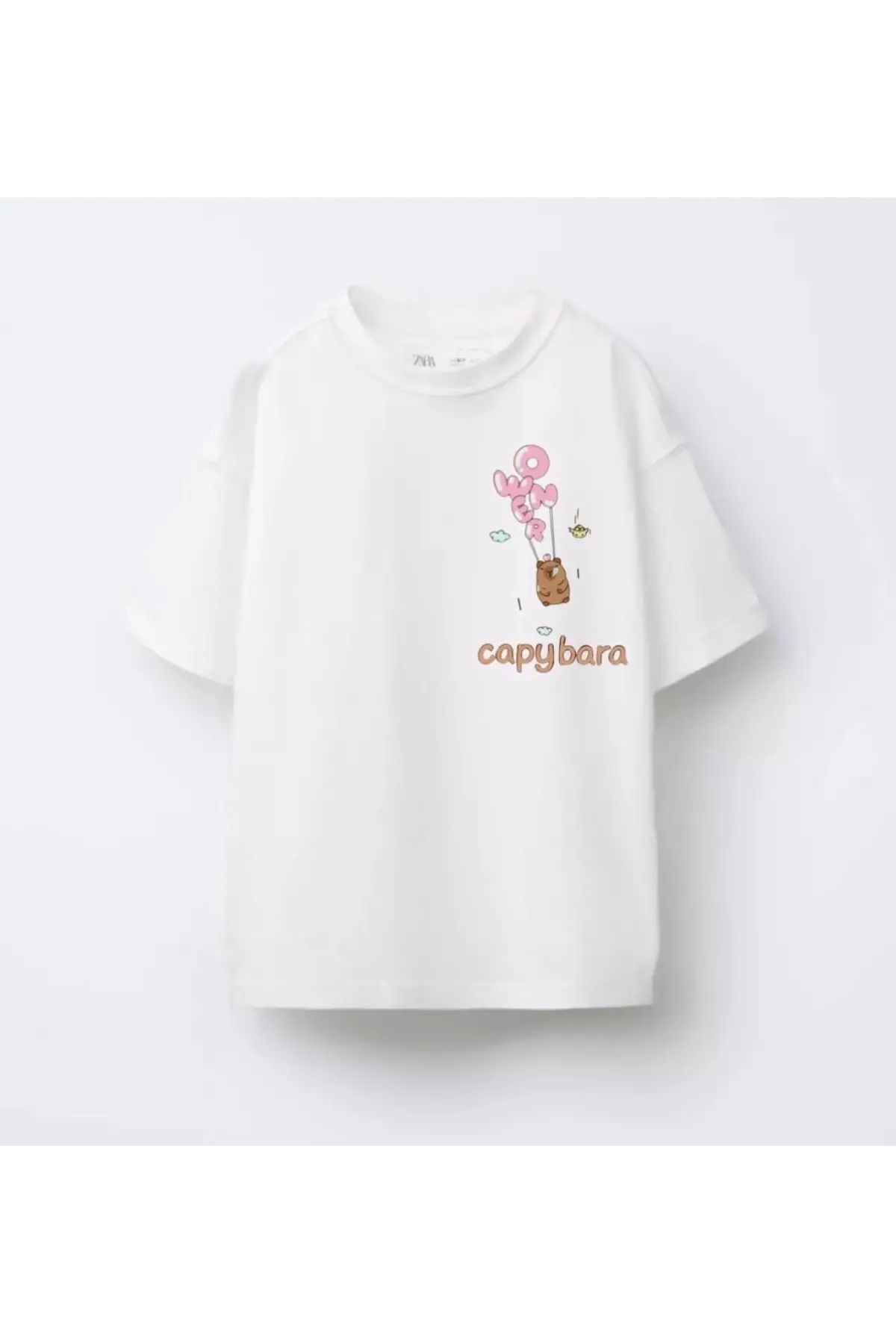 Kız Çocuk Kapibara Baskılı Beyaz Tişört