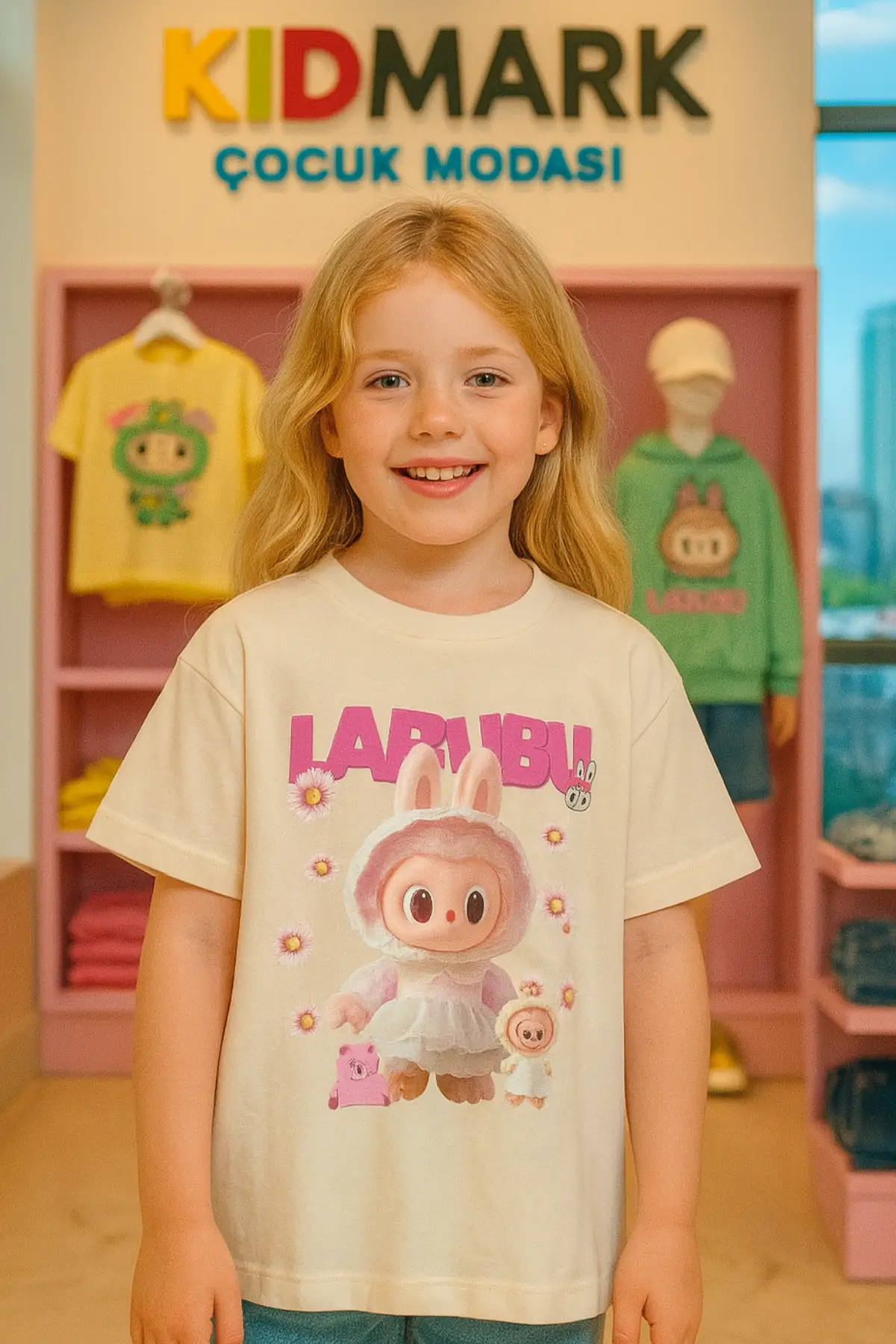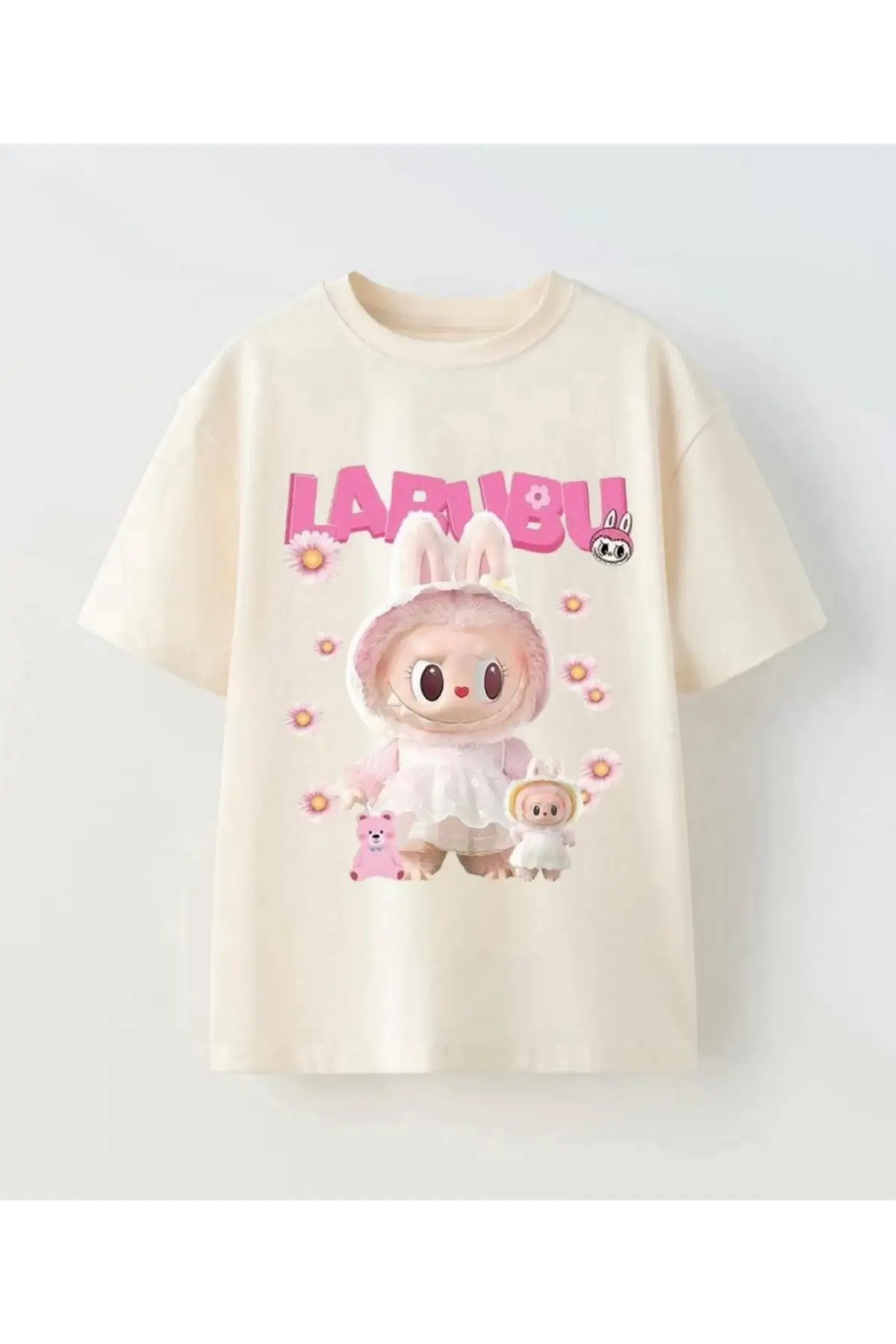 Kız Çocuk Labubu Baskılı Krem Tişört