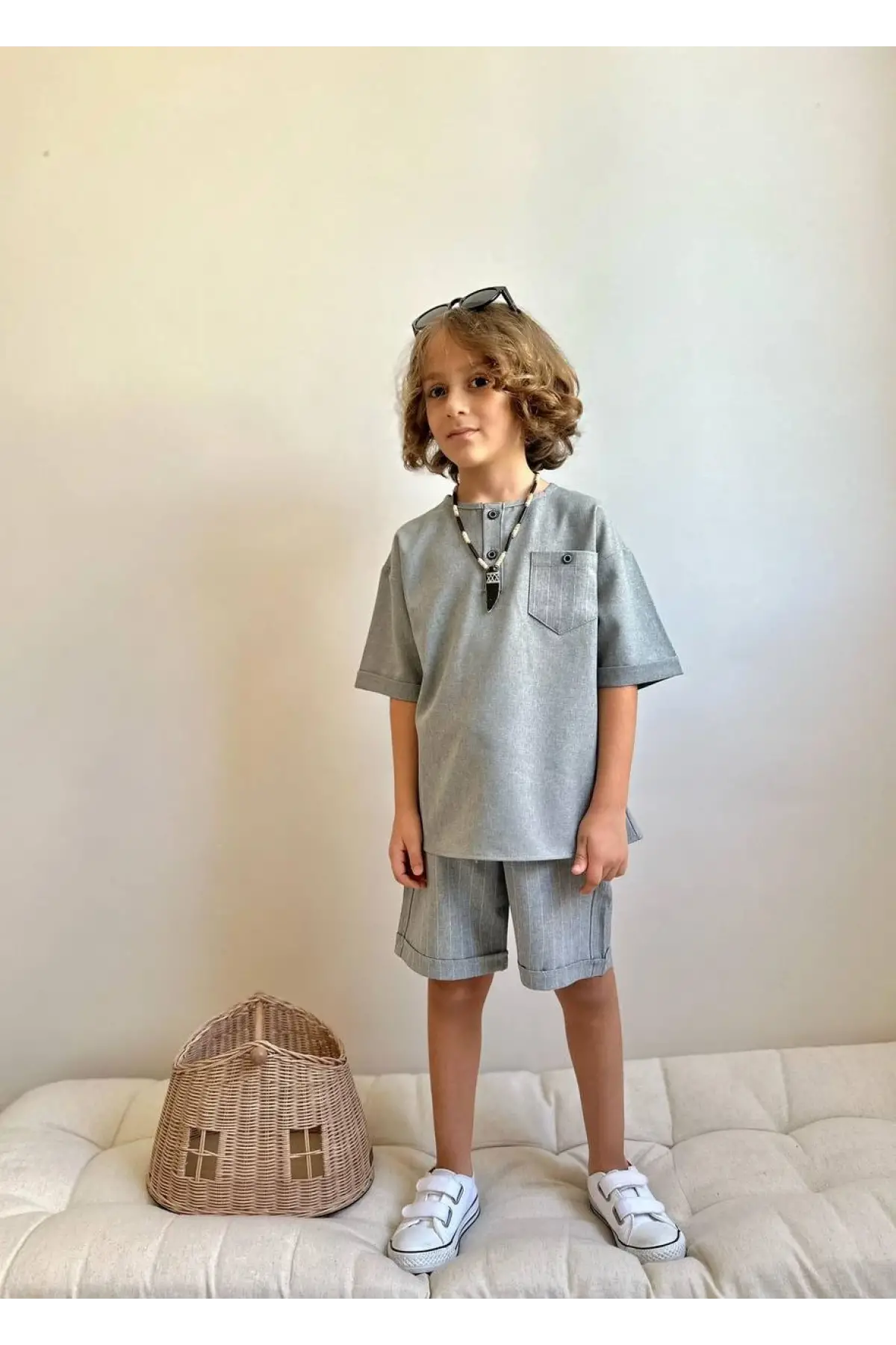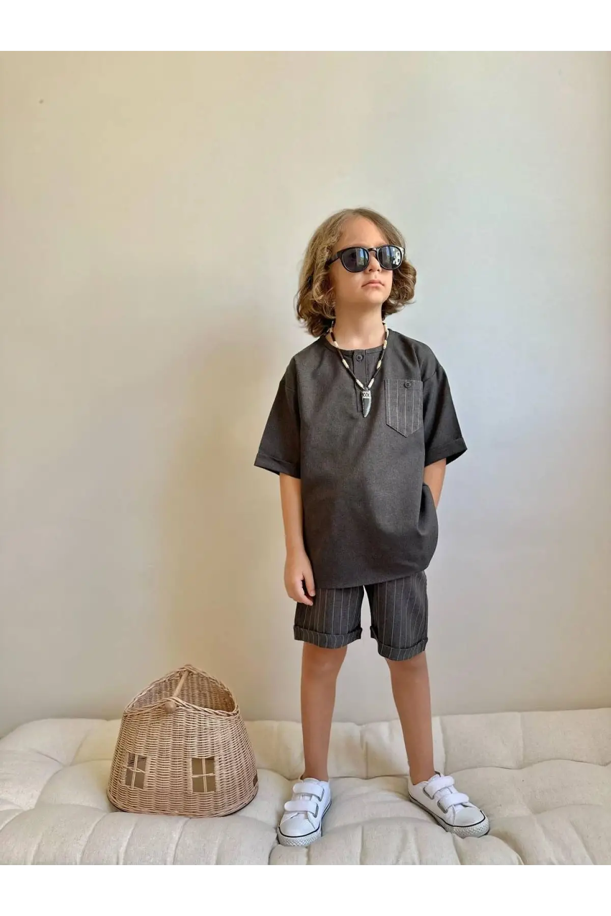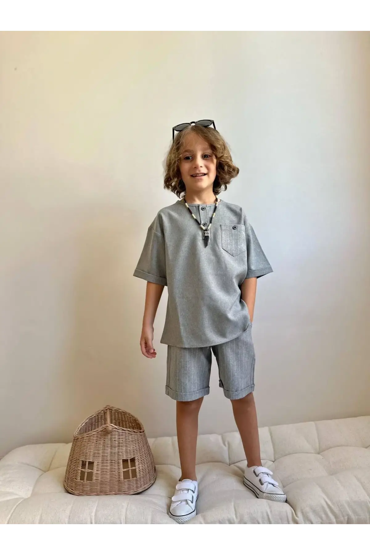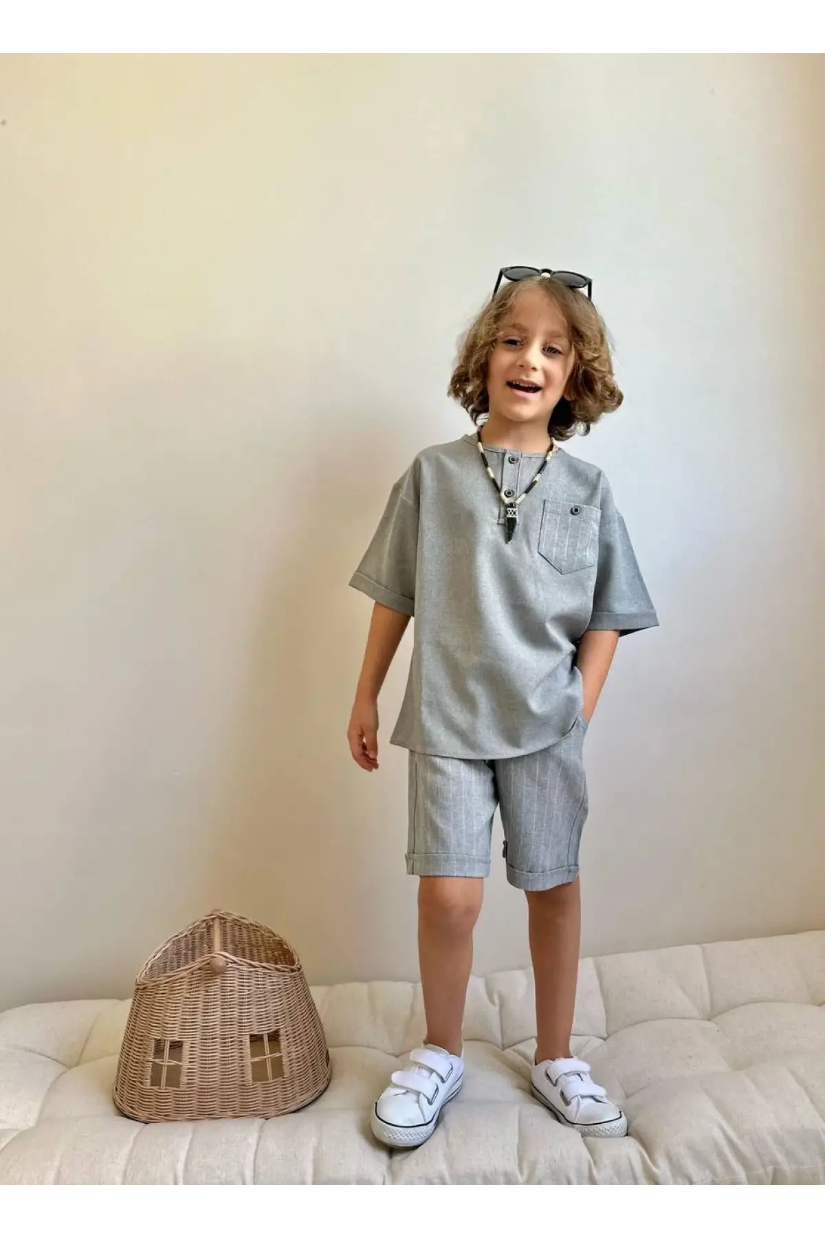 Erkek Çocuk Çizgili Cep Detaylı Gri Keten Takım