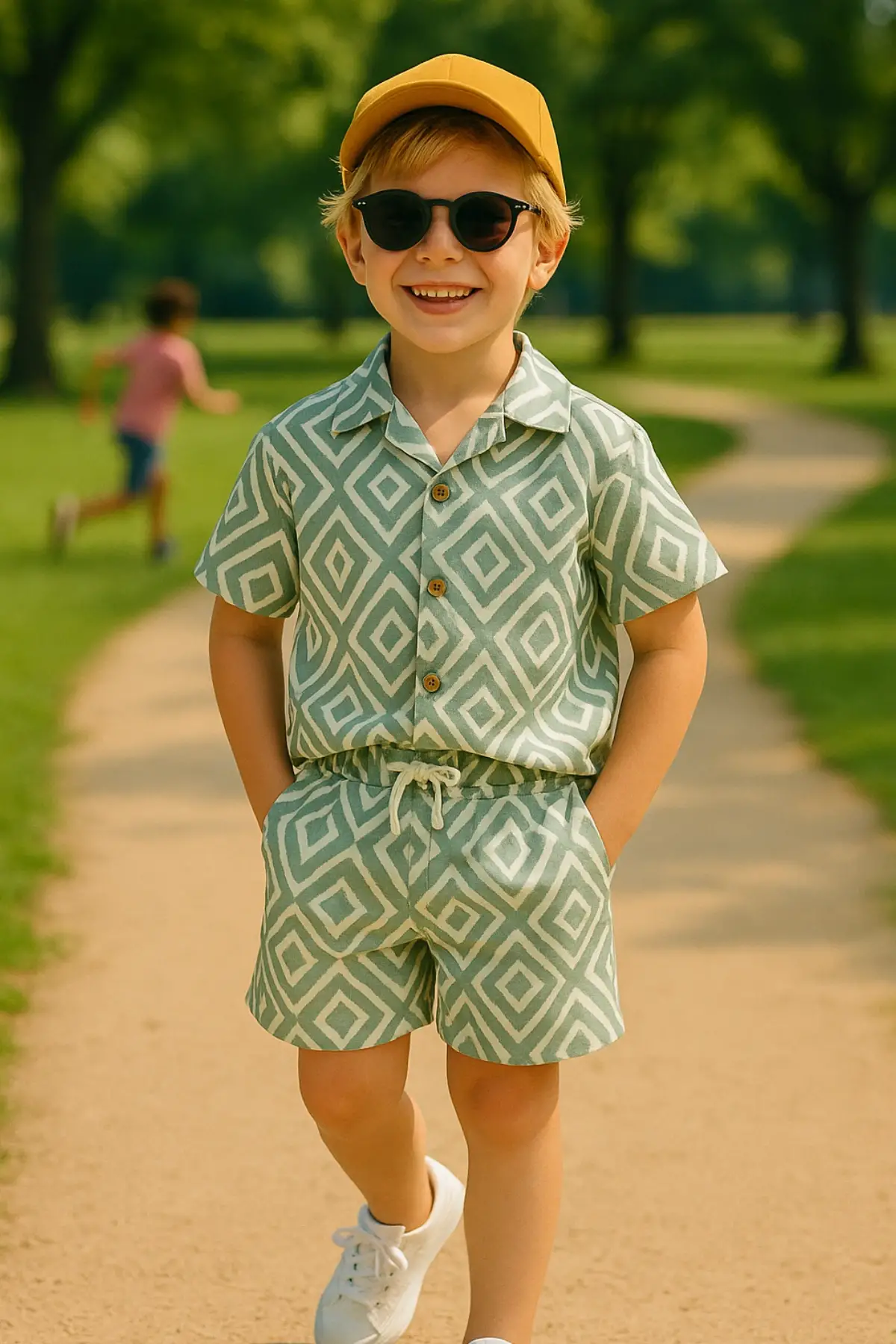 Erkek Çocuk Baklava Desenli Keten Takım