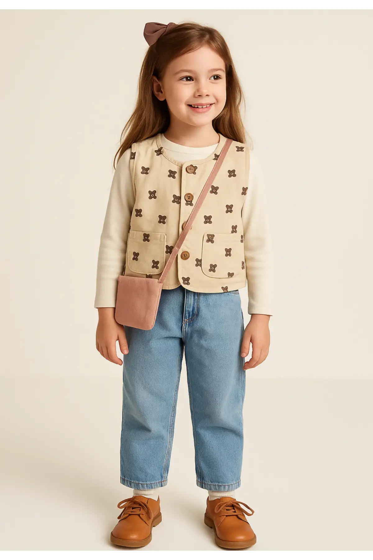 Çocuk Unisex Ayıcık Detaylı Bej Kot yelek